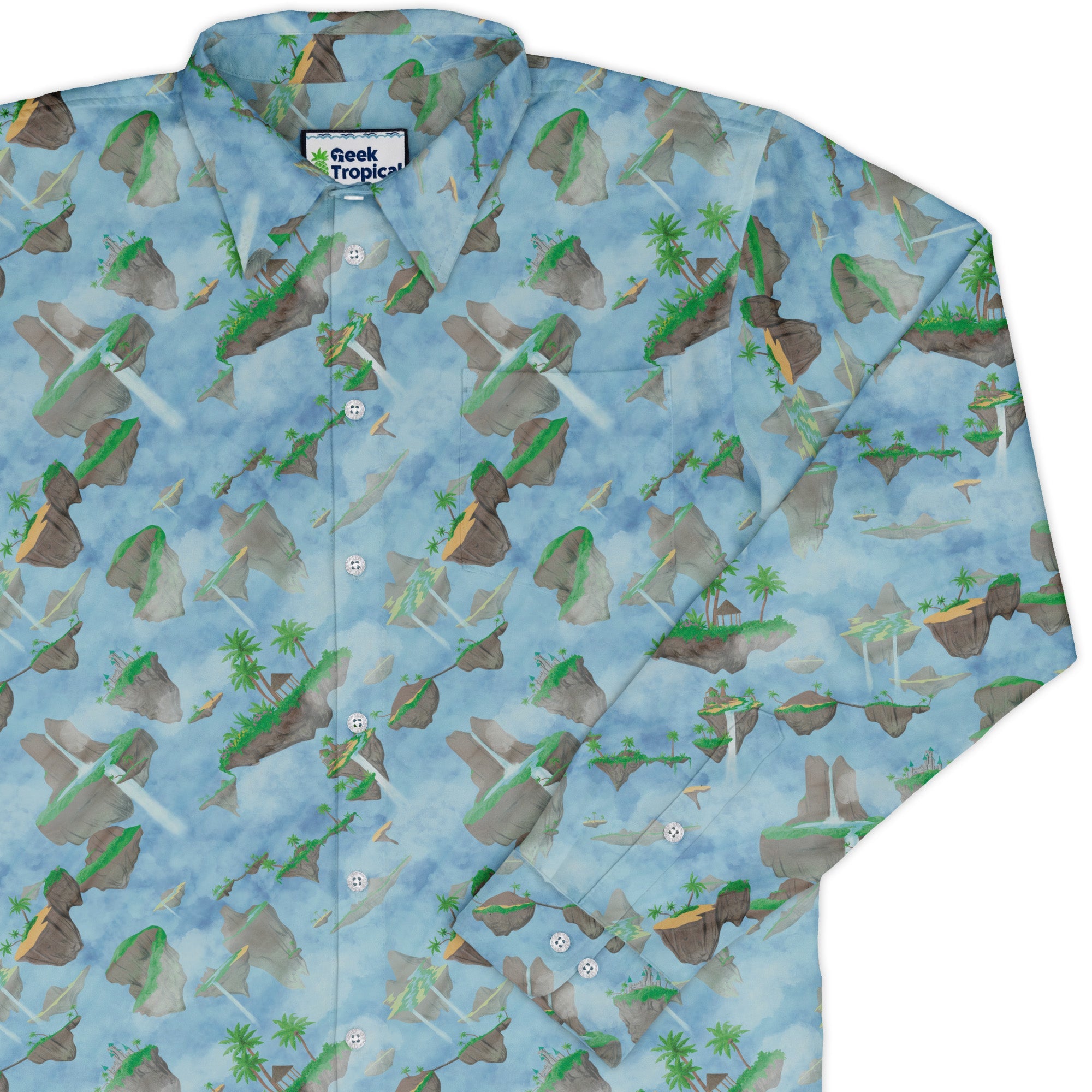 Level up your look with the Fantasy Floating Isles Dnd Long Sleeve Button Up Shirt. Designed by Nathan, the artwork drifts through a sky of hovering islands, rocky outcrops, and soft cloud layers, forming a seamless panorama that aligns across the chest and pocket. Smooth, breathable comfort meets sharp button-up polish, and eco-conscious inks keep the magic modern—supporting licensed artists with every wear.