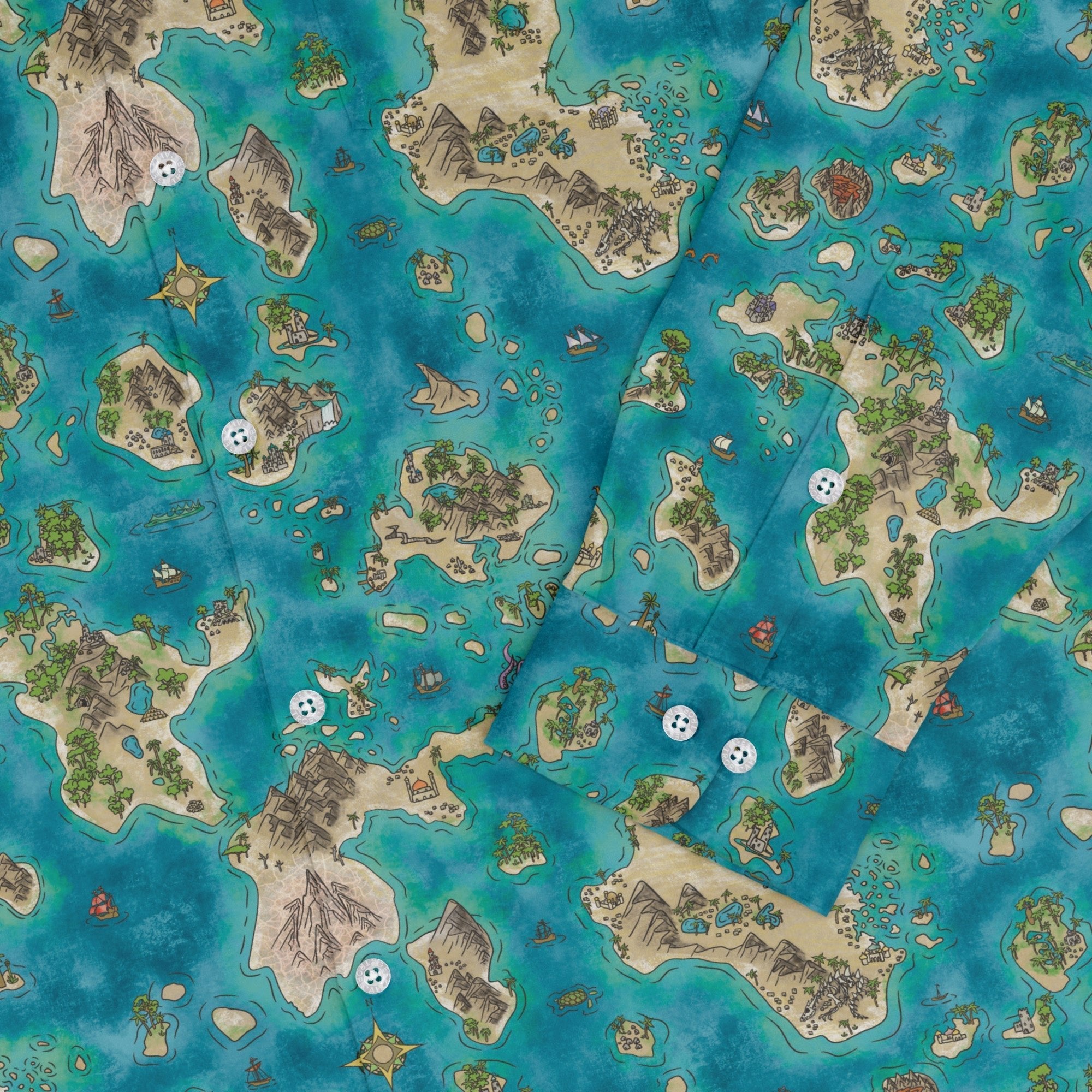 The Fantasy World Map Dnd Long Sleeve Button Up Shirt charts your next quest in wearable cartography, with a seamless map print that flows across the front and pocket. Designed by Nathan, the crisp linework and earthy tones read like a traveler’s atlas—equally ready for game night or casual Fridays. Soft, breathable, and easy to move in, it buttons up clean with branded details and is printed with eco-conscious inks to support licensed artists.