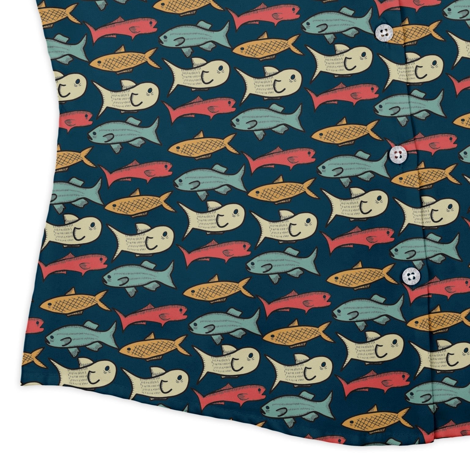 Meet the Fish Flow Curvy Button Up Shirt, a marine-biology love letter for your wardrobe. Heather Davenport’s artwork sends sleek schools of fish gliding in hypnotic currents, with the print aligning smoothly across the placket and pocket for a seamless, nerd-chic finish. A curve-loving silhouette keeps it comfy and polished whether untucked or layered. Finished with distinctive buttons and eco-friendly inks—geeky style backed by real artists.