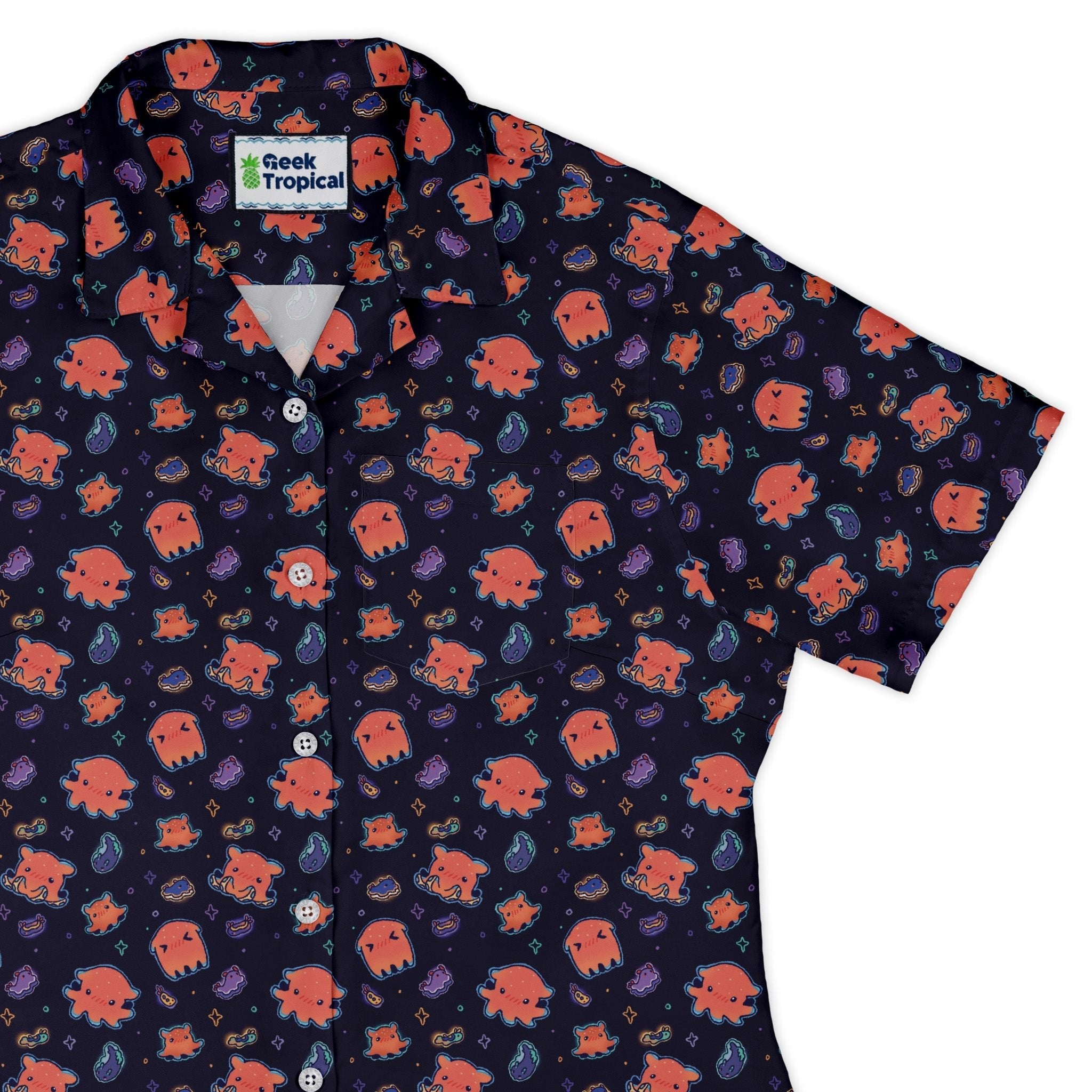 Make a splash in the Flapjack Octopus Anime Curvy Button Up Shirt. Designed by Ardi Tong, this all-over print serves up a cheerful swarm of anime-style flapjack octos—round, squishy, and full of personality. The curvy cut shapes beautifully with a tidy untucked hem and adjustable sleeves, while the pattern aligns across the pocket for a seamless look. Printed with eco-conscious inks and proudly artist-backed—ideal for marine-biology nerds and anime fans alike.