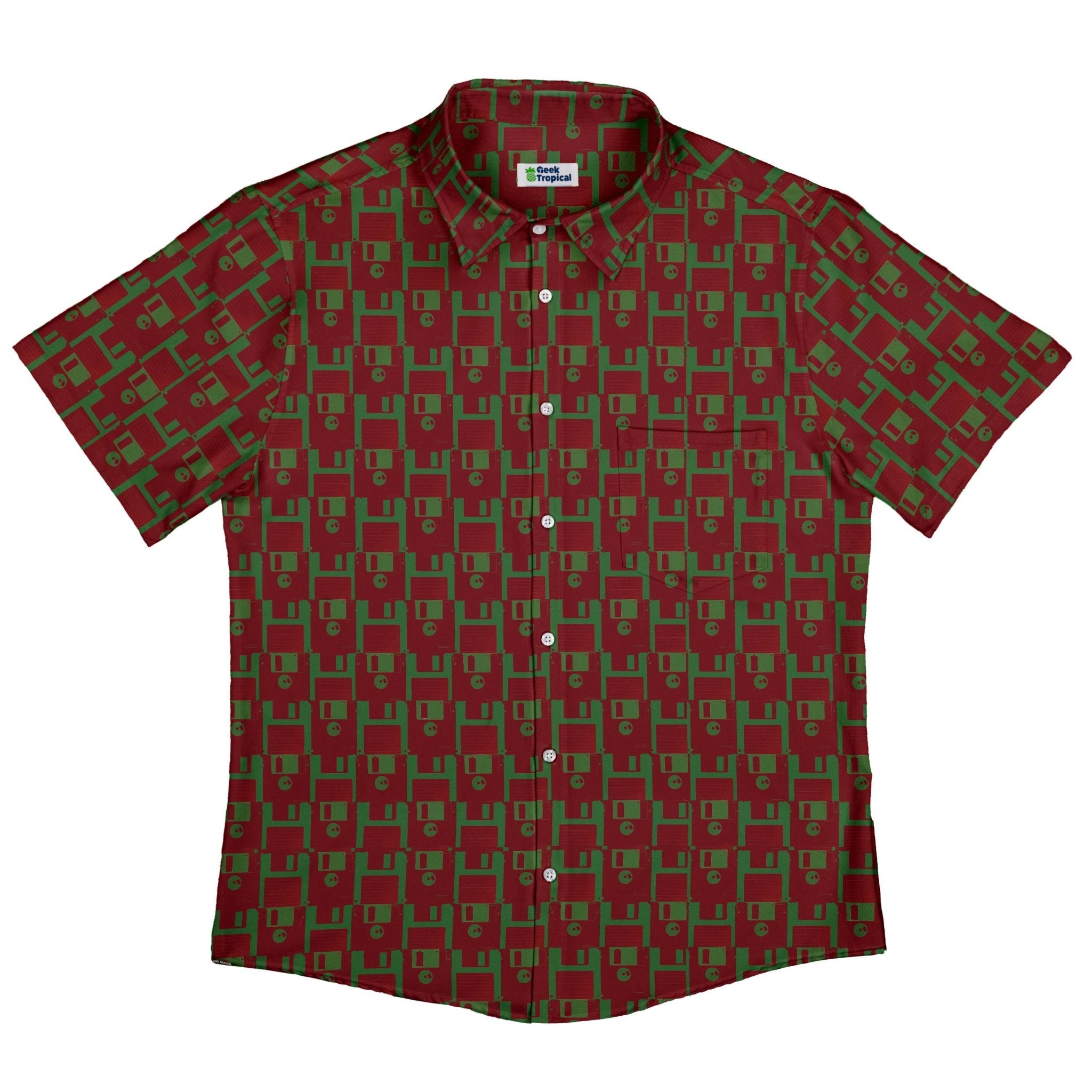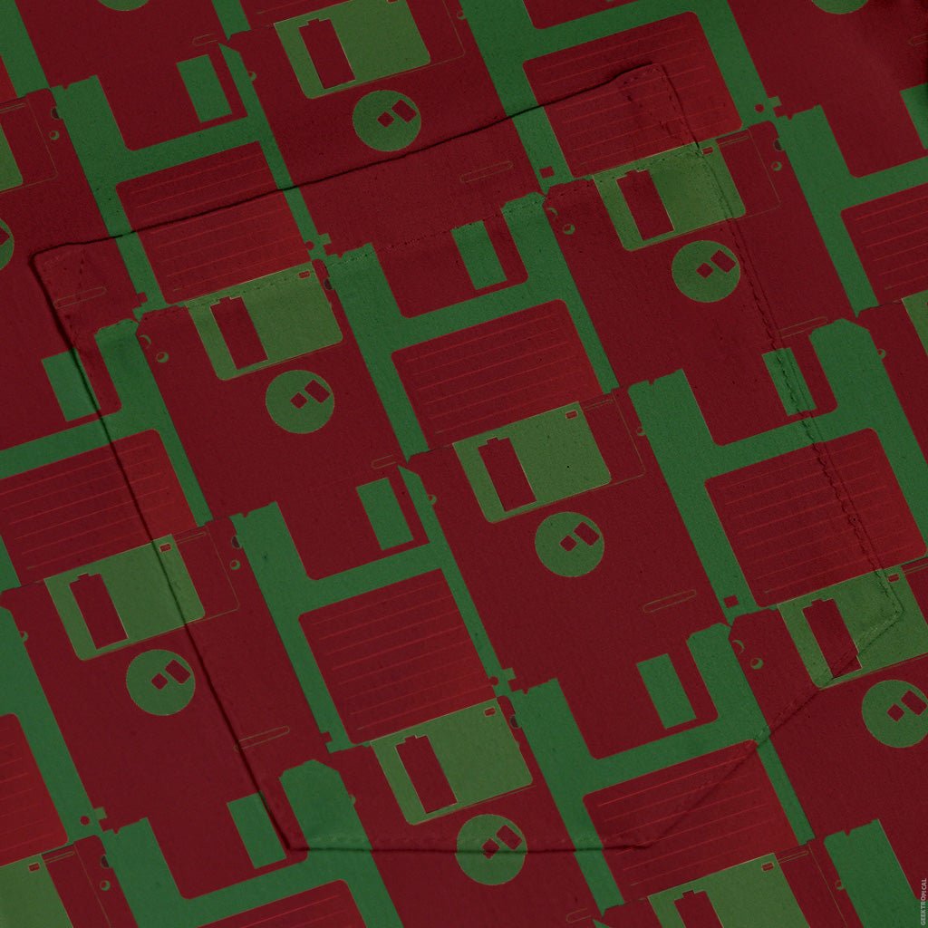 Meet the Floppy Disk Red and Green Button Up Shirt, a retro-computing flex that reads polished and playfully nerdy. Bold red and green floppy disks pop against a dark backdrop, angled like a cascade of saved files, with crisp detailing and clean linework. Designed by Random Galaxy, this artist-backed print levels up your office fit or con weekend look—smart collar, versatile silhouette, and a pattern that stays sharp from placket to hem.