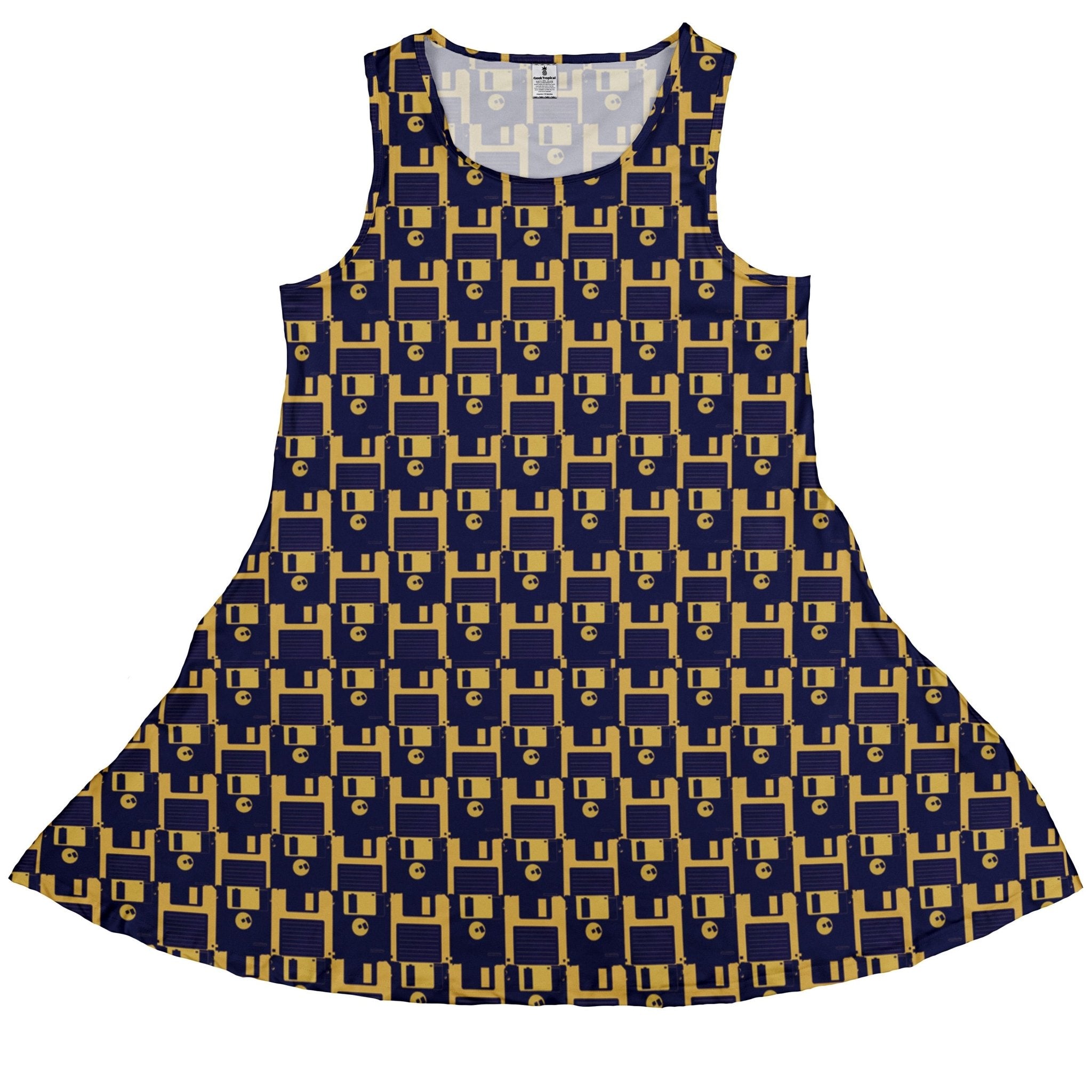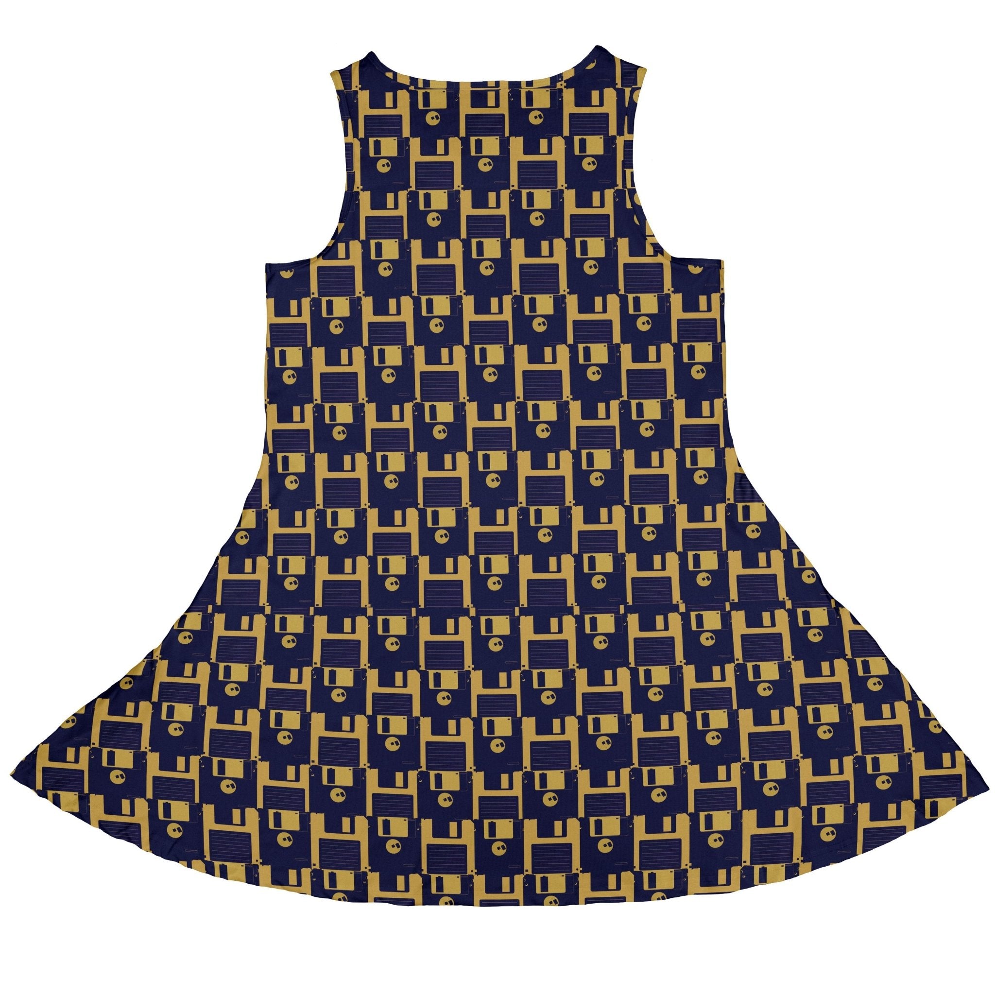 Boot up your style with the Floppy Disk Yellow Blue Dress, a vibrant nod to retro storage. A bold yellow base hosts crisp blue floppy disks in a clean all-over repeat, serving pixel-perfect nostalgia without looking costume-y. Easy, breathable, and polished enough for work or weekend—and yes, there are pockets. Designed by Random Galaxy and proudly artist-backed. Pair with sneakers or boots and log in to everyday cool.