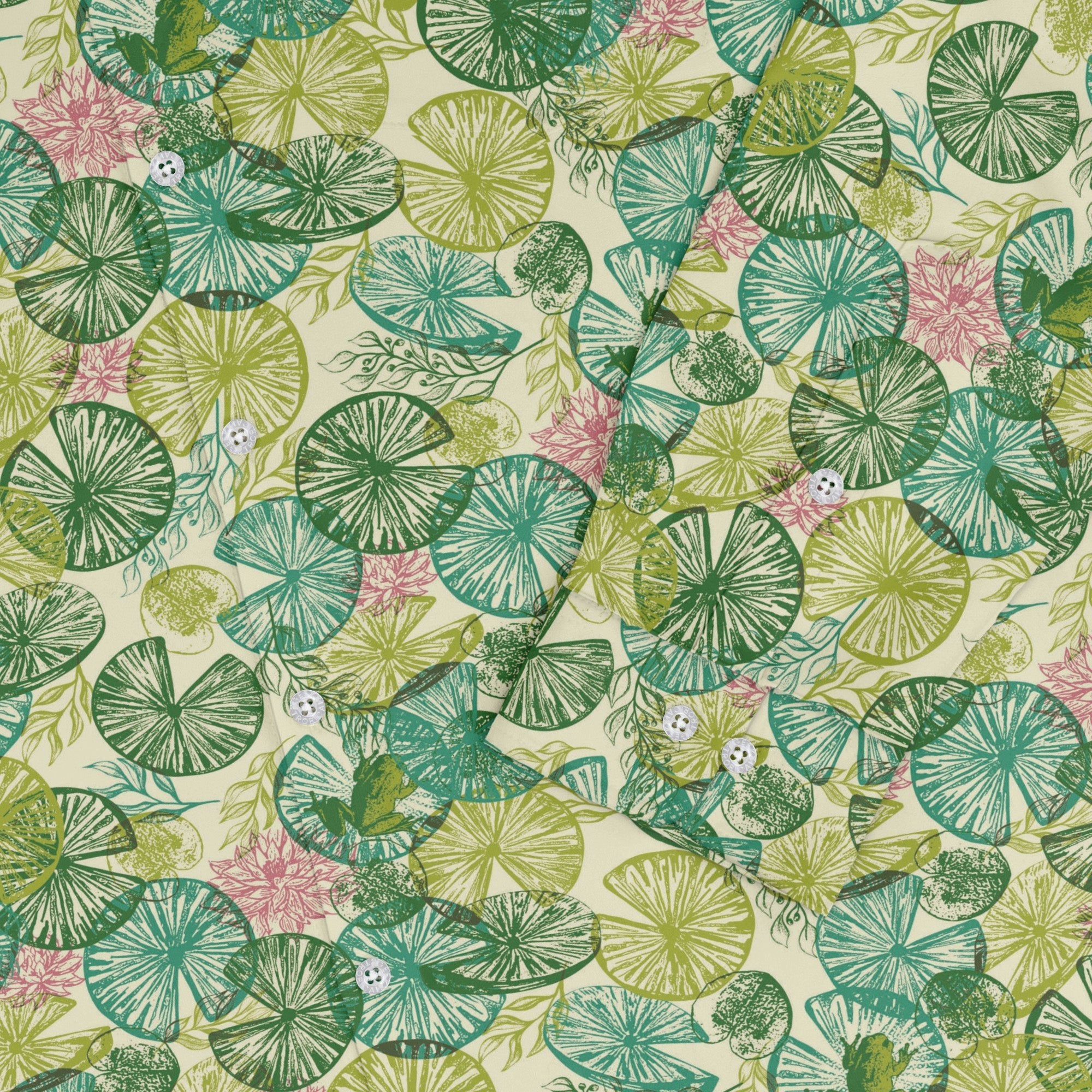 Frog Among Lilies Long Sleeve Button Up Shirt hops from pond‑serene to party‑ready with art by Tobe Fonseca. A curious frog lounges among lily pads and blooms in a tranquil, allover print that aligns cleanly across the placket and pocket. Soft, breathable, and easygoing, this unisex staple brings geeky botanical charm to your rotation. Printed with eco‑conscious inks, and your purchase supports the artist.