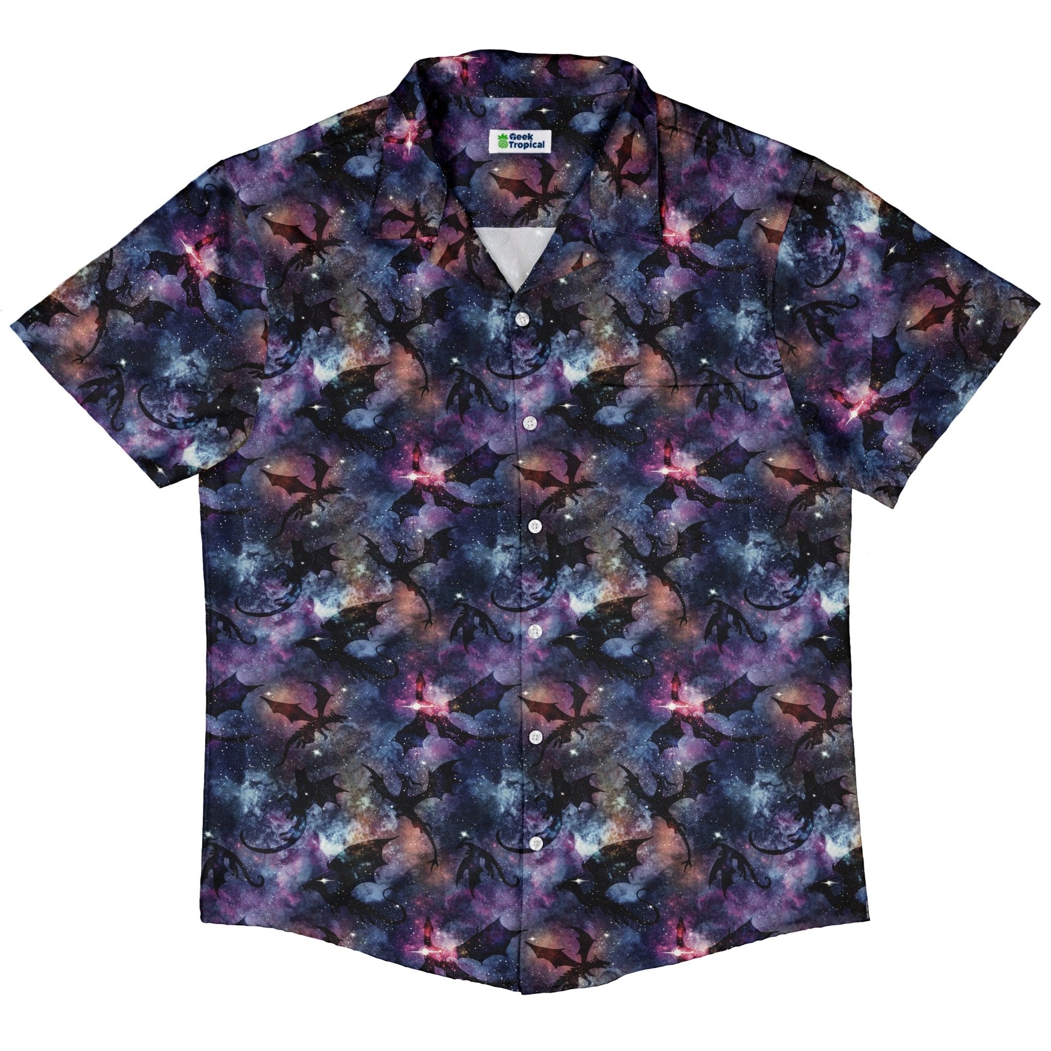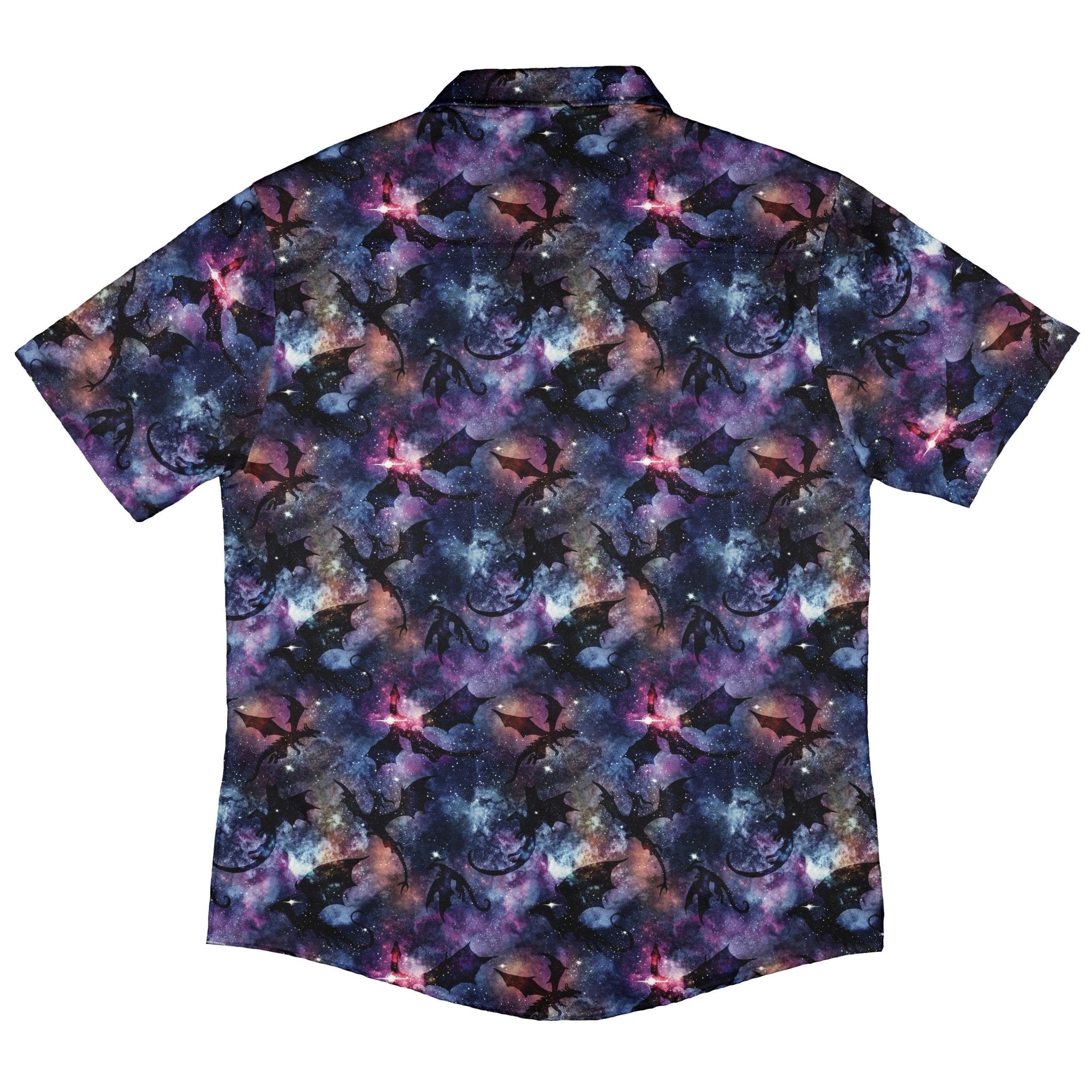 The Galaxy Dragons Purple Button Up Shirt merges myth and starlight: a deep violet galaxy scattered with crisp stars while majestic dragons sweep across the cosmos. Designed by Nathan, the maximalist all-over art glows with layered purples and inky blacks, and the print lines up cleanly across the front and pocket for a seamless look. Ready for cons, casual Fridays, or stargazing dates, it’s geeky elegance with artist-backed, eco-minded swagger.
