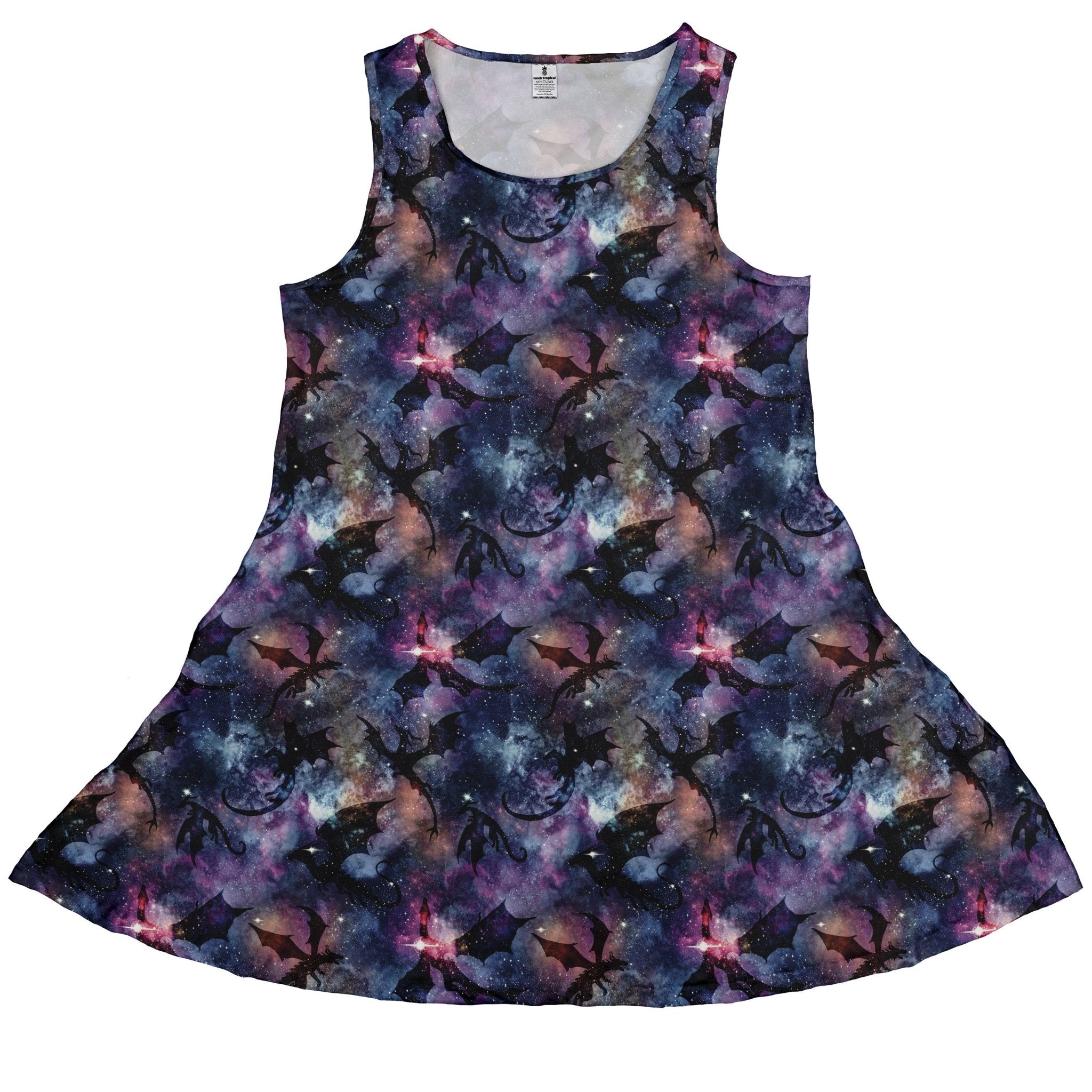 Meet the Galaxy Dragons Purple Dress, your shortcut to cosmic swagger. Vivid violets and midnight purples set the stage for elegant dragons gliding across a star-speckled sky, in a bold, maximalist all-over print designed by Nathan. Soft, easy, and ready for quests or coffee runs, it brings an effortlessly put-together vibe with geeky edge, artist-backed and space approved.
