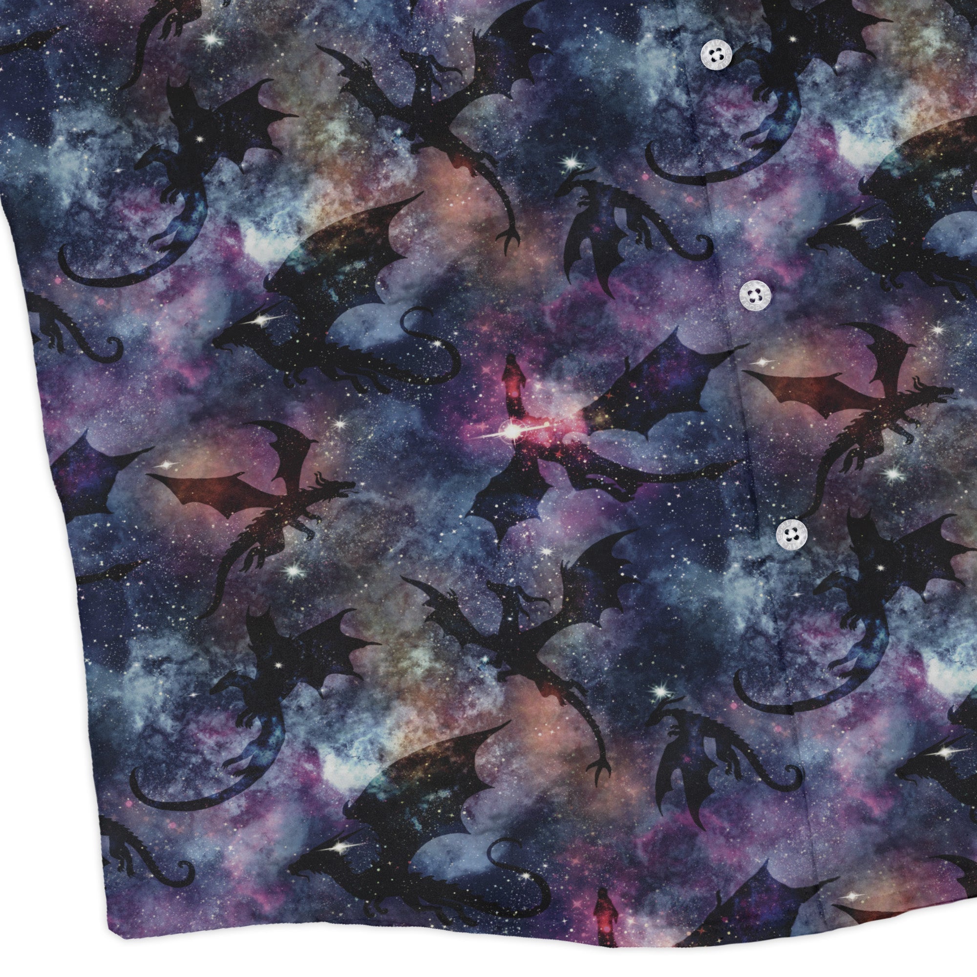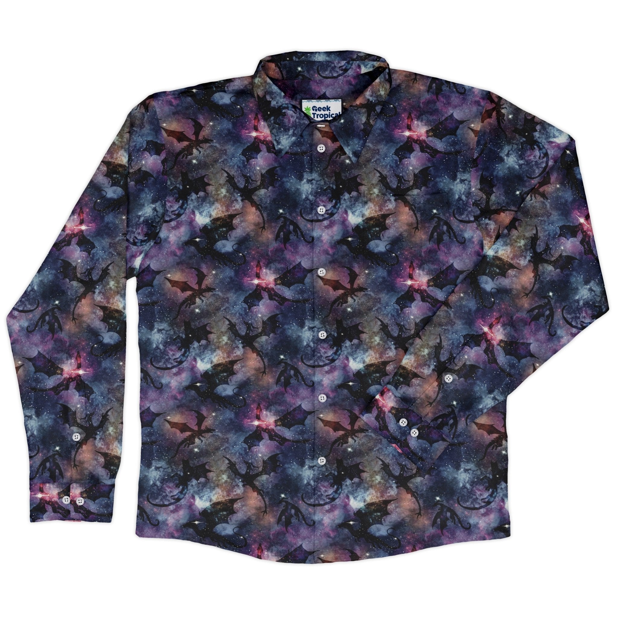 Galaxy Dragons Purple Long Sleeve Button Up Shirt brings cosmic swagger to your wardrobe. Deep violet and indigo skies set the stage as star-forged dragons arc across the fabric, their silhouettes glowing among constellations and nebula clouds. Designed by Nathan, this artist-backed piece feels polished yet playful—office-ready, con-night bold, and eco-conscious. Layer it with denim or wear solo; either way, the print does the talking.