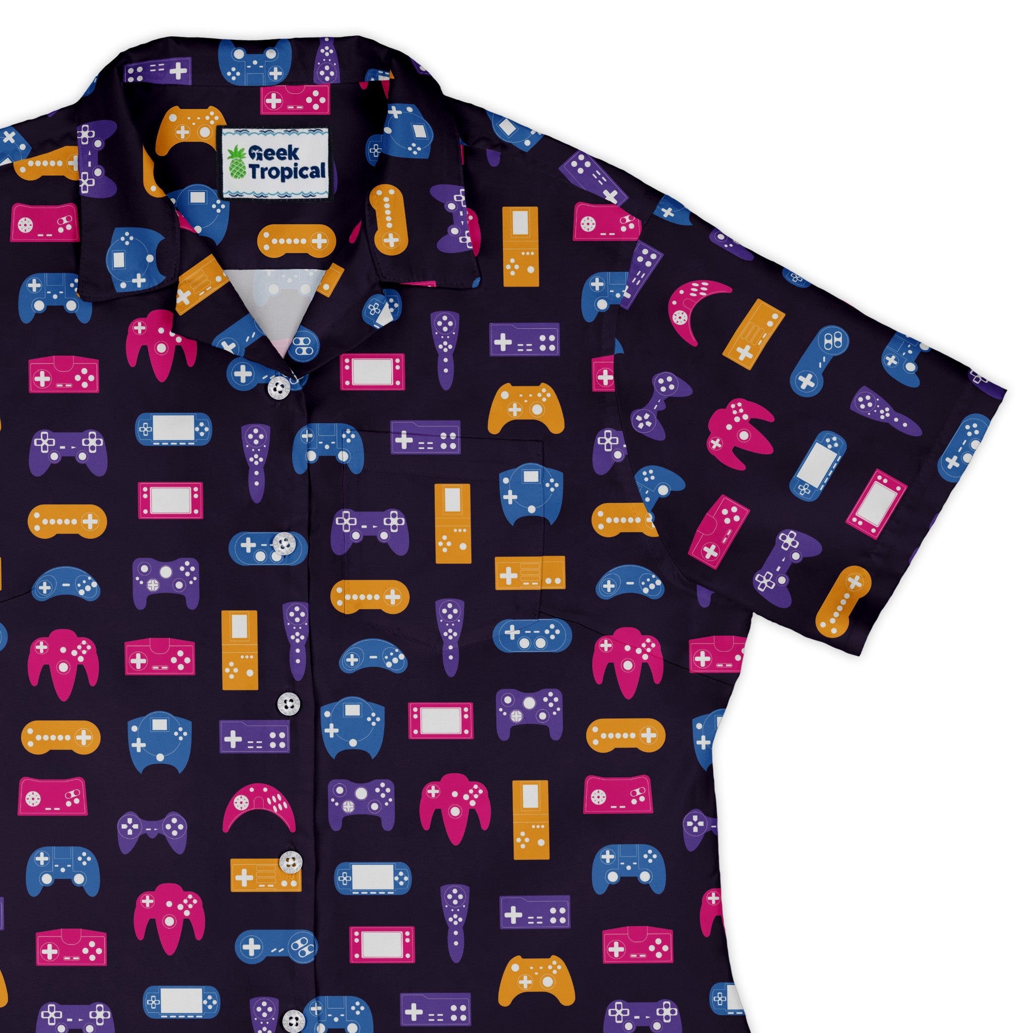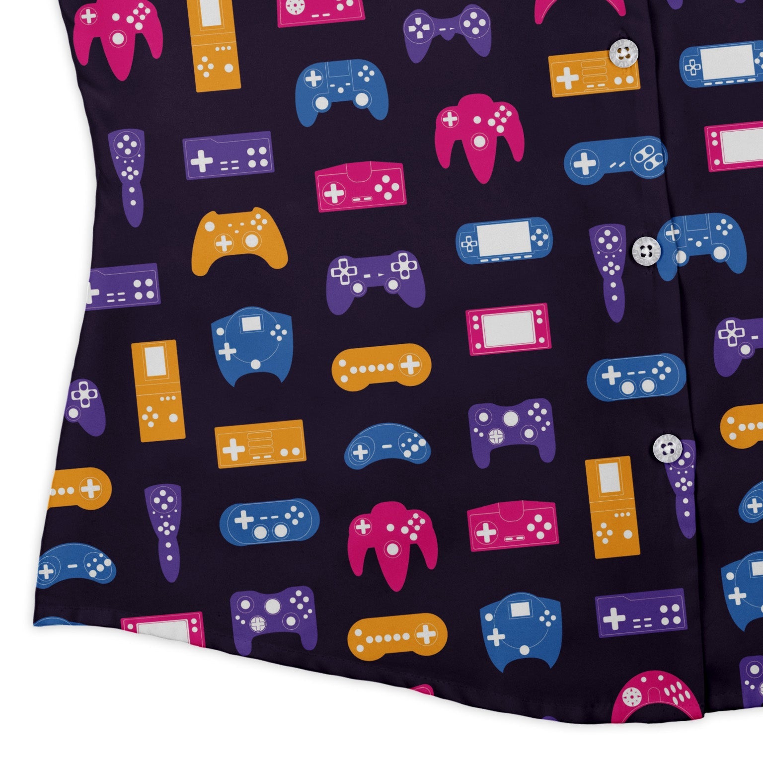 Level up your office-to-arcade look with the Game Controllers Purple Video Game Curvy Button Up Shirt. A rich purple base pops with crisp controller icons, and the pattern lines up across the pocket for a seamless look. Designed for women who like a curvy, confident fit with an easy untucked hem. Adjustable sleeves and lightweight, moisture-wicking softness keep you comfy all day. Branded buttons, eco-friendly inks, and artist-backed style finish it.