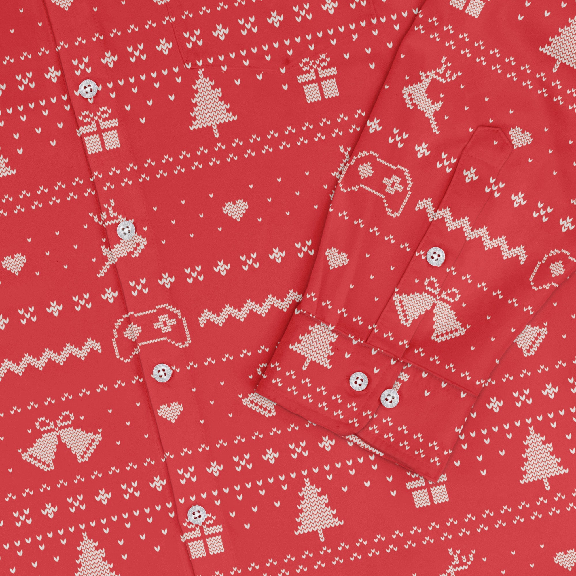 Level up holiday style with the Gamer Christmas Sweater Long Sleeve Button Up Shirt. A festive all‑over print channels classic 8‑bit sweater vibes—retro arcade icons meet pixel holiday motifs—lined up cleanly across the placket and chest pocket for a polished look. Designed by Tobe Fonseca, it blends playful geek energy with buttoned-up ease from office party to game night, supporting the artists who power your fandom.