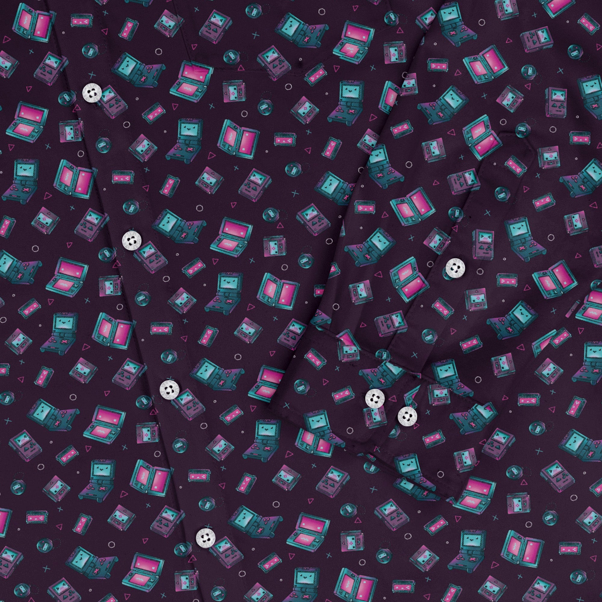 Gaming Consoles Anime Purple Long Sleeve Button Up Shirt brings bold arcade energy to your wardrobe with a rich violet all-over print of console silhouettes and anime-inspired graphics. The artwork flows cleanly across the chest and pocket for a seamless look, finished with sharp buttons and tidy cuffs. Designed by Ardi Tong and printed with eco-conscious inks, it’s equally at home at cons, casual Fridays, and late-night boss battles. Pair it with denim or layer under a blazer.