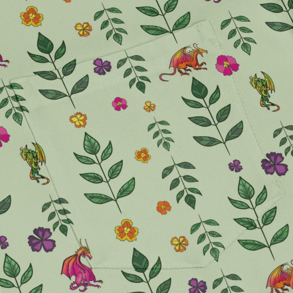 Meet the Garden Dragons Fantasy Long Sleeve Button Up Shirt, your ticket to a lush, geek-chic menagerie. Rose Khan’s artwork sets miniature dragons gliding through tropical leaves and garden blooms, rendered in crisp, vibrant detail. The print flows cleanly across the placket and pocket for a seamless look, while the fabric stays soft and cool. Printed with eco-conscious inks and artist-backed, this is fantasy you can wear to brunch or the boss fight.