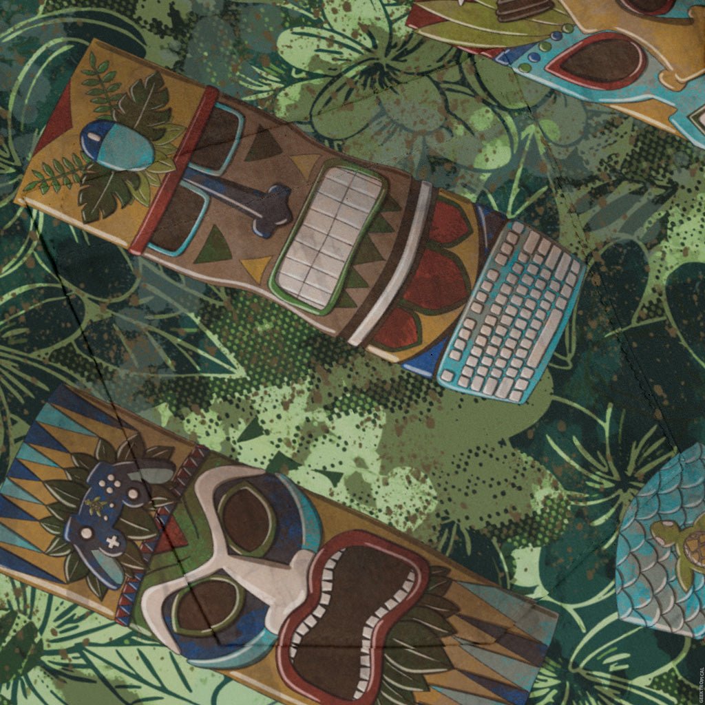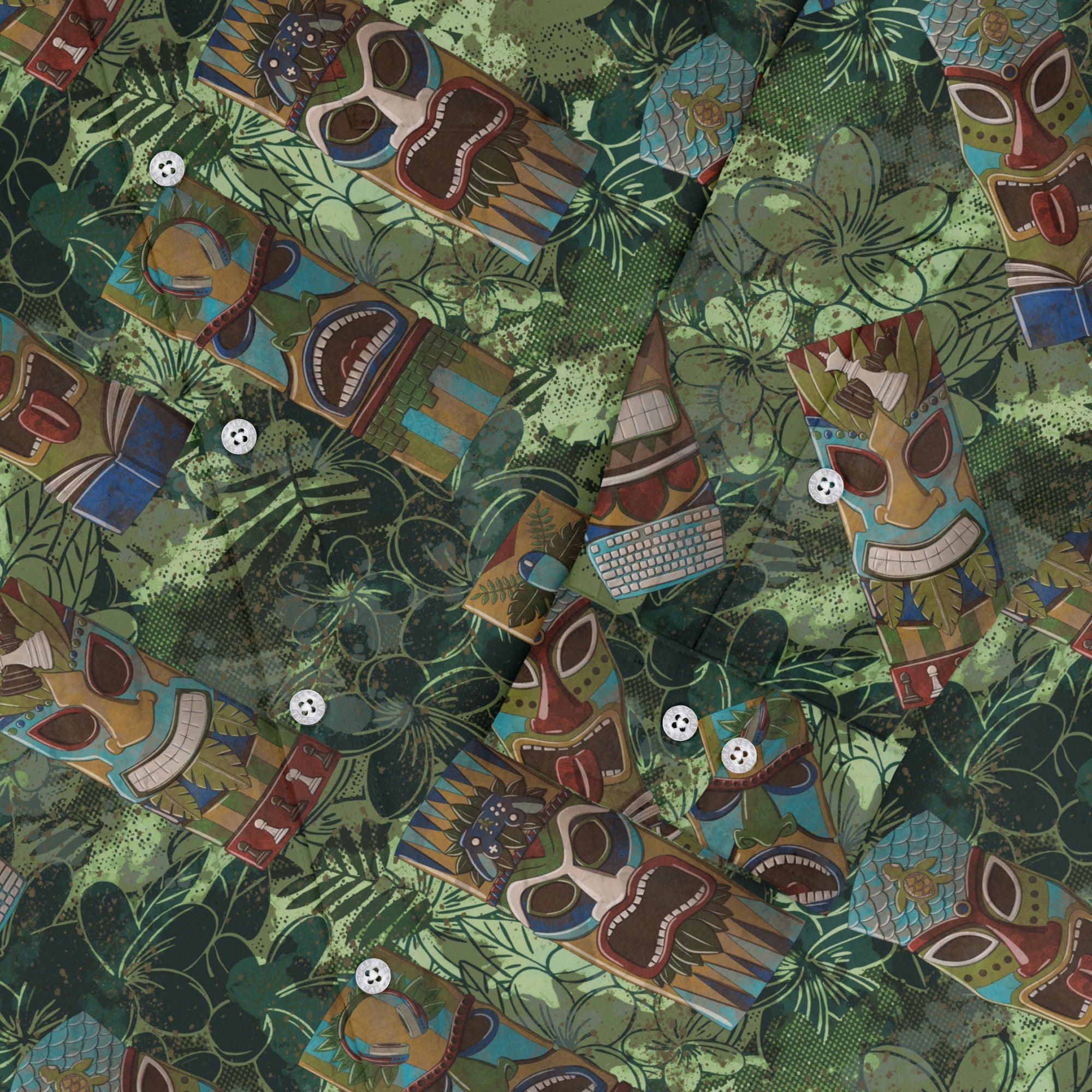 The Geek Tiki Masks Light Green Long Sleeve Button Up Shirt brings island vibes to your nerd core. On a breezy light-green canvas, bold tiki masks repeat in crisp, symmetrical rows with tropical motifs, pattern-matched over the chest pocket and placket for a clean finish. Arcade-influenced linework gives it sly retro-geek energy. Designed by Nathan and printed with eco-friendly inks, it’s smart, playful, and ready for late-night campaigns or beachy boardwalks.