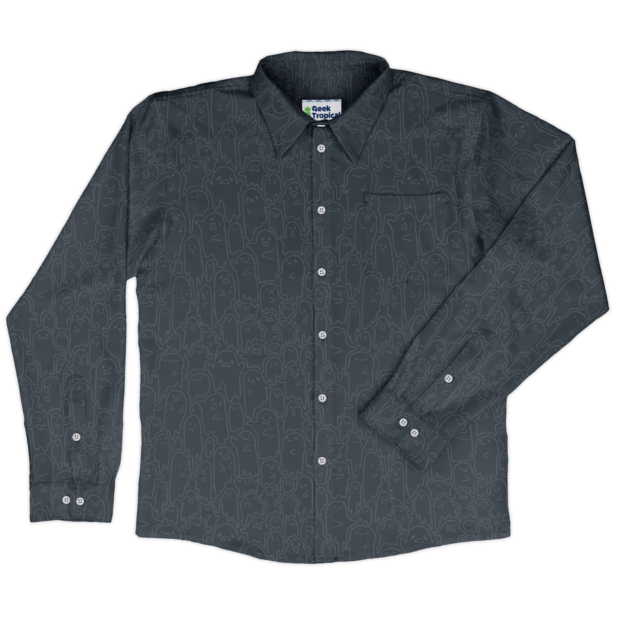The Ghost Wall Charcoal Blue Long Sleeve Button Up Shirt channels quiet haunt-core: shadowy charcoal and deep blue tones with a ghostly allover pattern that feels like apparitions drifting across a midnight wall. Seam-matched art flows cleanly over the front and pocket for a slick finish. Designed by Ardi Tong and printed with eco-conscious inks, this easy unisex staple supports licensed artists.