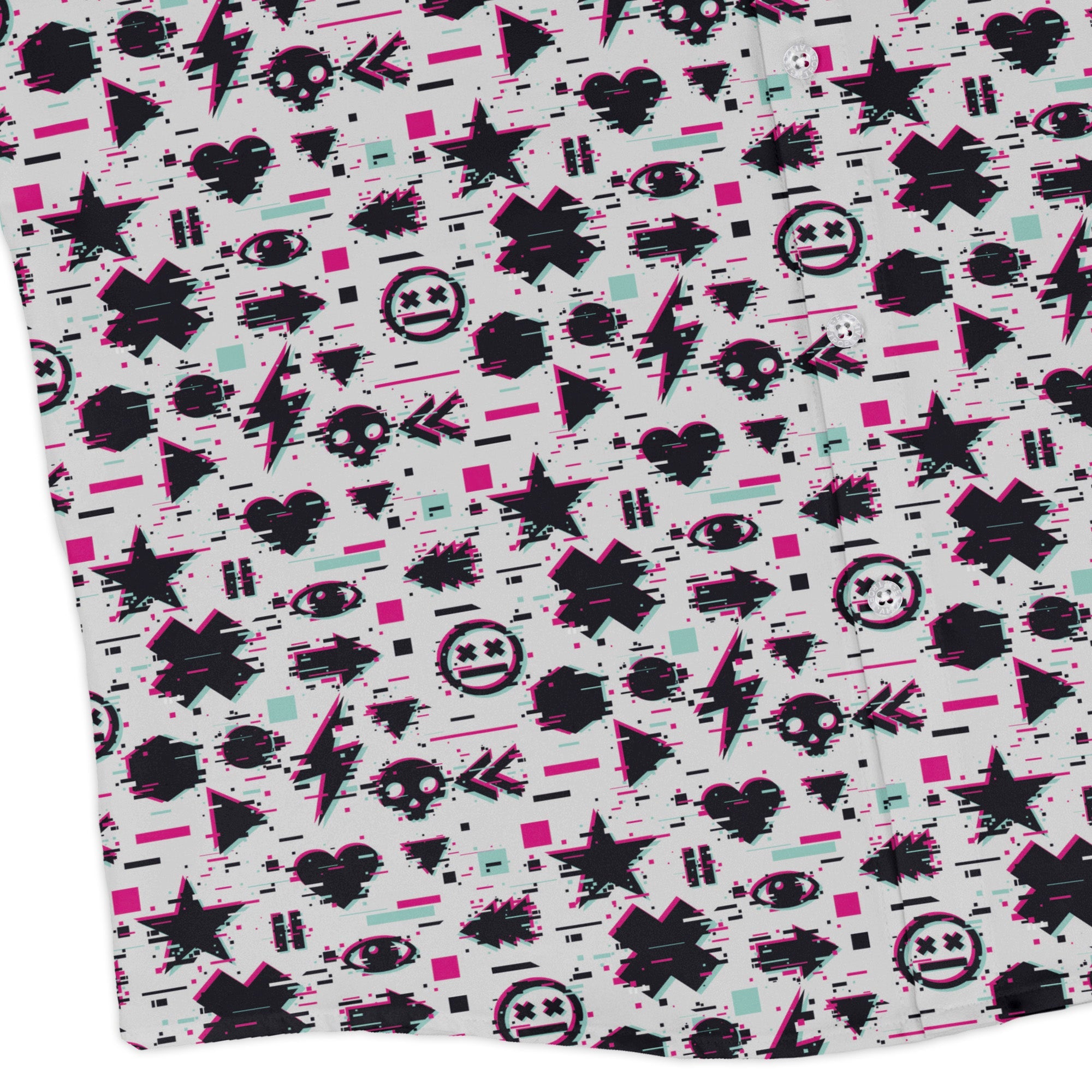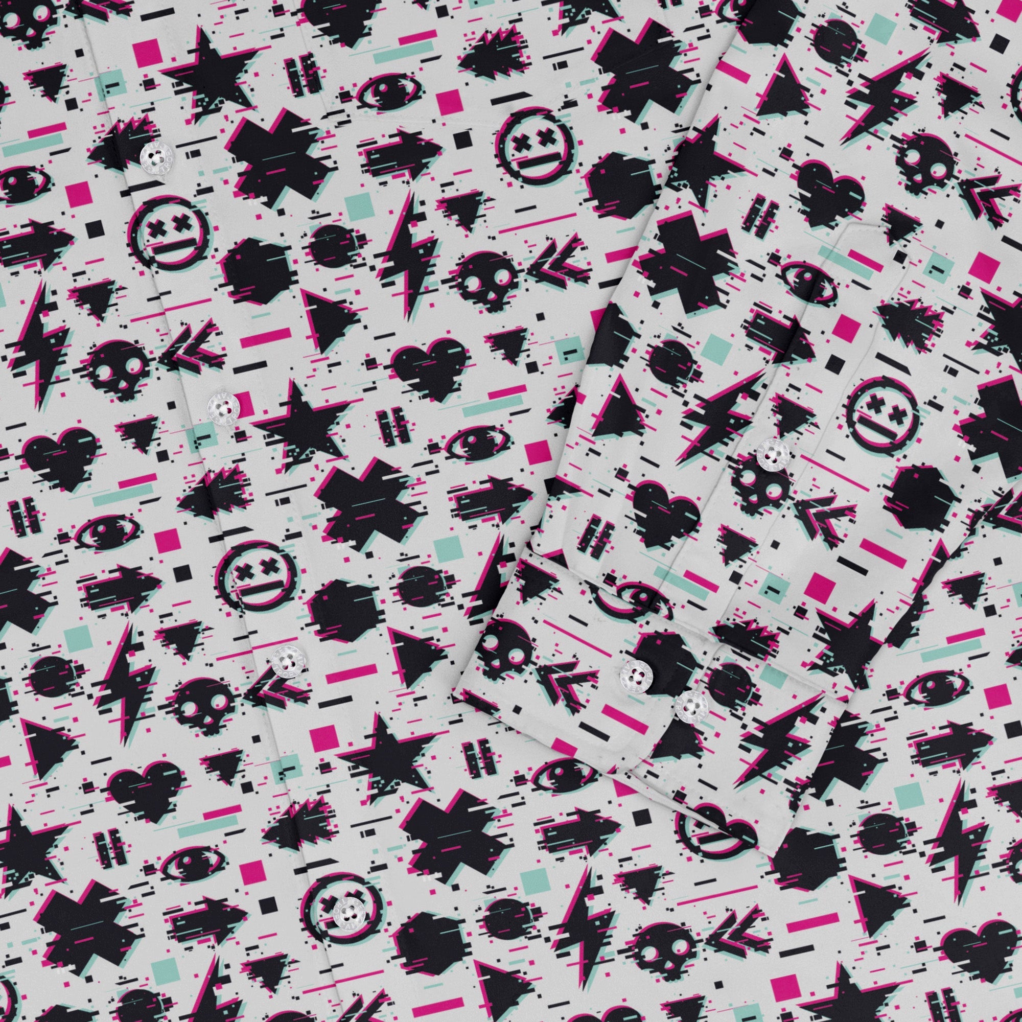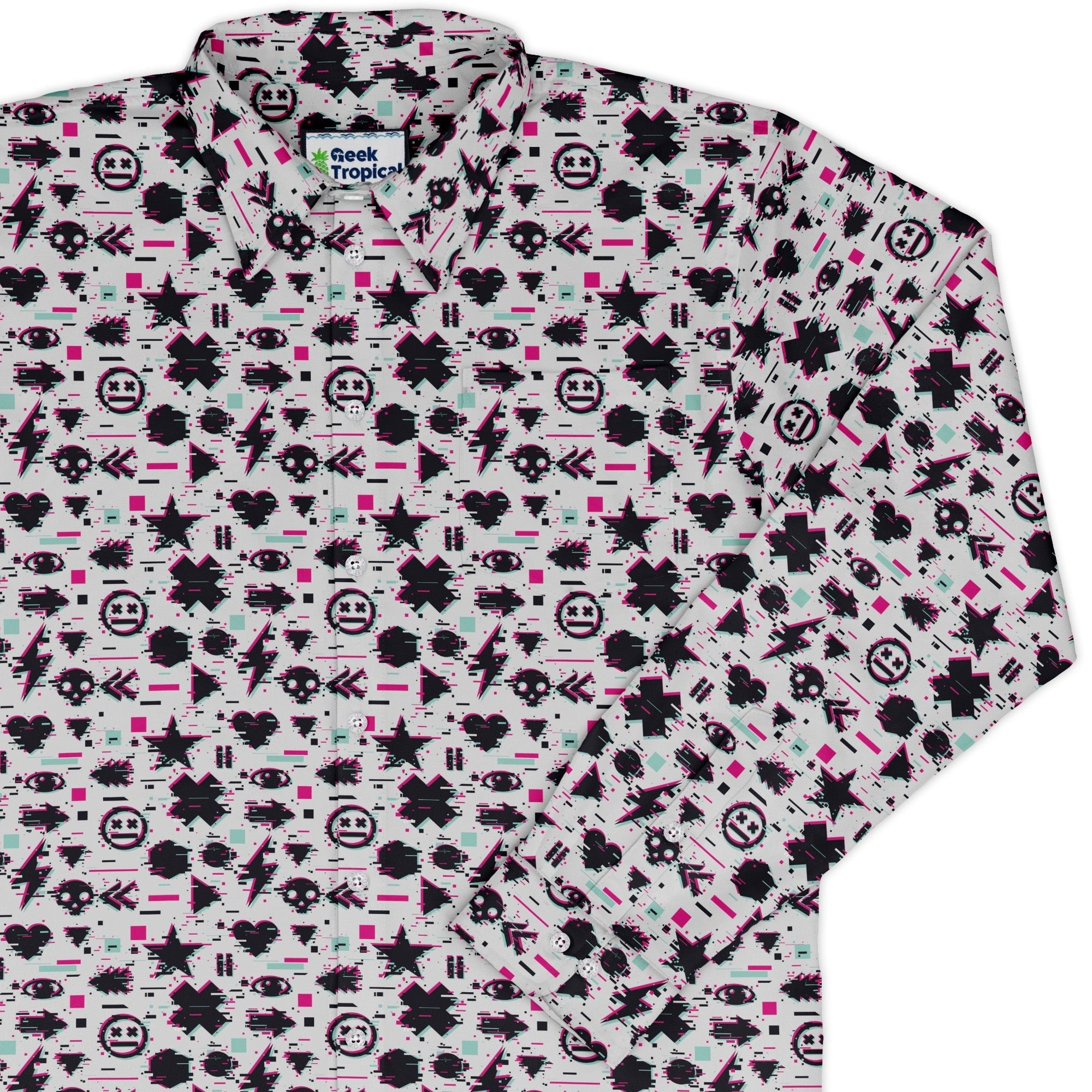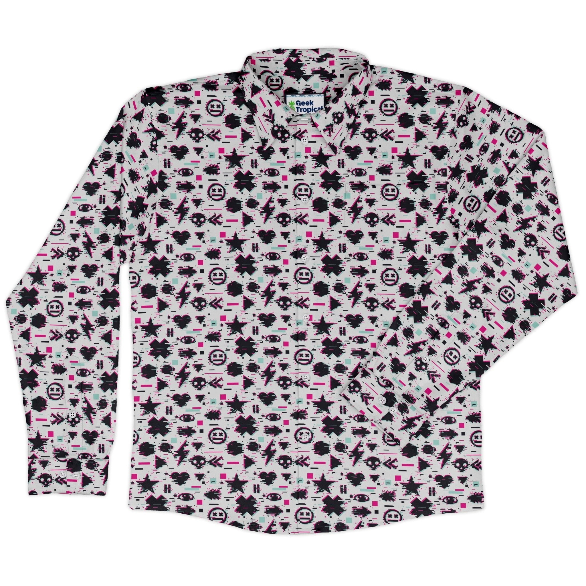 Glitchy Game Effects Video Game Long Sleeve Button Up Shirt dials your style into arcade mode, wrapping you in an all-over cascade of digital glitches and pixel noise that reads bold up close and sleek from afar. Long sleeves and a crisp collar keep it polished, while a seamless flow across the pocket lets the artwork shine. Built for all-day play and after-hours quests, this is confident, artist-backed geekwear.