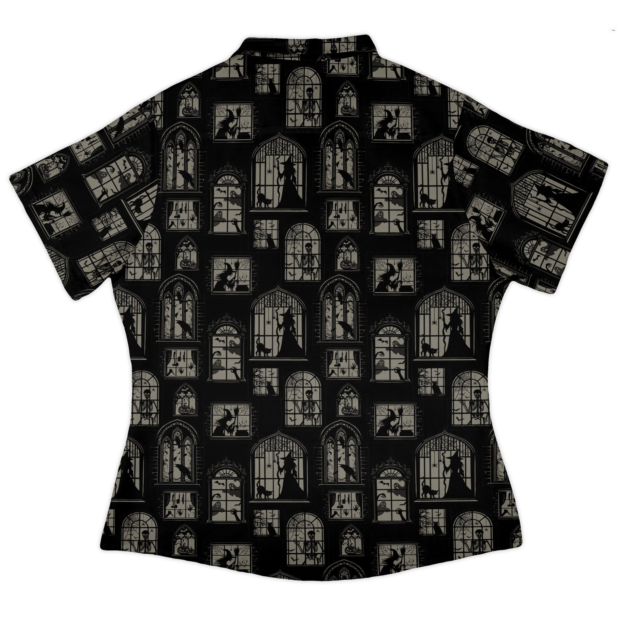 The Gothic Windows Curvy Button Up Shirt brings midnight-cathedral energy to your everyday. Designed by Episodic, the print layers ornate arched windows, delicate tracery, and leaded‑glass geometry, repeating in rhythmic rows across the shirt. A curve-loving silhouette keeps it polished whether layered or worn solo, while crisp buttons and a clean collar ground the maximalist mood. Printed with eco-conscious inks and artist-backed.