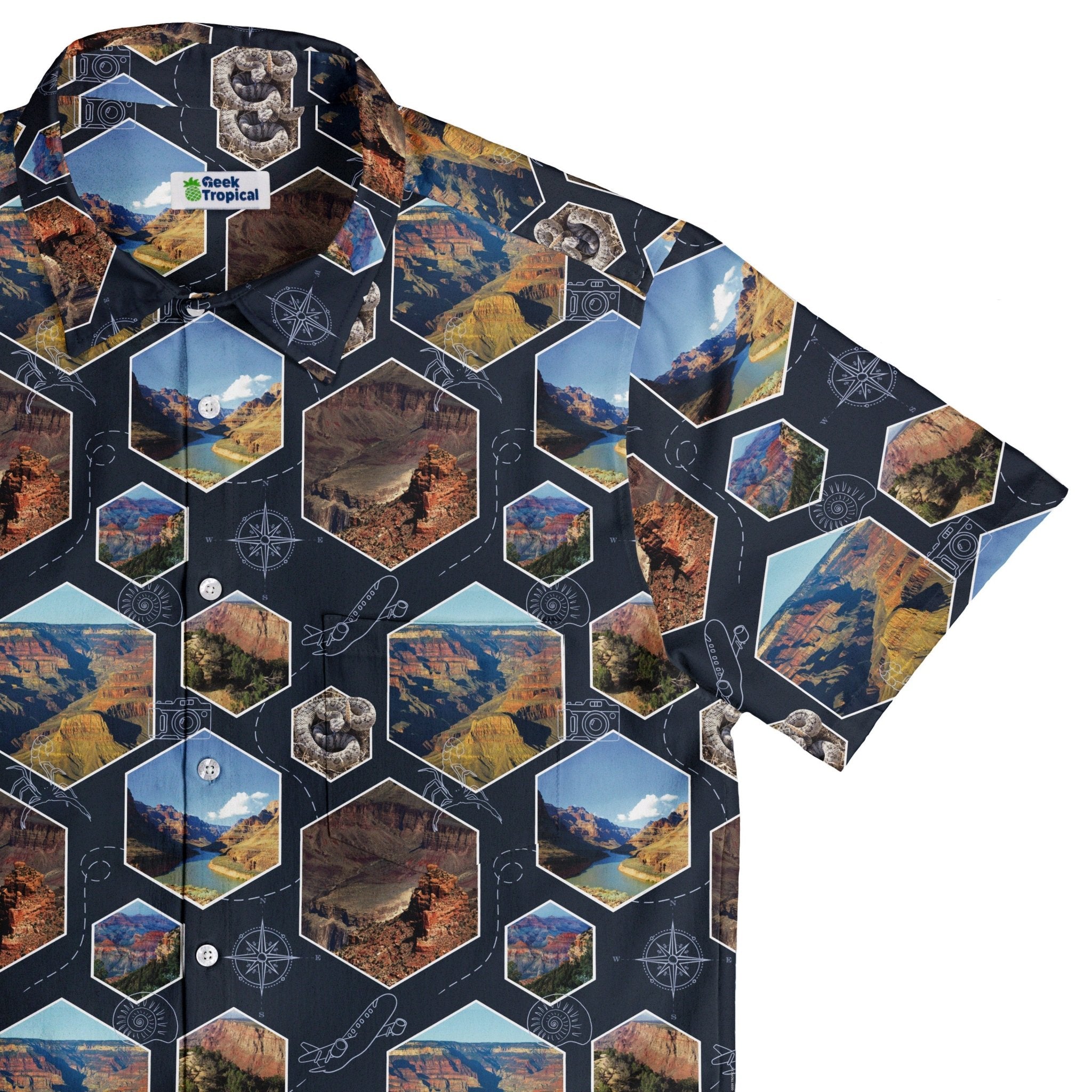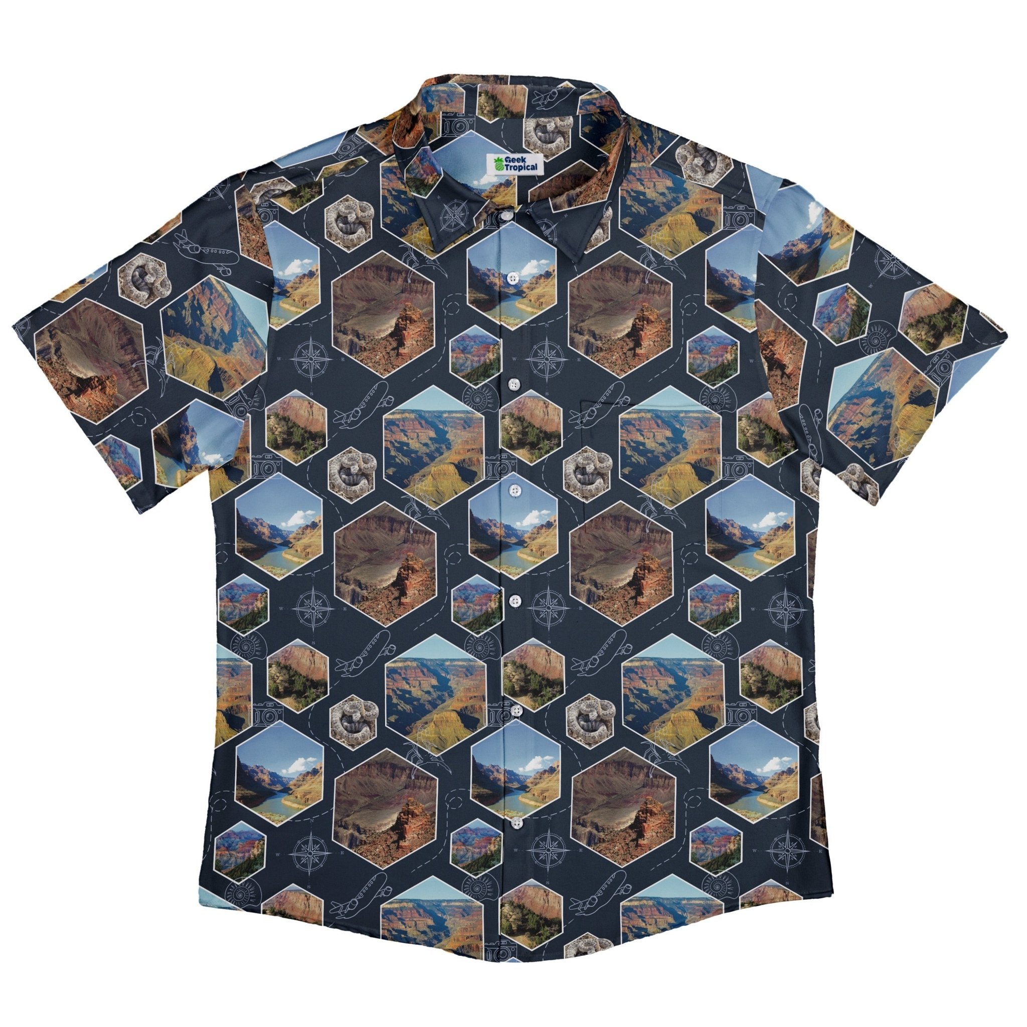 Meet the Grand Canyon Wonder Button Up Shirt, a wearable postcard for geology geeks and daydream travelers. Sculpted canyon strata sweep across the shirt in bold, maximalist waves of sandstone oranges, copper, and twilight purples, with seam-matched art flowing over the placket and pocket. Designed by Nathan, this unisex staple has an easy, confident drape, printed with eco-conscious inks that support the artist.