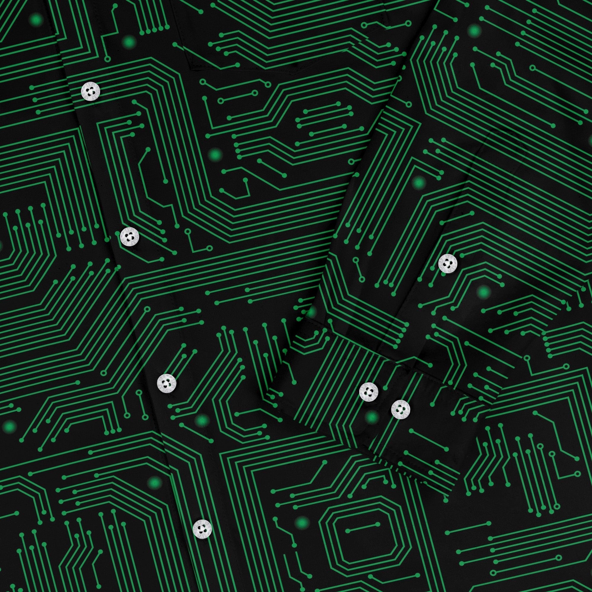 Compile a sharper fit with the Green Computer Circuits Long Sleeve Button Up Shirt, a PCB‑green standout radiating microchip energy. Intricate circuit traces and solder‑pad motifs run edge to edge, with a pattern‑matched chest pocket and polished buttons for a clean, nerd‑chic finish. Built for all‑day comfort and easy cuffing to your spec. Printed with eco‑conscious inks, and every purchase supports licensed artists.