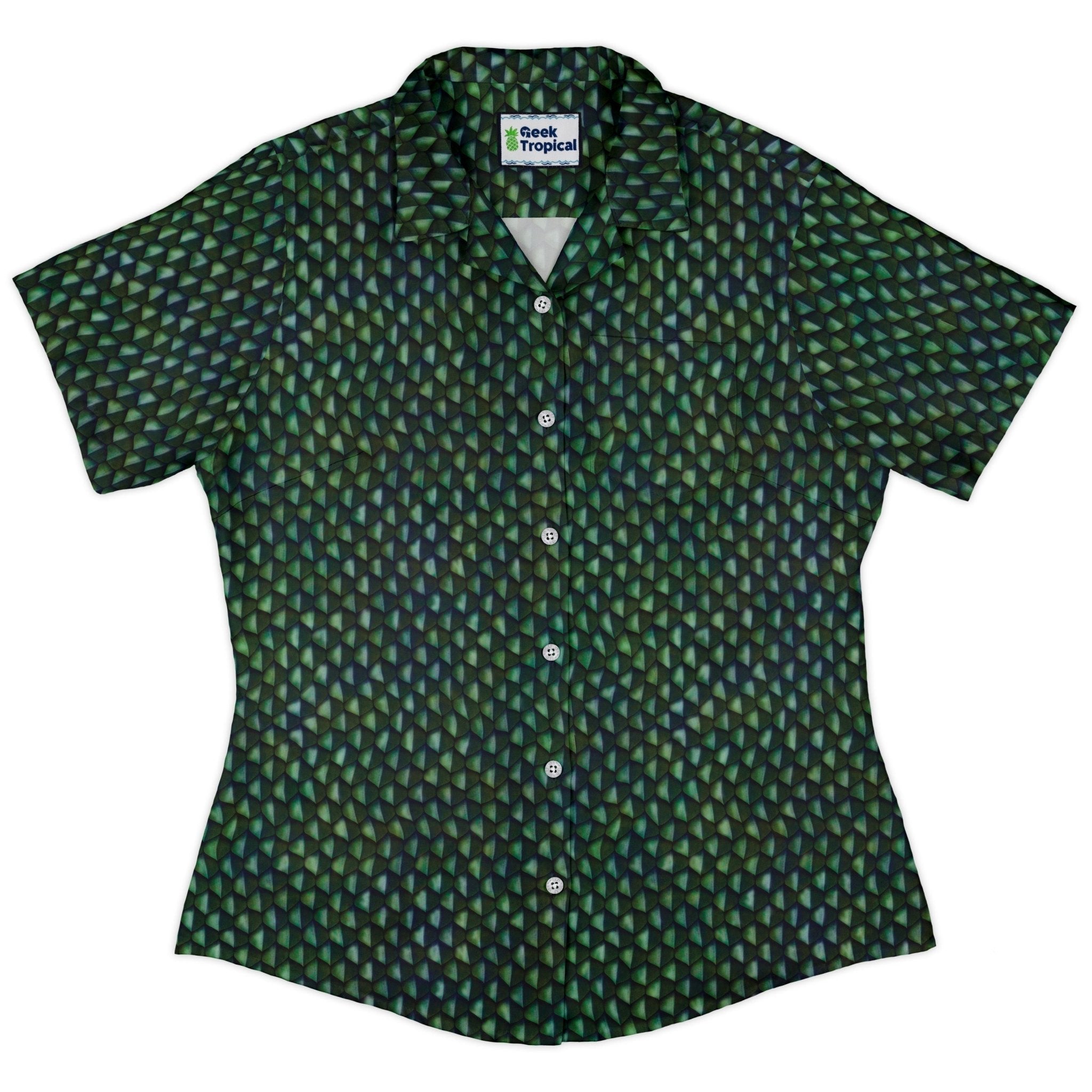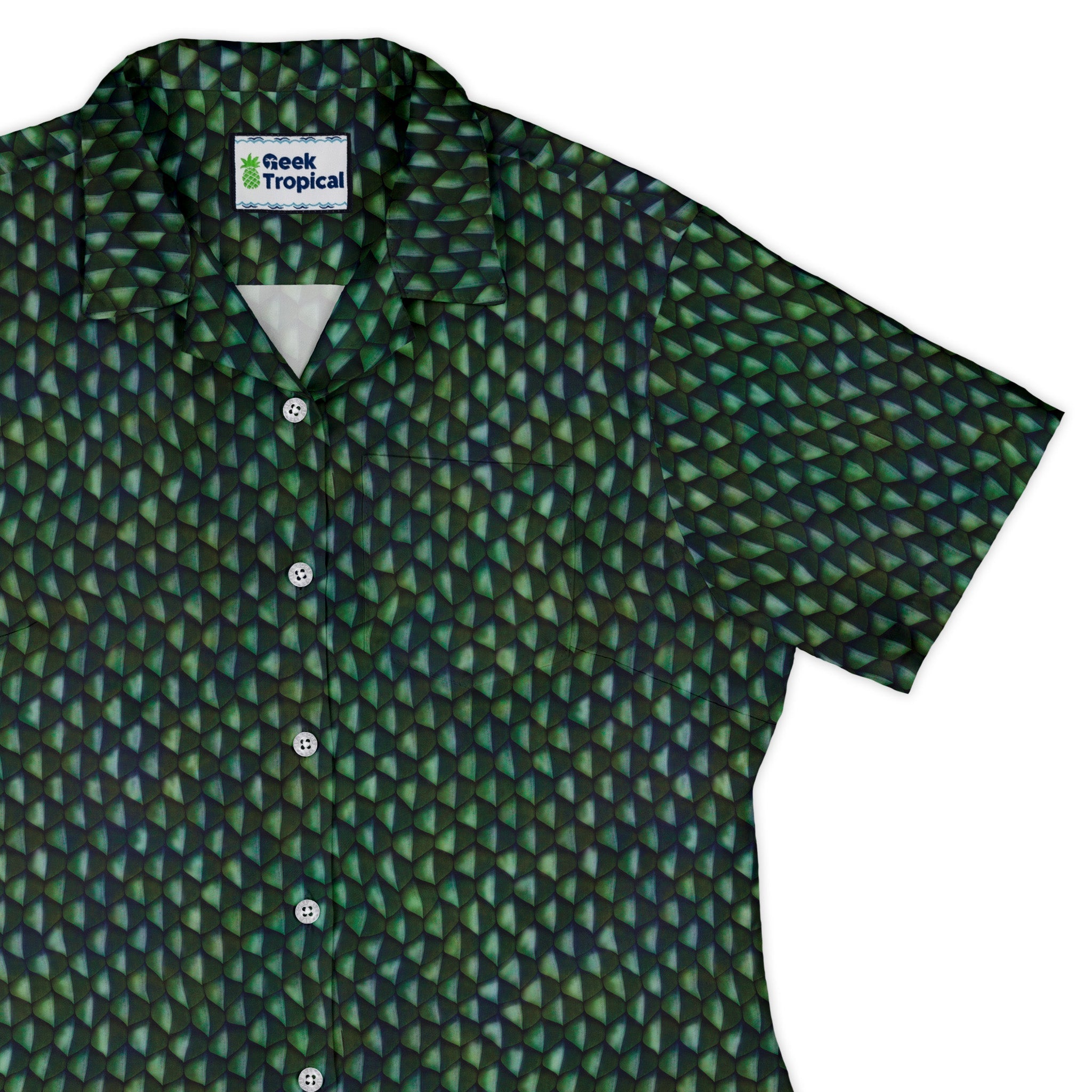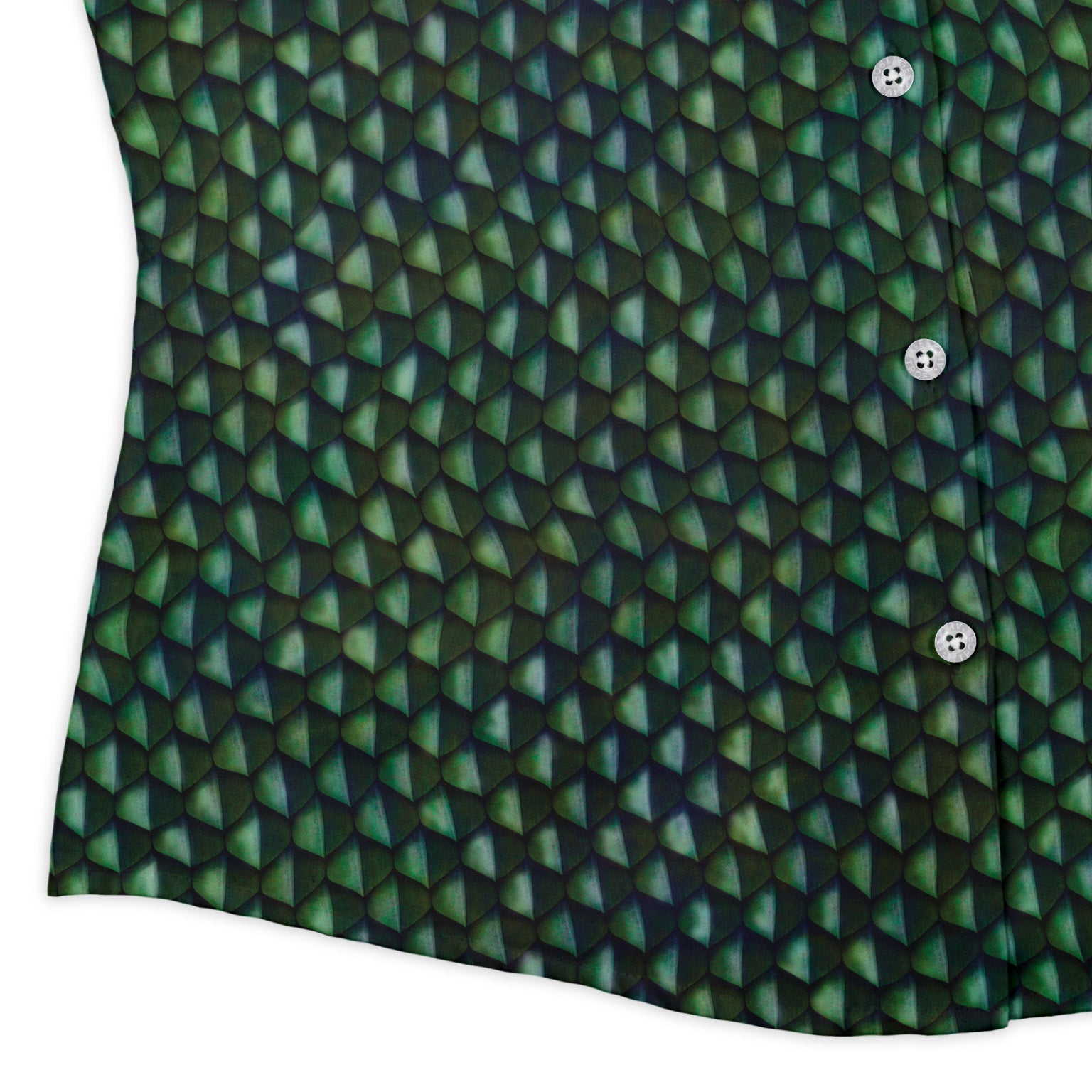 Own your lair look with the Green Dragon Scales Curvy Button Up Shirt—an emerald scale pattern that flows from collar to hem and even matches across the chest pocket for a seamless finish. Cut to celebrate curves with a polished, untucked-friendly shape, it’s soft, light, and adventure-ready for Dnd nights or everyday quests. Designed by Nathan and finished with branded buttons, printed with sustainable inks to support licensed artists.