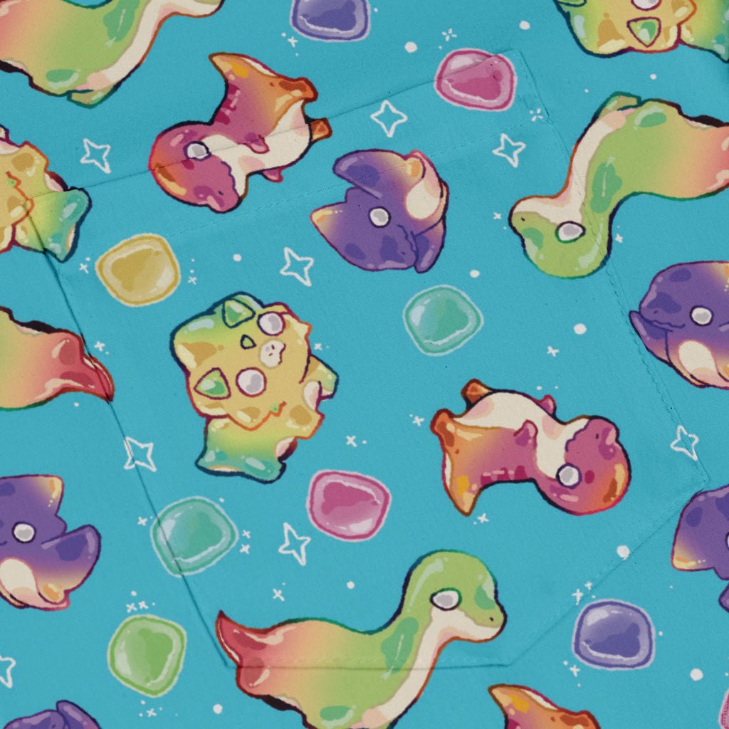 Meet the Gum Drop Dinos Long Sleeve Button Up Shirt, a candy-coated celebration of prehistoric charm. Gumdrop-bright dinos parade across a clean backdrop, with the print flowing neatly over the placket and pocket for a seamless look. Designed by Ardi Tong and backed by our artist-first ethos, it’s comfy, breathable, and ready for the office, date night, or game night—made with eco-conscious inks and cuff-it-your-way sleeves.