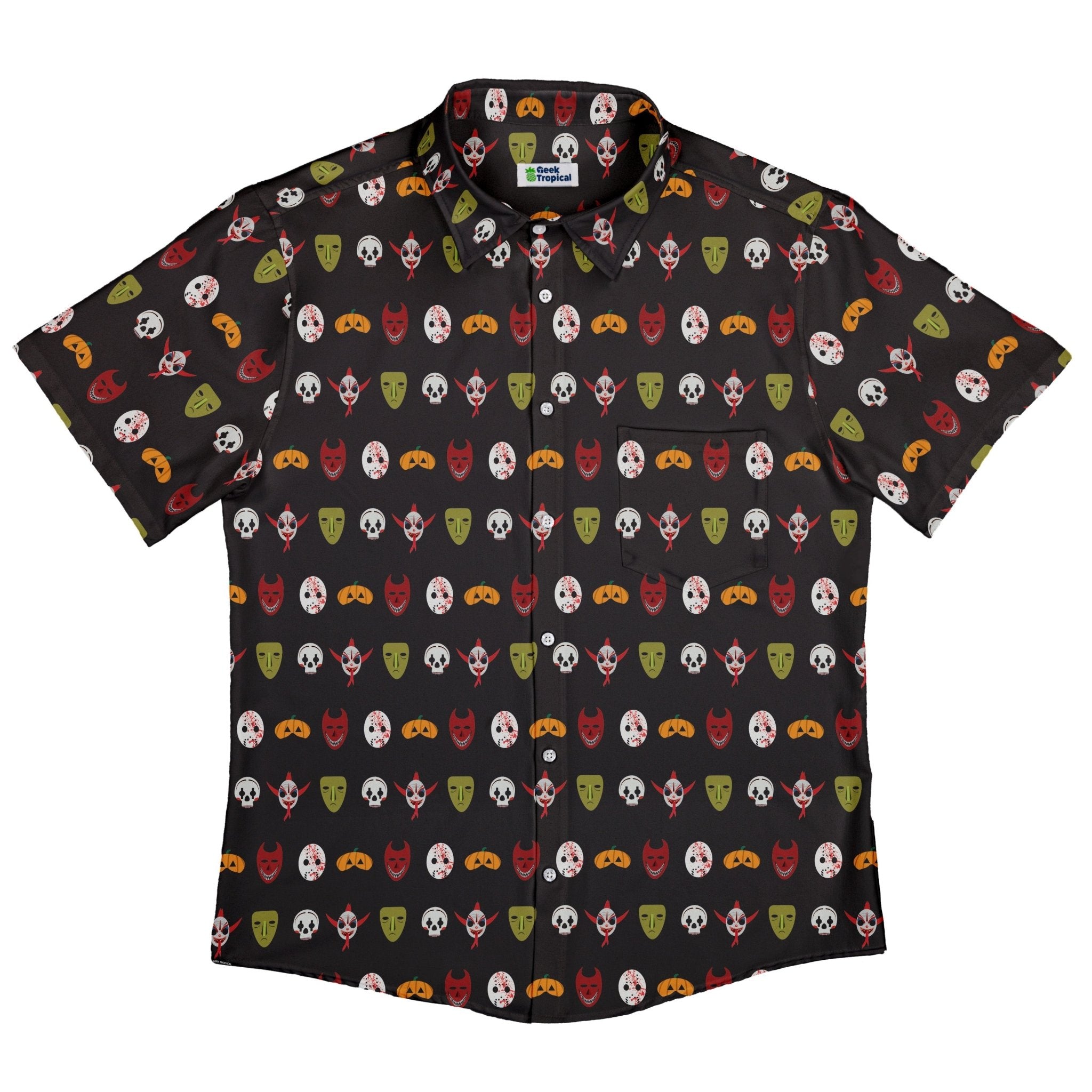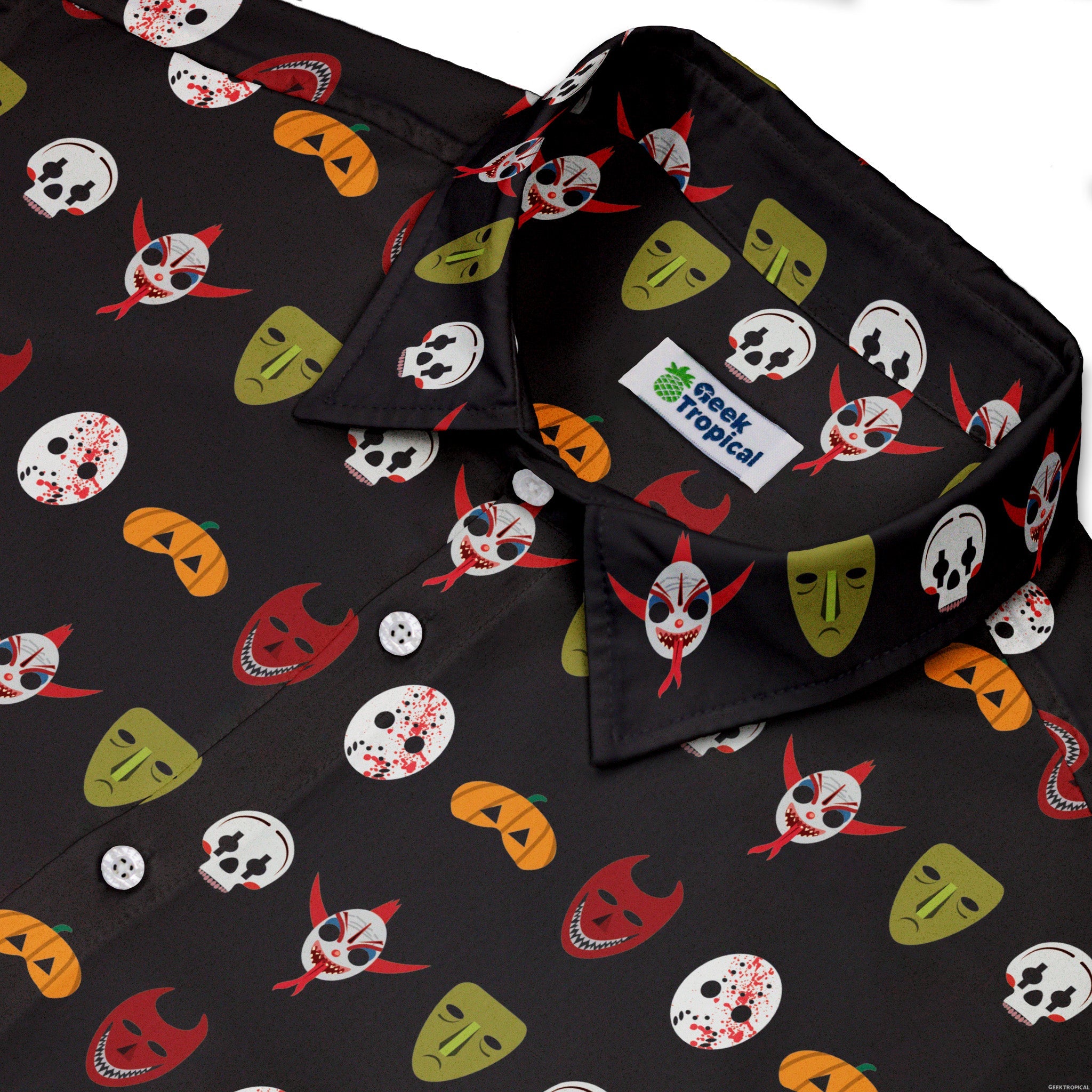 Turn every outing into a spooky flex with the Halloween Masks Button Up Shirt. Designed by Heather Davenport, it showcases a curated lineup of eerie costume masks—fanged grins, stitched mouths, and wide-eyed glares—scattered across a deep, night-ready backdrop. Clean button-up styling meets geeky swagger, perfect from pumpkin patch hangs to late-night marathons. Pair it with denim or go full costume; the print does the talking. Licensed art supports the artist.
