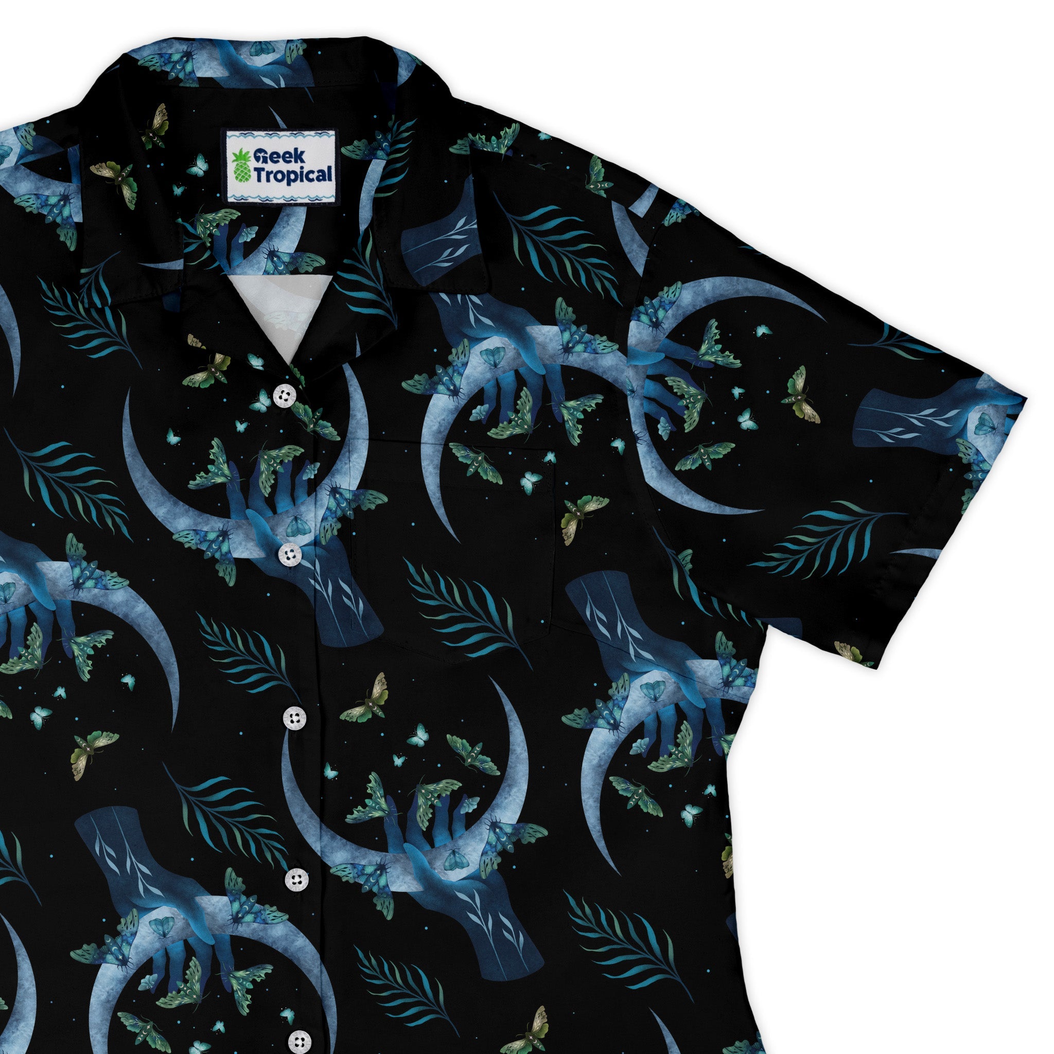 The Hand on the Moon Moth Curvy Button Up Shirt channels stargazer energy with a tailored, curve-loving fit—designed by Episodic. An illustrated hand reaches for a glowing moon as a moth drifts through a star-dusted sky, with artwork aligned across the front and pocket for a seamless look. Adjustable sleeves, an easy-to-wear hem, and signature buttons keep it polished. Printed with planet-friendly inks and proudly artist-backed.