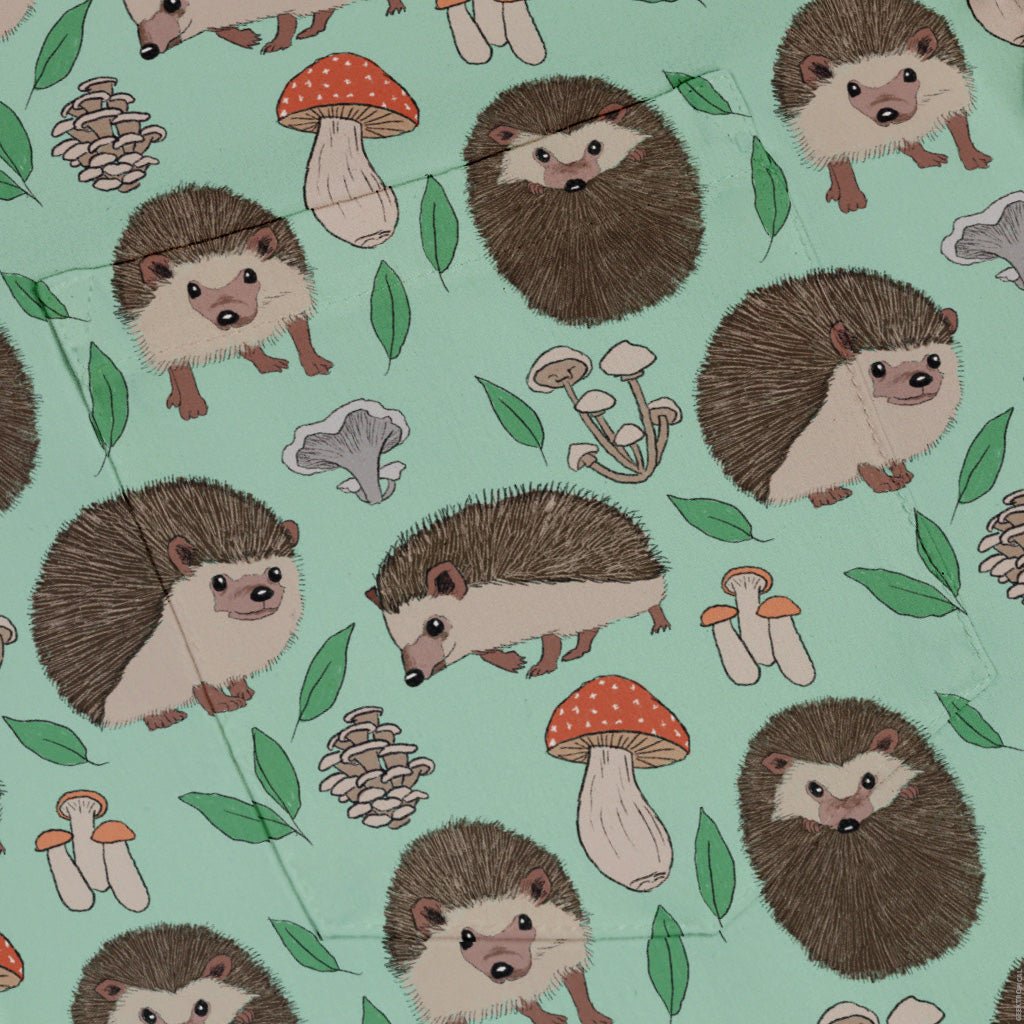 Meet the Hedge Hog Garden Adventures Button Up Shirt, a playful collab with artist Julie Kitzes where curious hedgehogs roam a lush garden of hand-drawn botanicals. Crisp linework and charming micro-details reward a closer look, and the print aligns cleanly across the placket and pocket. Soft, easy drape meets nerdy nature energy—licensed art that supports its creator.