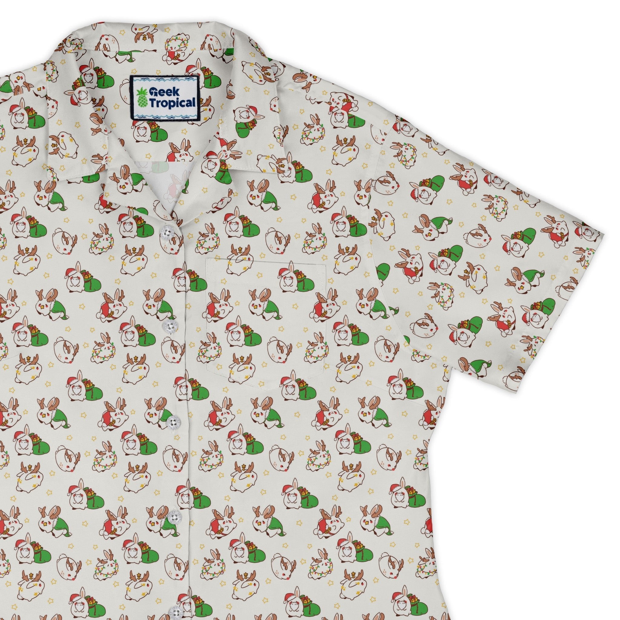 Meet the Holly Jolly Bunnies Curvy Button Up Shirt—your cheerful seasonal flex with an anime wink. Designed by Ardi Tong, the print scatters adorable bunny faces and holly sprigs in a clean, repeating layout that lines up across the pocket. Crafted for curves with a polished untucked silhouette and sleeves you can style fitted or relaxed, it delivers all-day comfort and artist-backed charm.