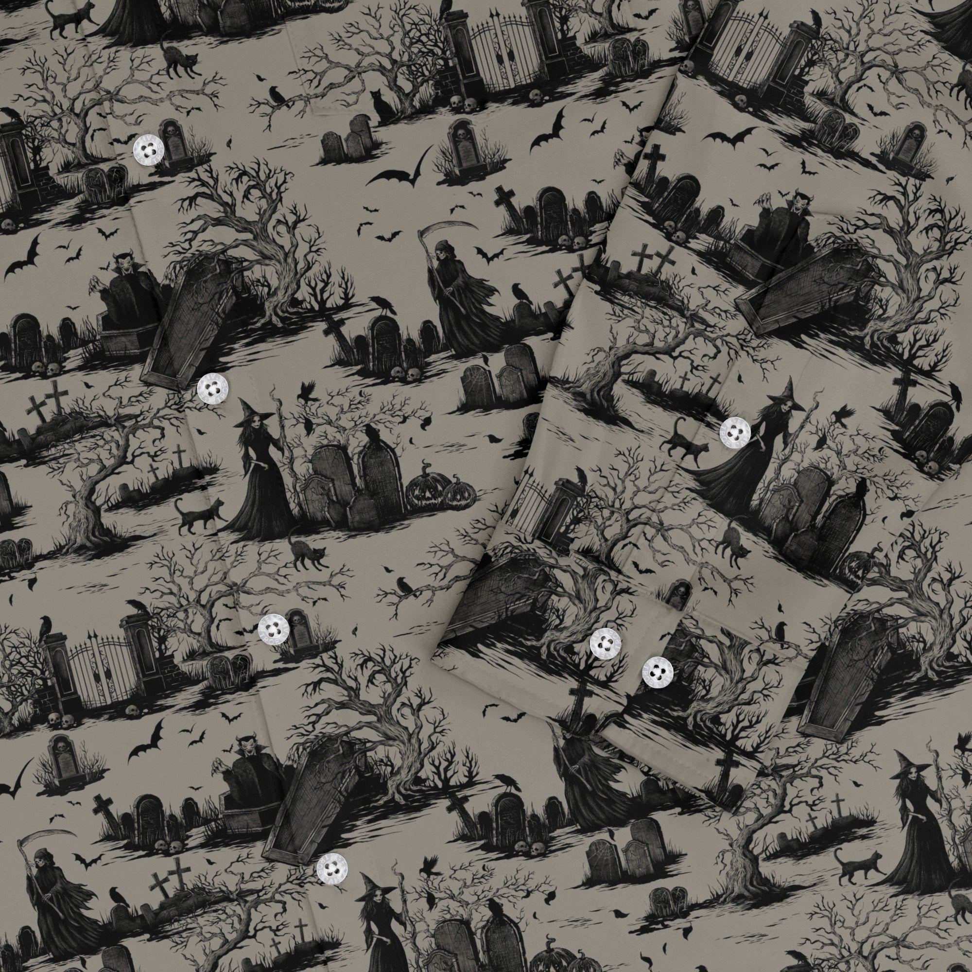 Summon midnight vibes with the Huanted Graveyard Dark Long Sleeve Button Up Shirt, a moody flex for horror fans and goth-leaning geeks. Designed by Episodic, its all-over print wanders a shadowy cemetery—stark tombstones and looming silhouettes—washed in deep, inky tones. Polished enough for the office, bold enough for the afterparty, and printed with artist-backed, eco-conscious inks so your dark side looks sharp and feels good.