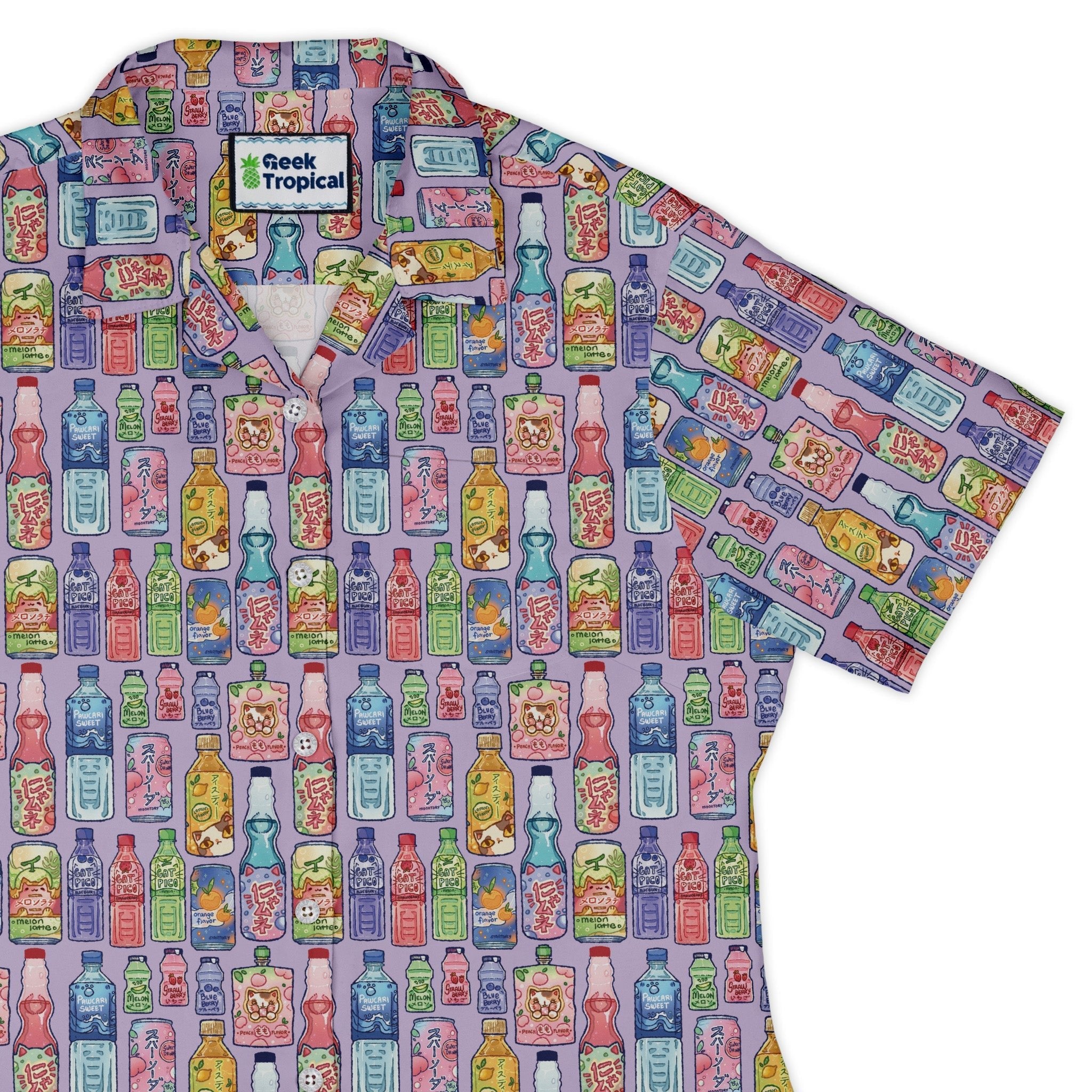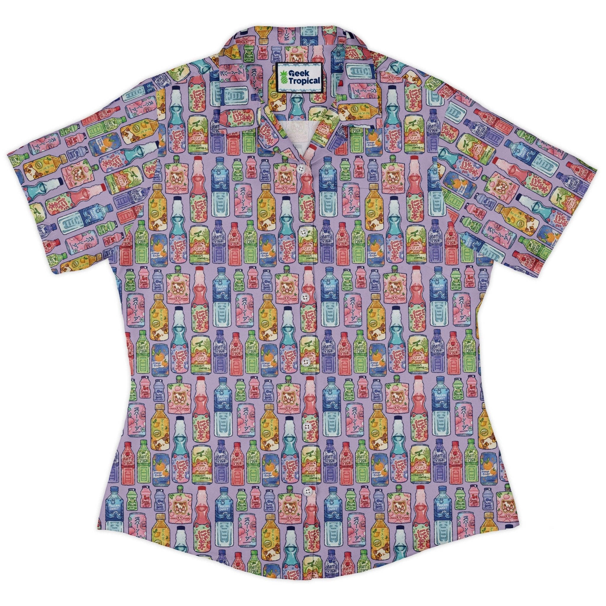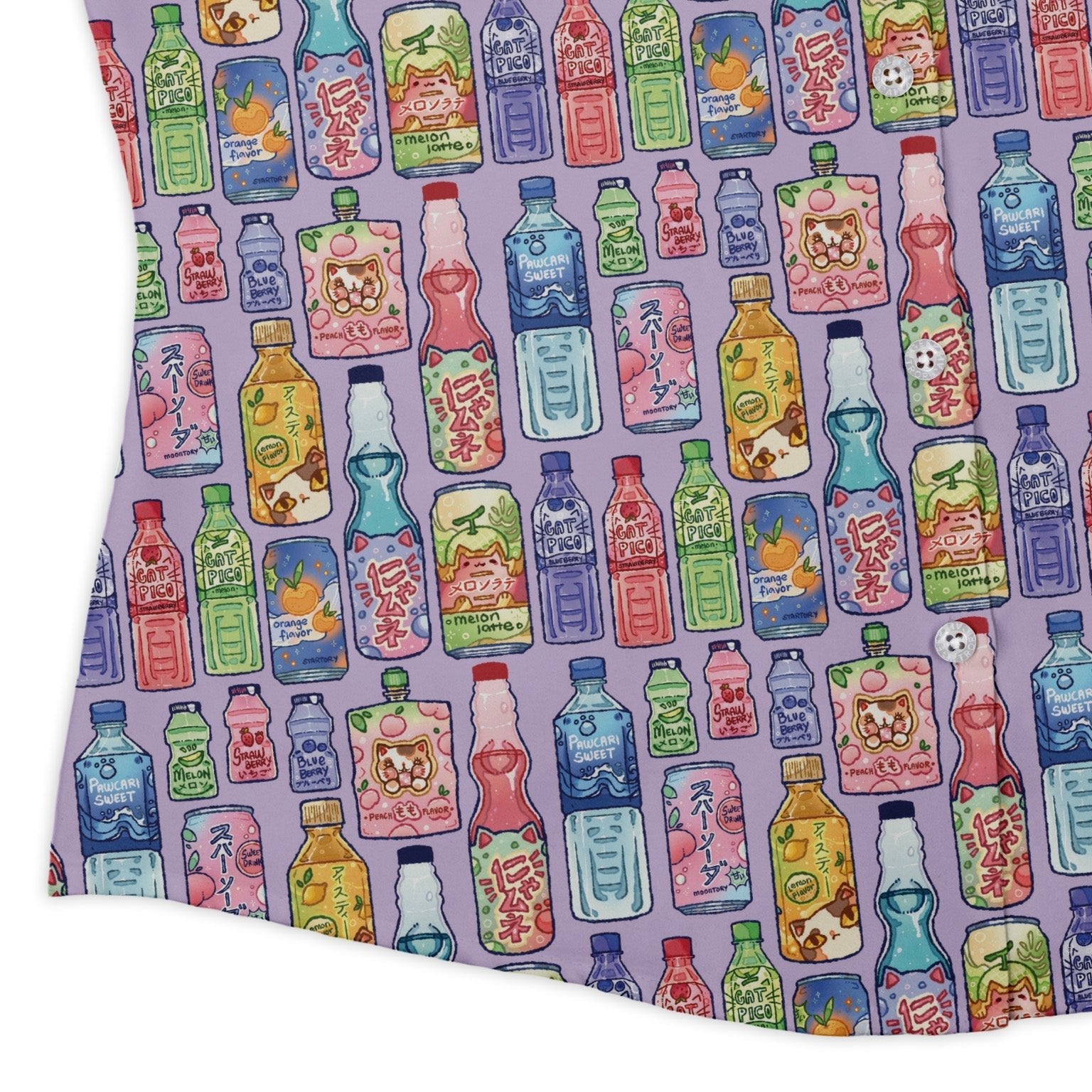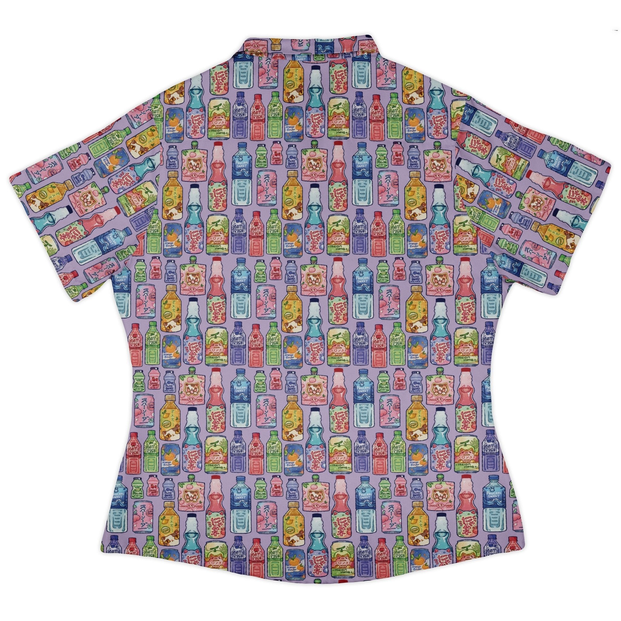 Japanese Vending Machine Drinks Curvy Button Up Shirt delivers peak snack-run energy with a gallery of illustrated cans and bottles lined up like a late-night Tokyo vending wall. Clean Japanese lettering, glossy highlights, and tidy rows keep the pattern satisfyingly organized. Cut for curves and ready for busy days, this artist-backed piece—designed by Ardi Tong—pairs geek flair with polished, easygoing style.