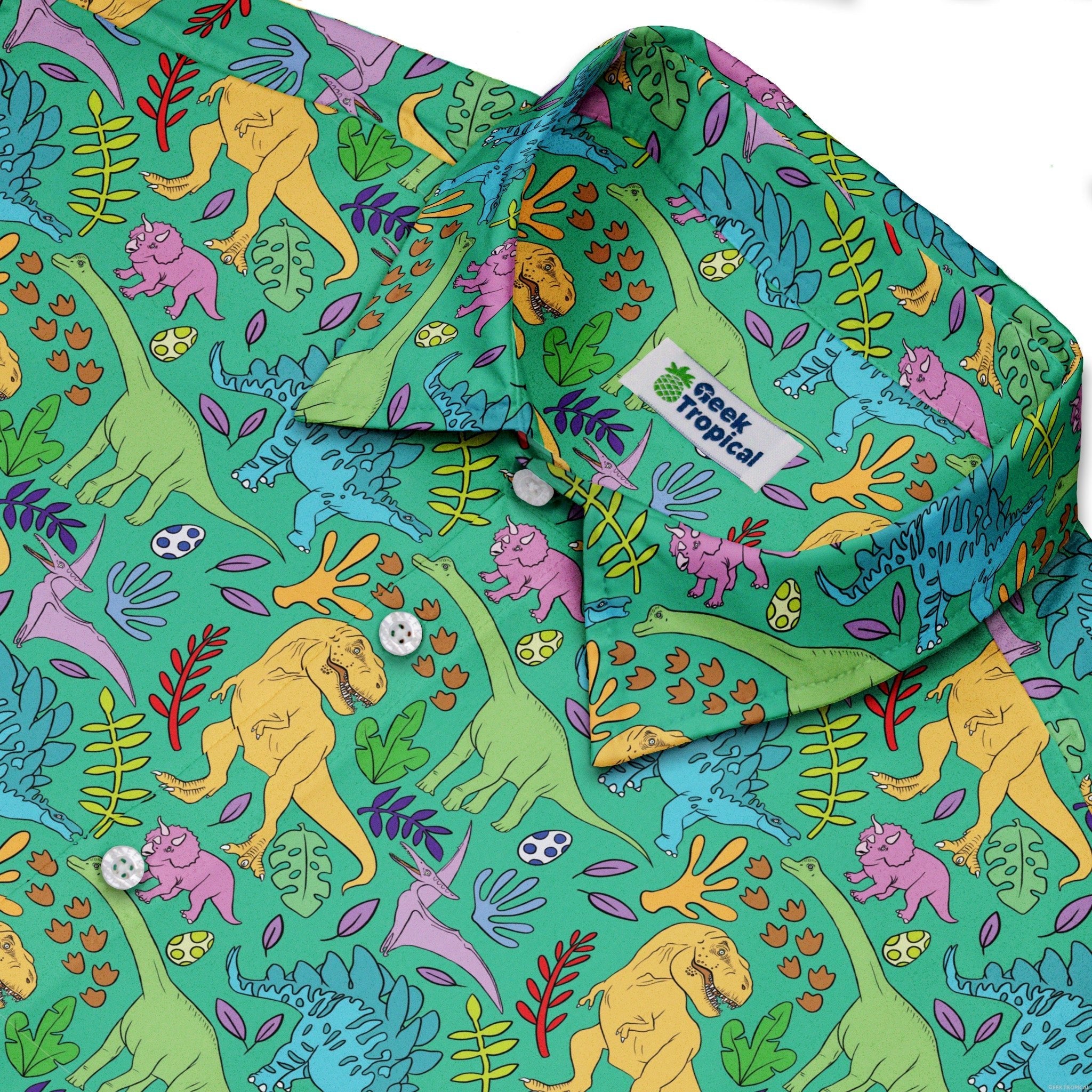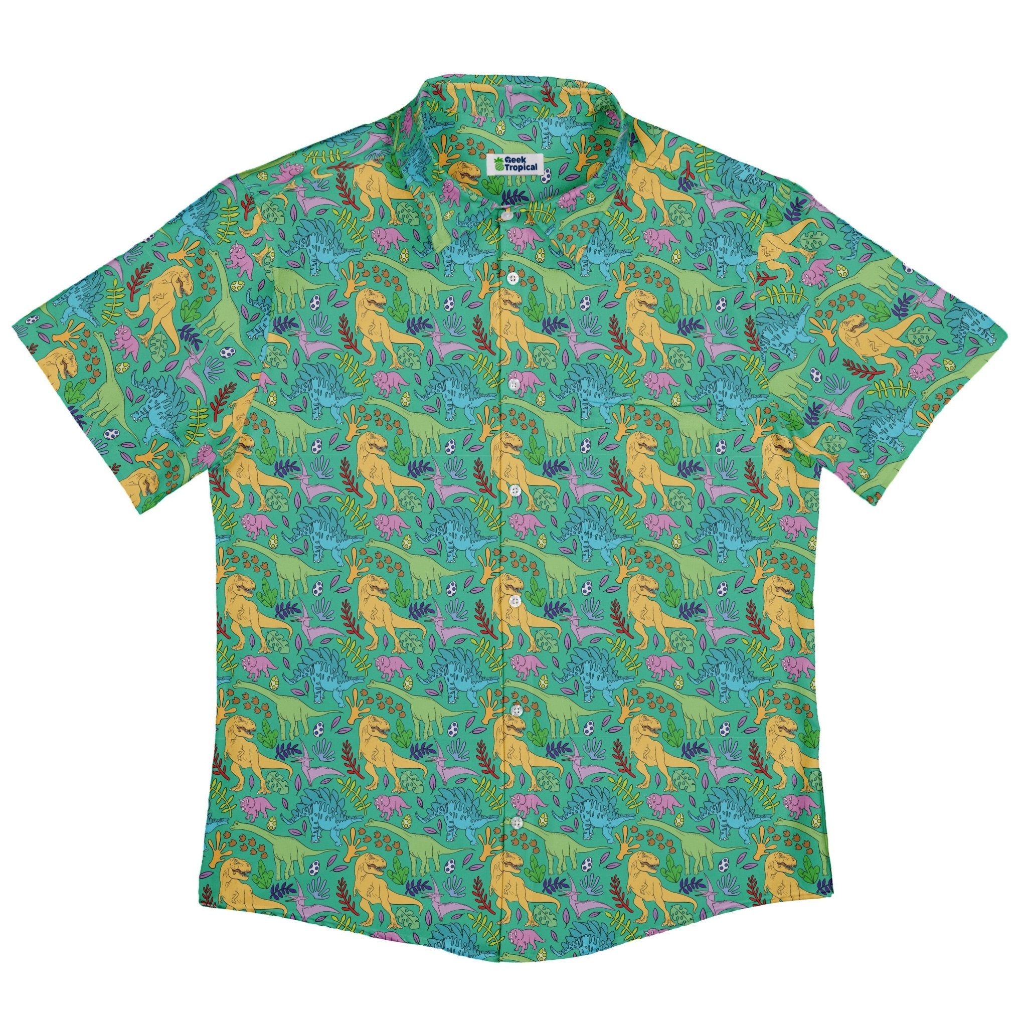 Meet the Jurassic Jungle Button Up Shirt—primeval vibes, modern polish. The print layers dense jungle fronds with dinosaurs peeking through, creating an allover scene that lines up cleanly across the front and the optional pocket. Designed by Julie Kitzes, it delivers soft, airy comfort with a relaxed drape and tidy buttons. Printed with eco‑conscious inks, this licensed art lets you dress up and geek out while supporting the artist.