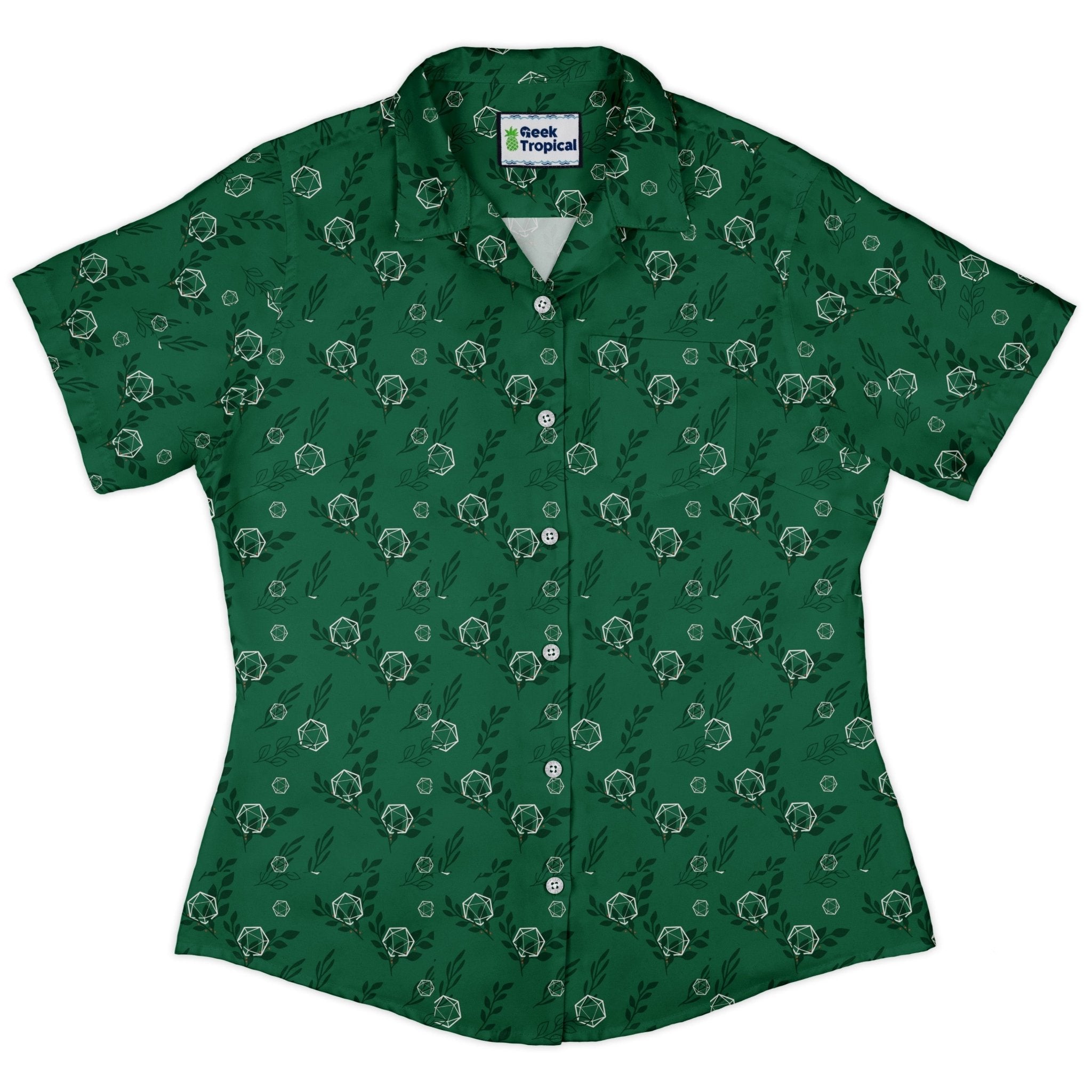Meet the Leafy Green Dice Curvy Button Up Shirt, a botanical love letter to campaign nights and coffee runs alike. Lush leaves wrap the fabric while green dice peek from the canopy, printed edge-to-edge with a pattern-matched chest pocket for that seamless look. Cut with a curvy, tailored silhouette that moves easily and feels breathable all day. Finished with crisp buttons and designed by Heather Davenport, this eco-conscious print supports licensed artists—and your roll-worthy outfit.