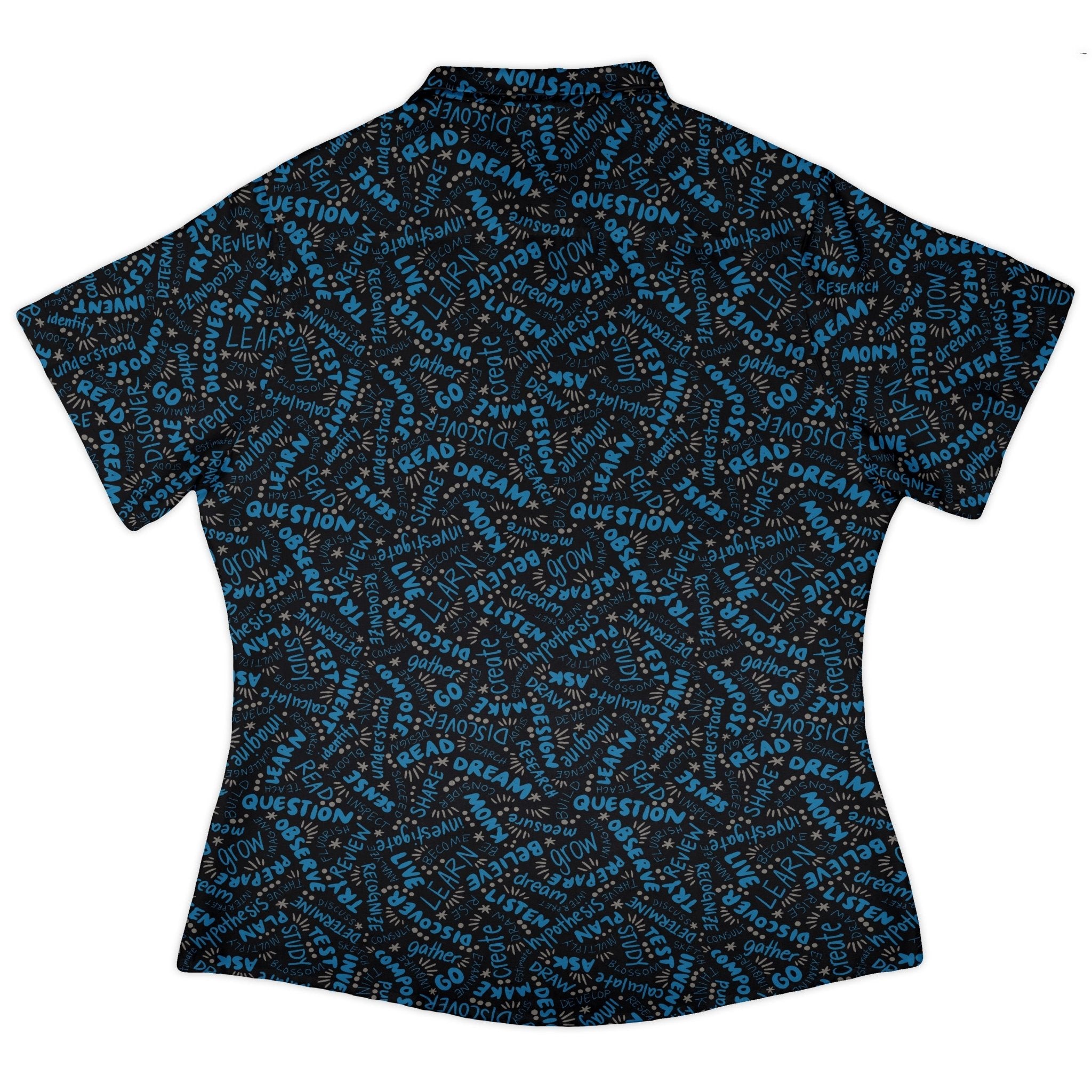 Learner Affirmations Curvy Button Up Shirt turns curiosity into a look for lab days, lectures, and laid‑back weekends. A science‑inspired affirmation print by Zirkus Design keeps motivation in view, while the curvy silhouette flatters and moves with you. The pattern flows cleanly across the front and pocket, finished with crisp branded buttons. Soft comfort, adjustable sleeves, and planet‑minded inks close the loop.
