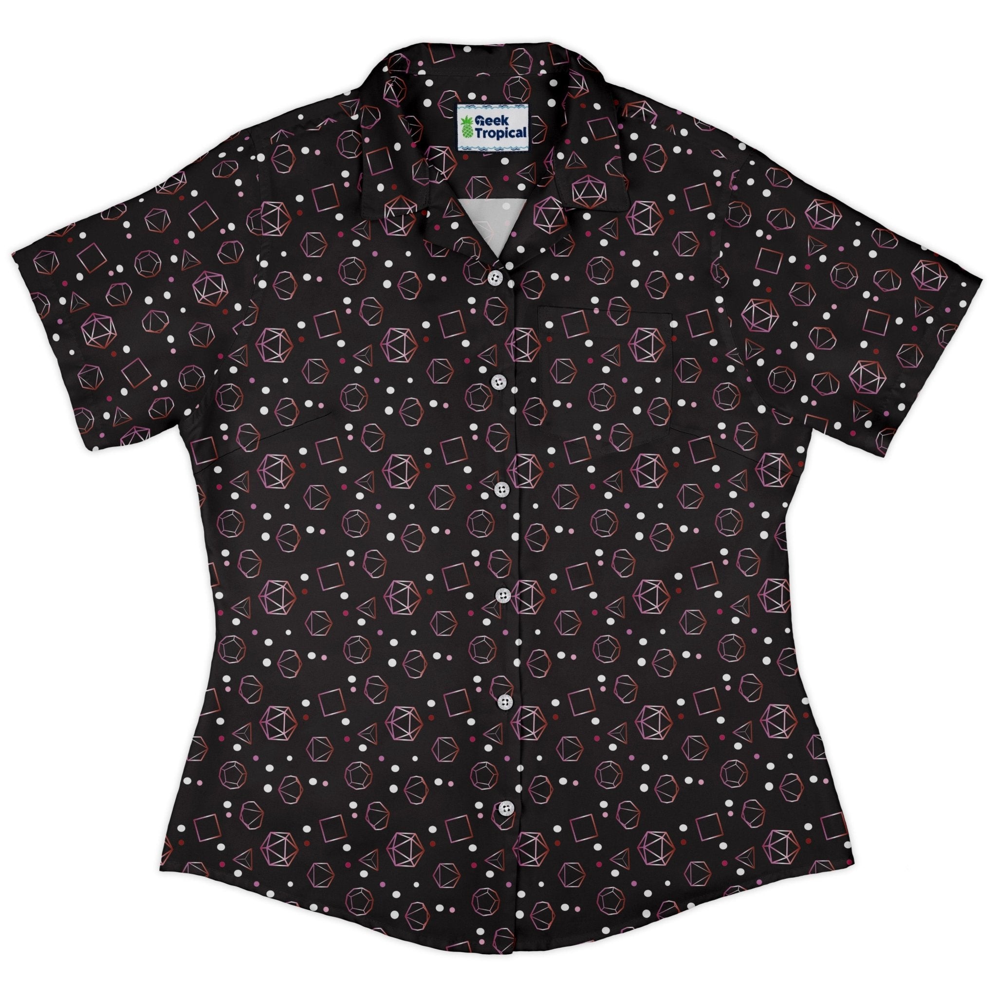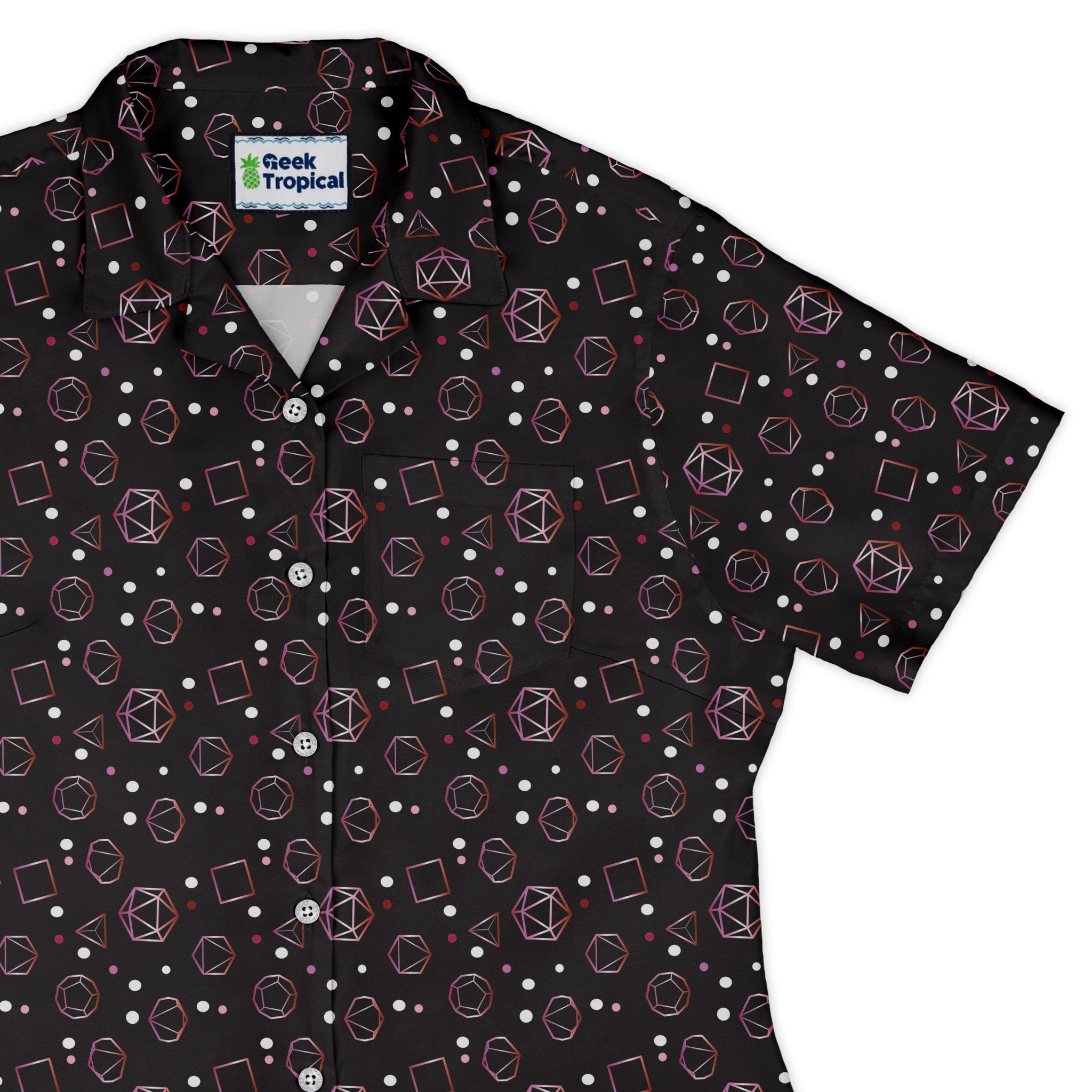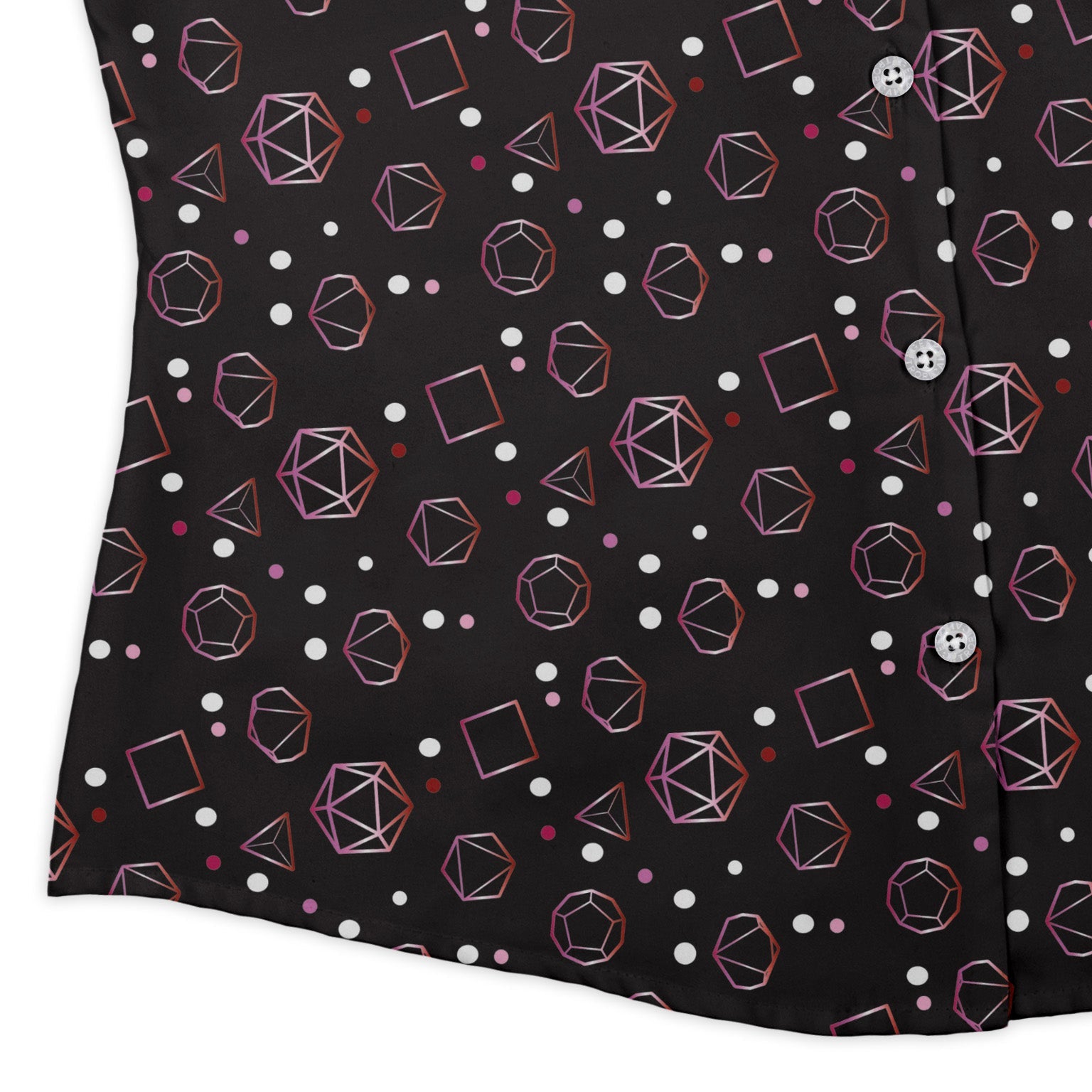 Roll your stats in style with the Lesbian Pride Flag DND Dice Curvy Button Up Shirt. An all-over toss of dice icons glows in sunset pinks, oranges, and cream, echoing the lesbian flag, with the print flowing cleanly over the chest pocket for a seamless look. The contoured, femme-forward cut feels soft and light, finished with branded buttons. Designed by Heather Davenport and printed with eco-conscious inks to support artist-made geekwear.
