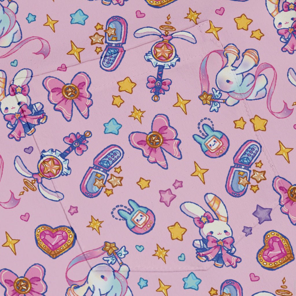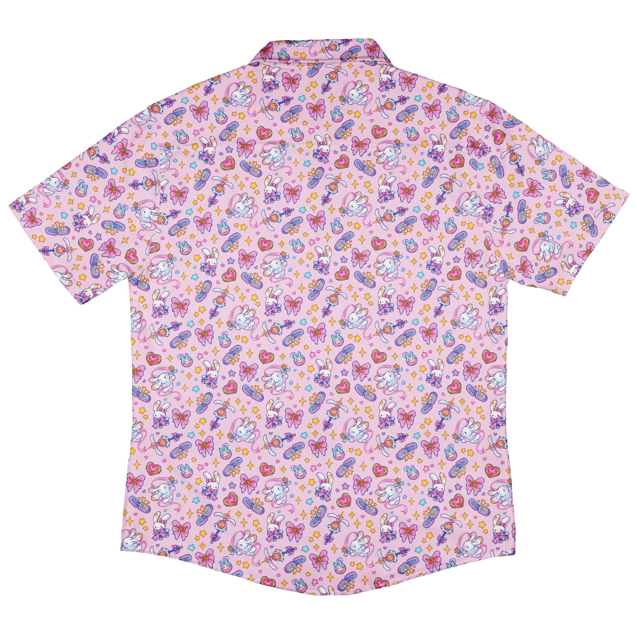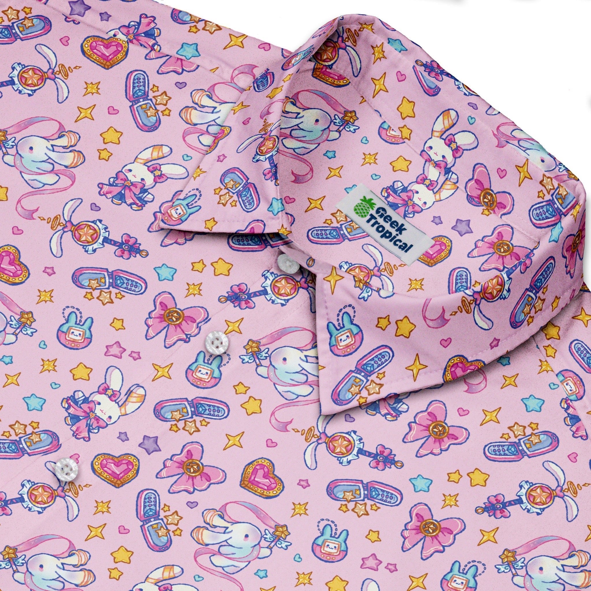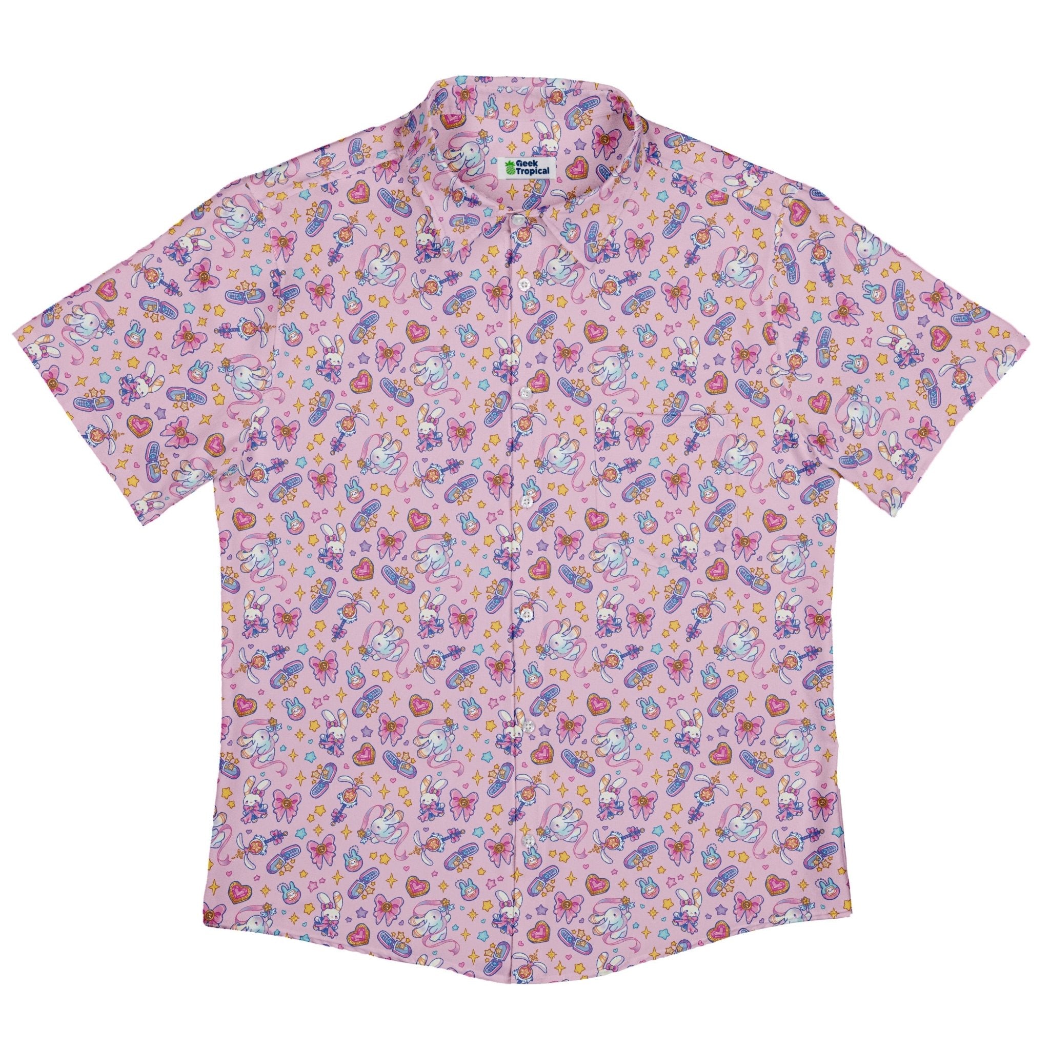 Slip into the Magical Bunny Evolution Pink Button Up Shirt and let your fit level up with every hop. A rosy pink canvas showcases anime-inspired bunny motifs dancing across the entire shirt, delivering a playful, polished vibe from collar to hem. Soft and lightweight for all-day wear, this artist-backed piece is designed by Ardi Tong and printed with eco-conscious inks—so your style supports creators while staying delightfully nerd-chic.