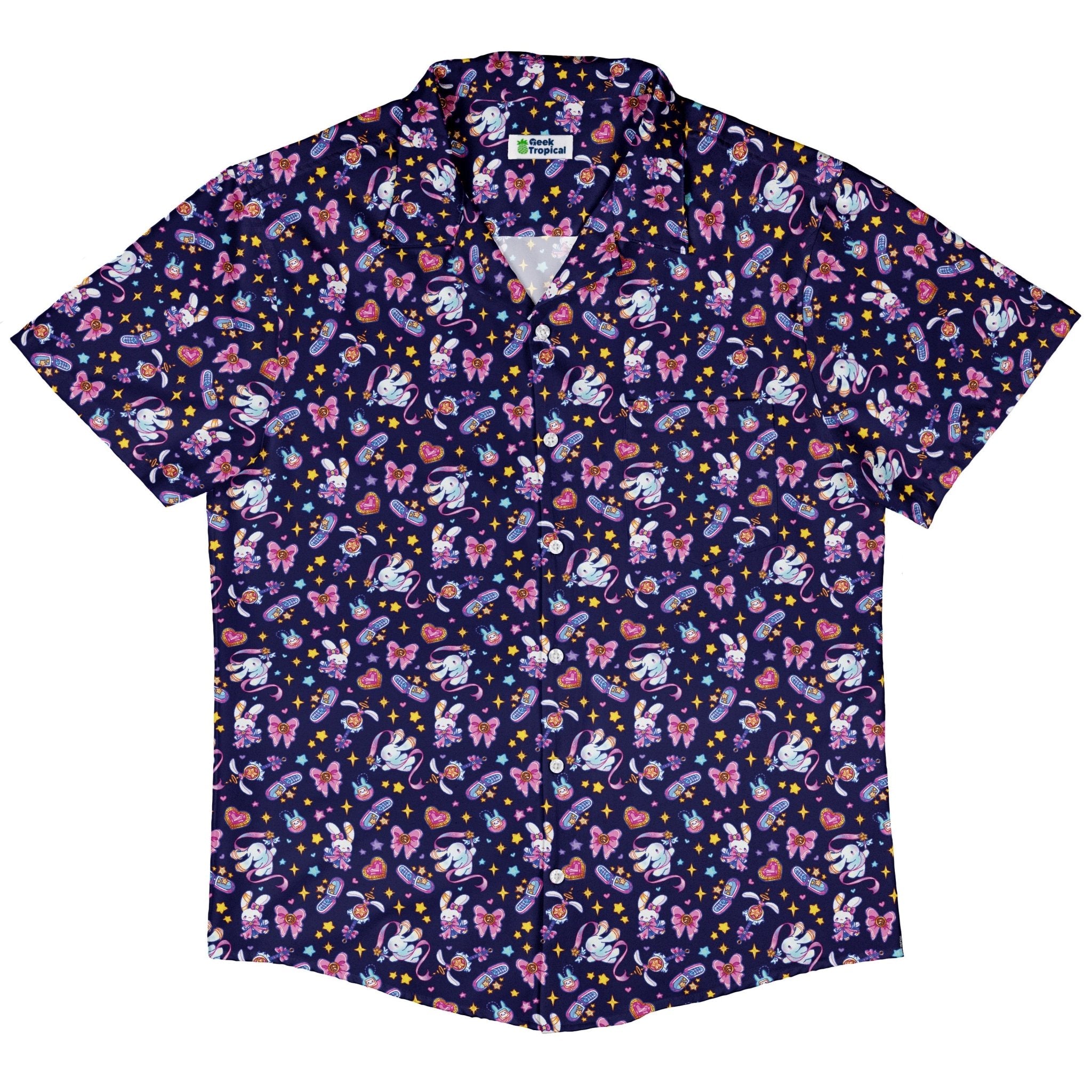 The Magical Bunny Evolution Night Button Up Shirt channels late-night anime energy with a night-sky palette. Across the front, bunnies evolve from cute companions to mystical familiars, traced in luminous lines and smooth gradients. Art by Ardi Tong flows cleanly over the placket for an uninterrupted scene, delivering a sleek look that’s playful, confident, and proudly artist-backed.