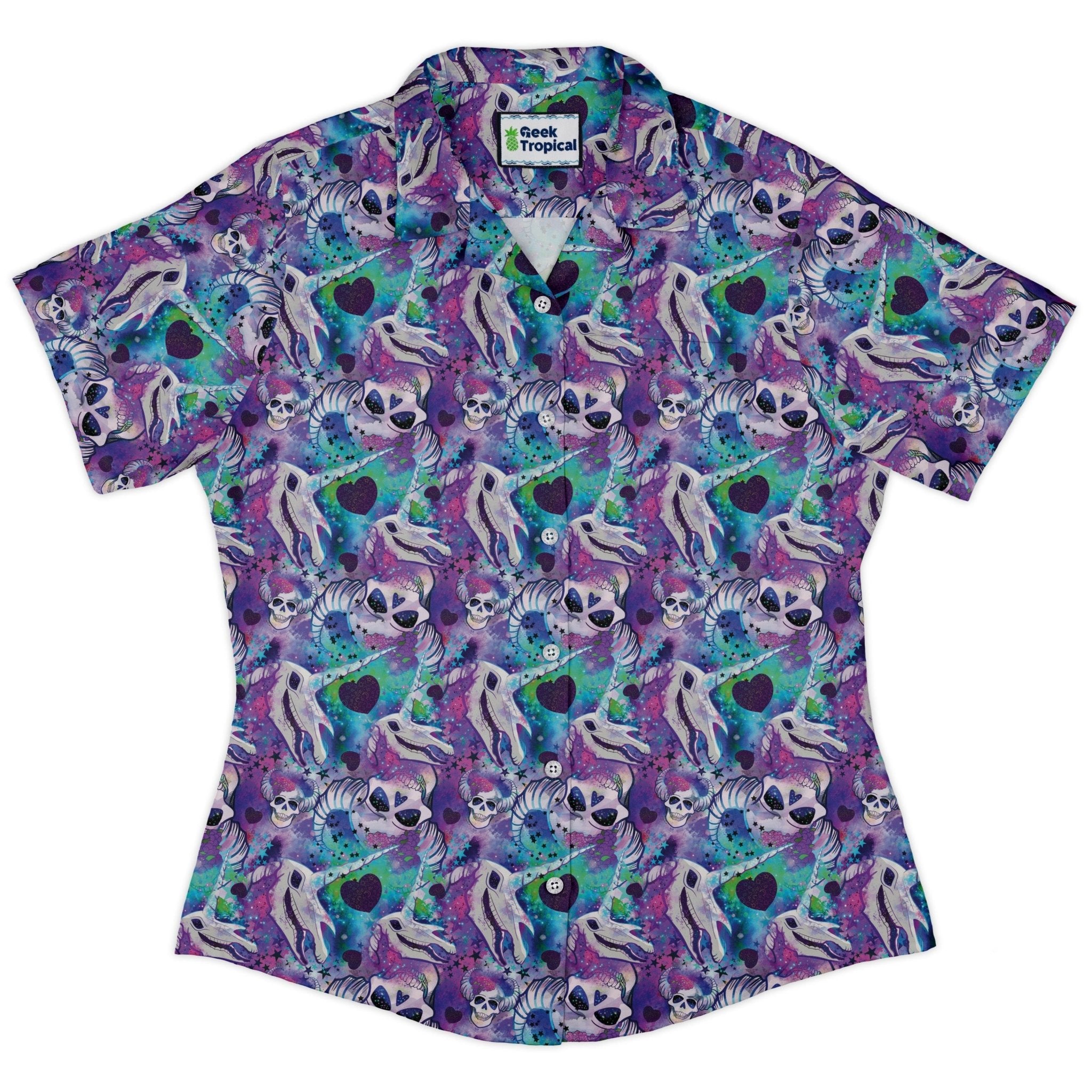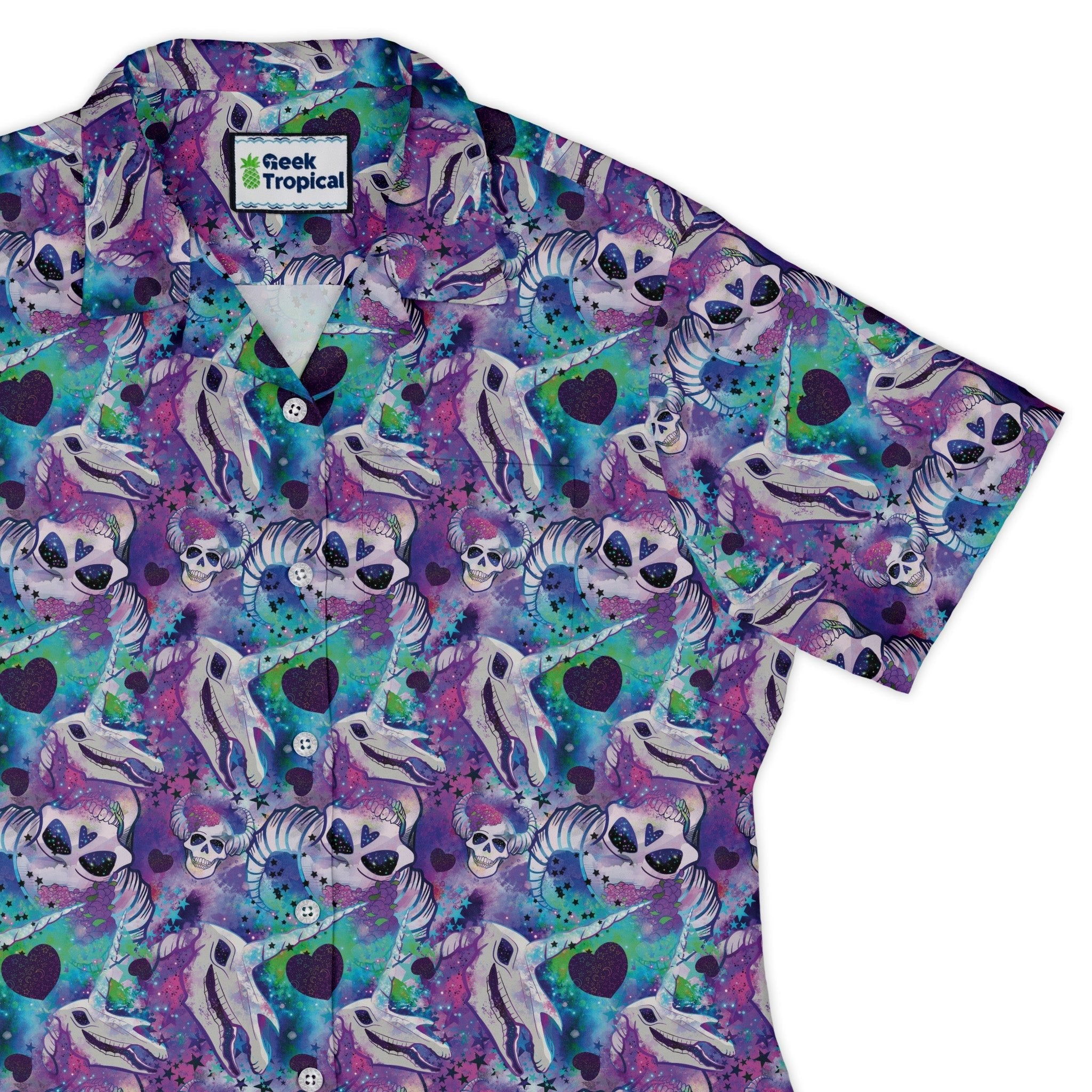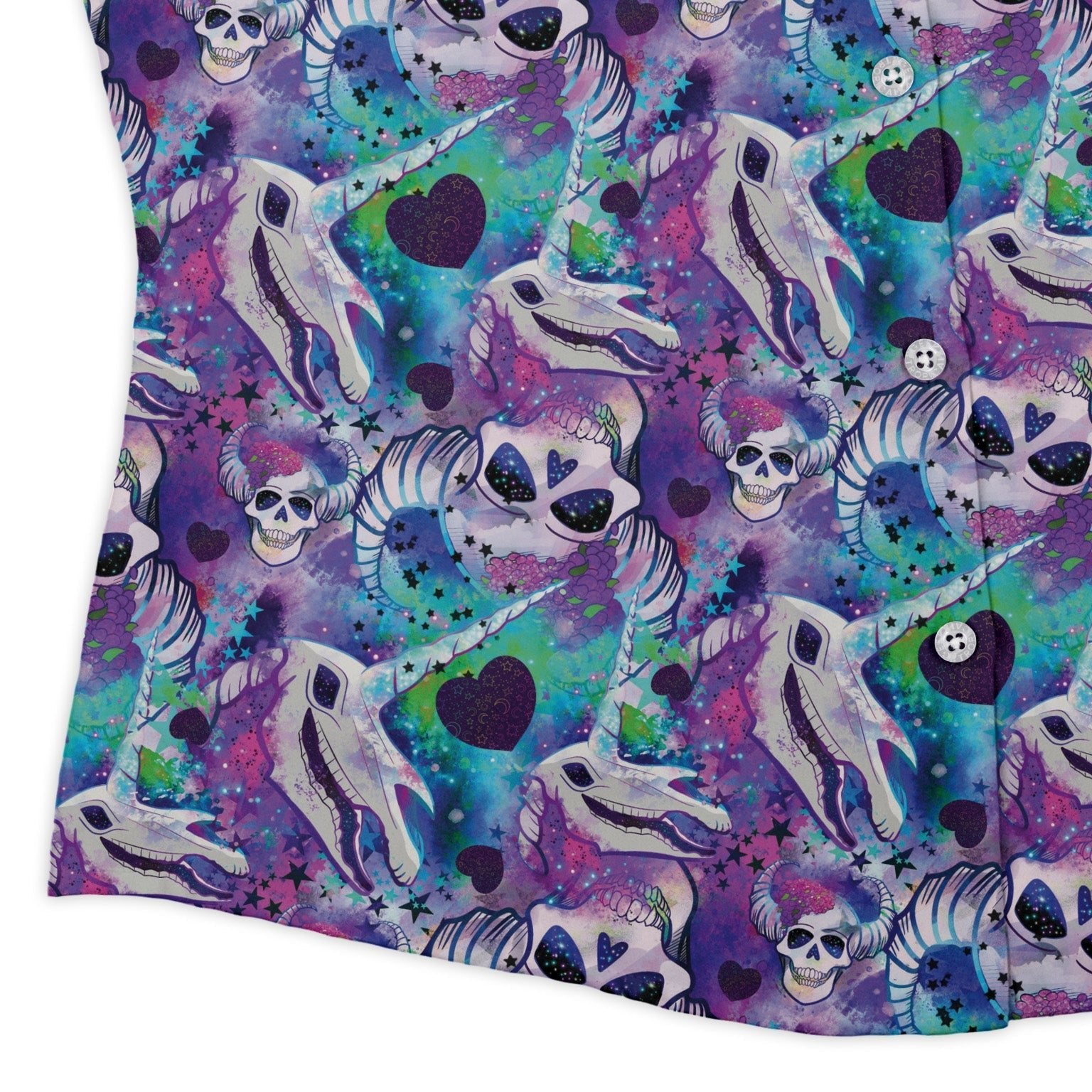 Meet the Magical Skulls Curvy Button Up Shirt, a spellcaster's take on everyday style. Designed by Rose Khan, it wraps you in an all-over parade of hand-drawn skulls with subtle mystic energy, aligned cleanly across the body and pocket for a cohesive print. Smartly tailored for curves, it balances edgy and polished, easy to wear tucked or not. Printed with eco-conscious inks and artist-backed, so your look powers up the community too.