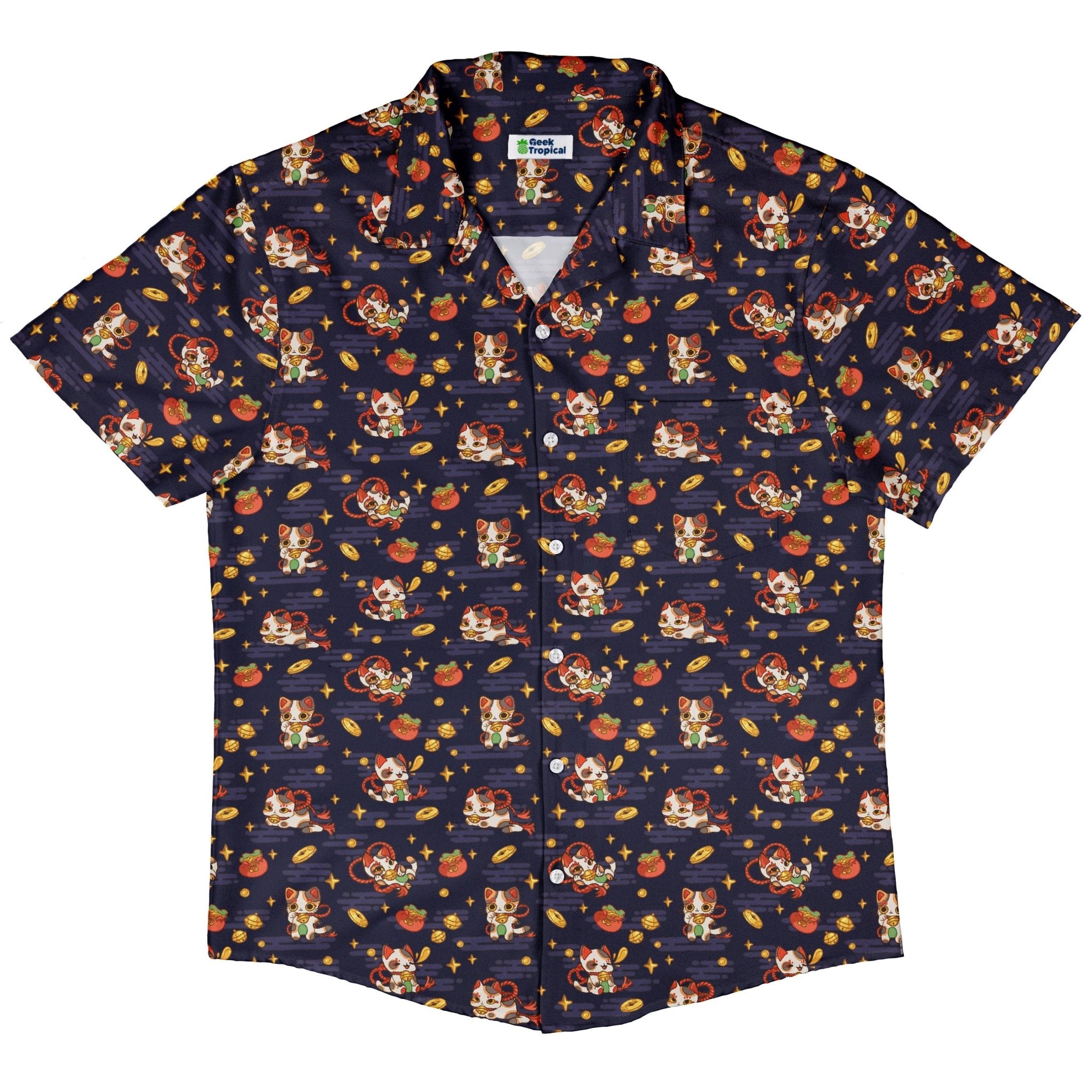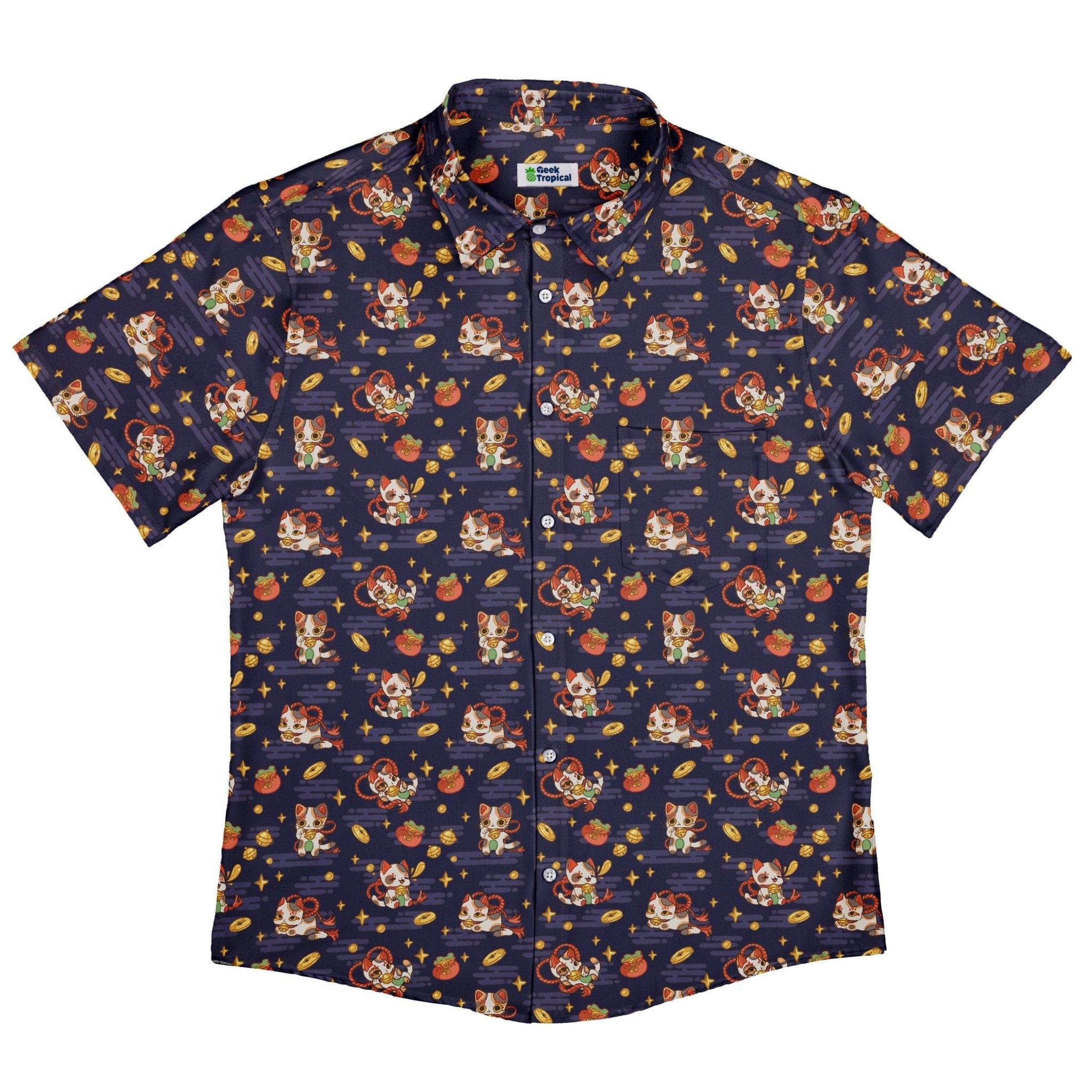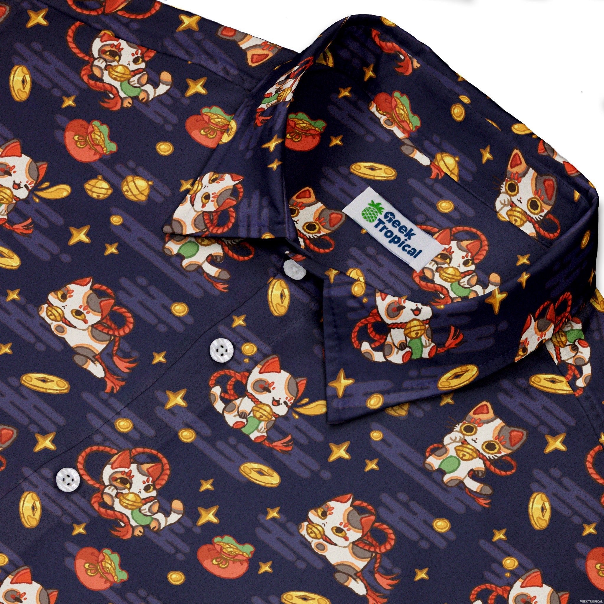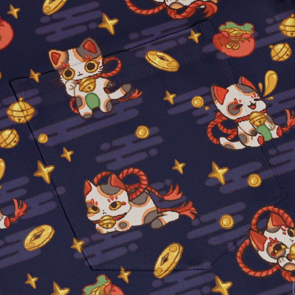 Maneki Cat Navy Button Up Shirt brings lucky-cat charm to your rotation with a deep navy ground and an all-over parade of beckoning felines. The print flows cleanly across the front and optional pocket for a crisp, collected look. Designed by Ardi Tong, this artist-backed piece blends anime energy with everyday polish. Soft on the skin and easy to wear from con to casual Friday, with eco-conscious artwork you can feel good about.