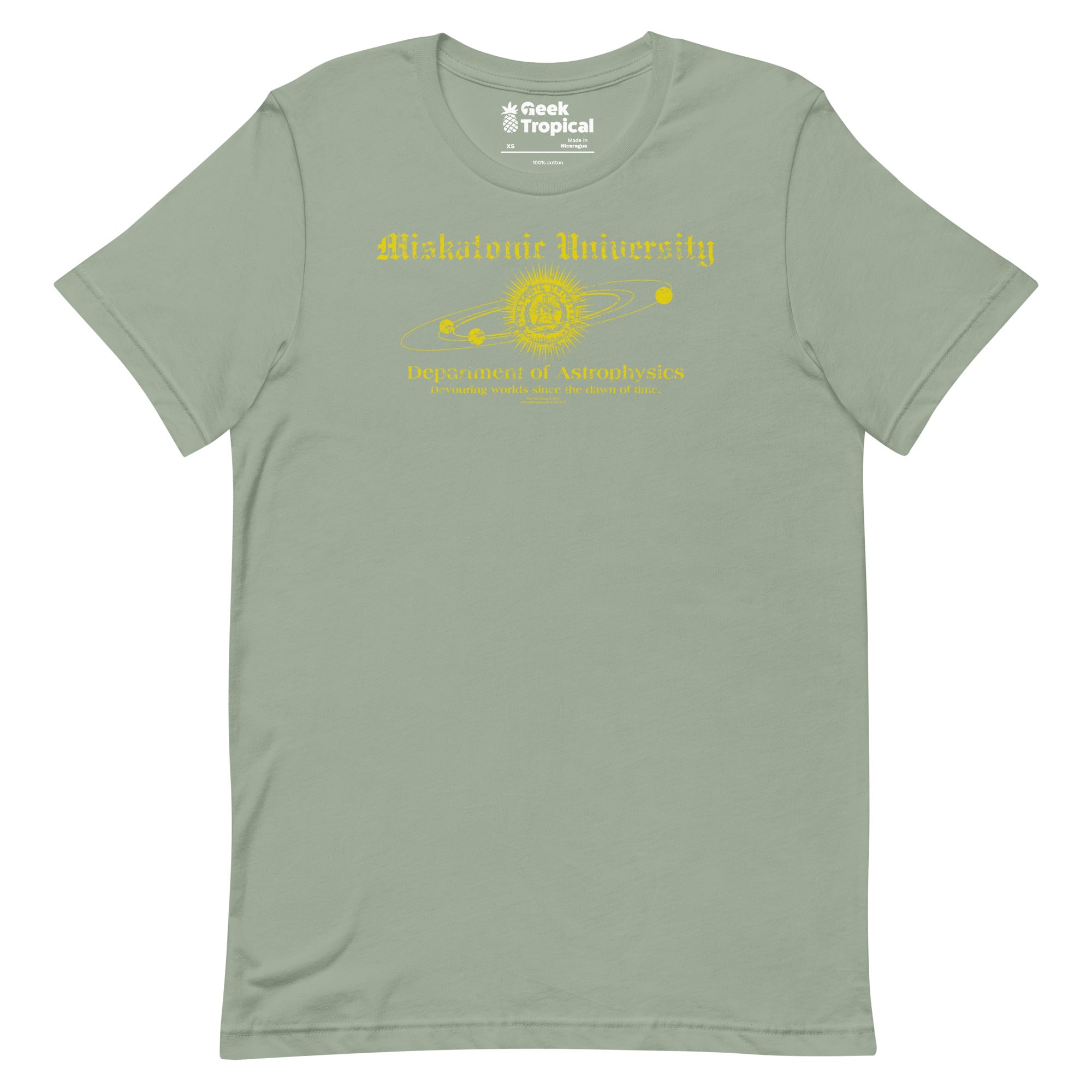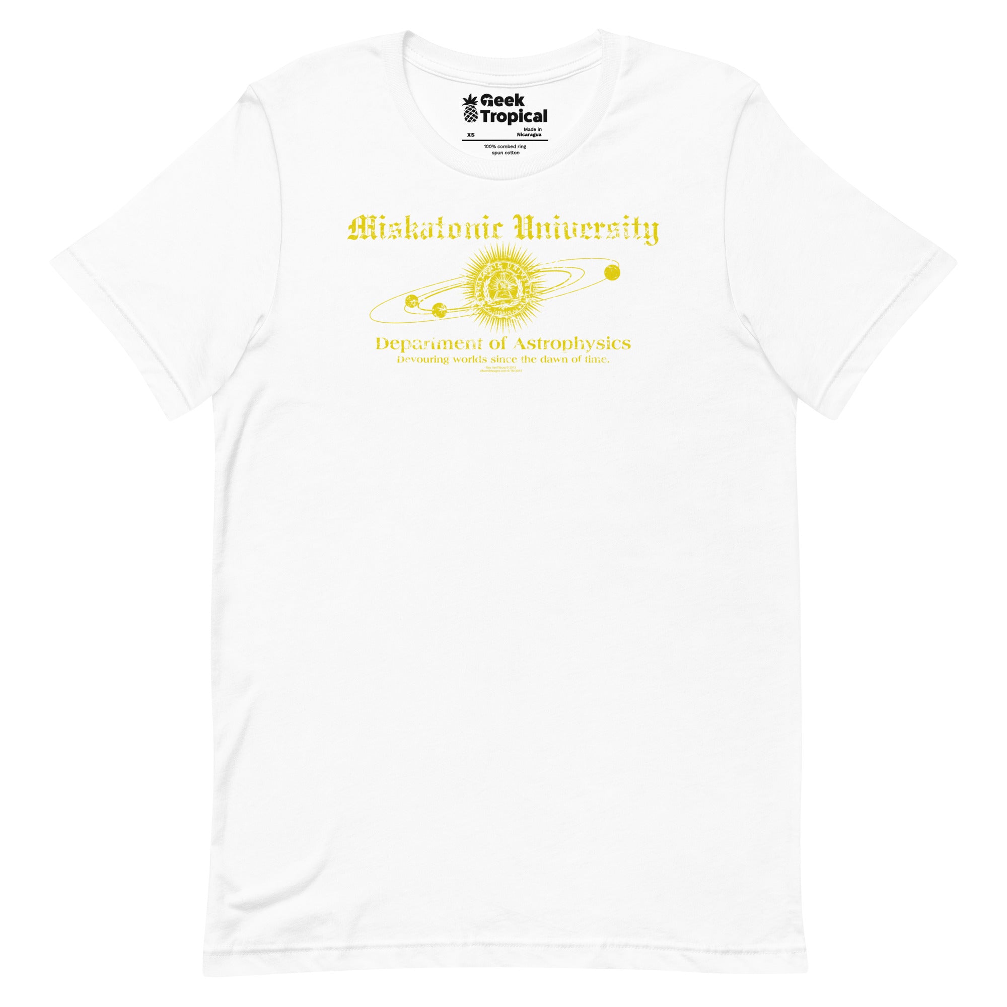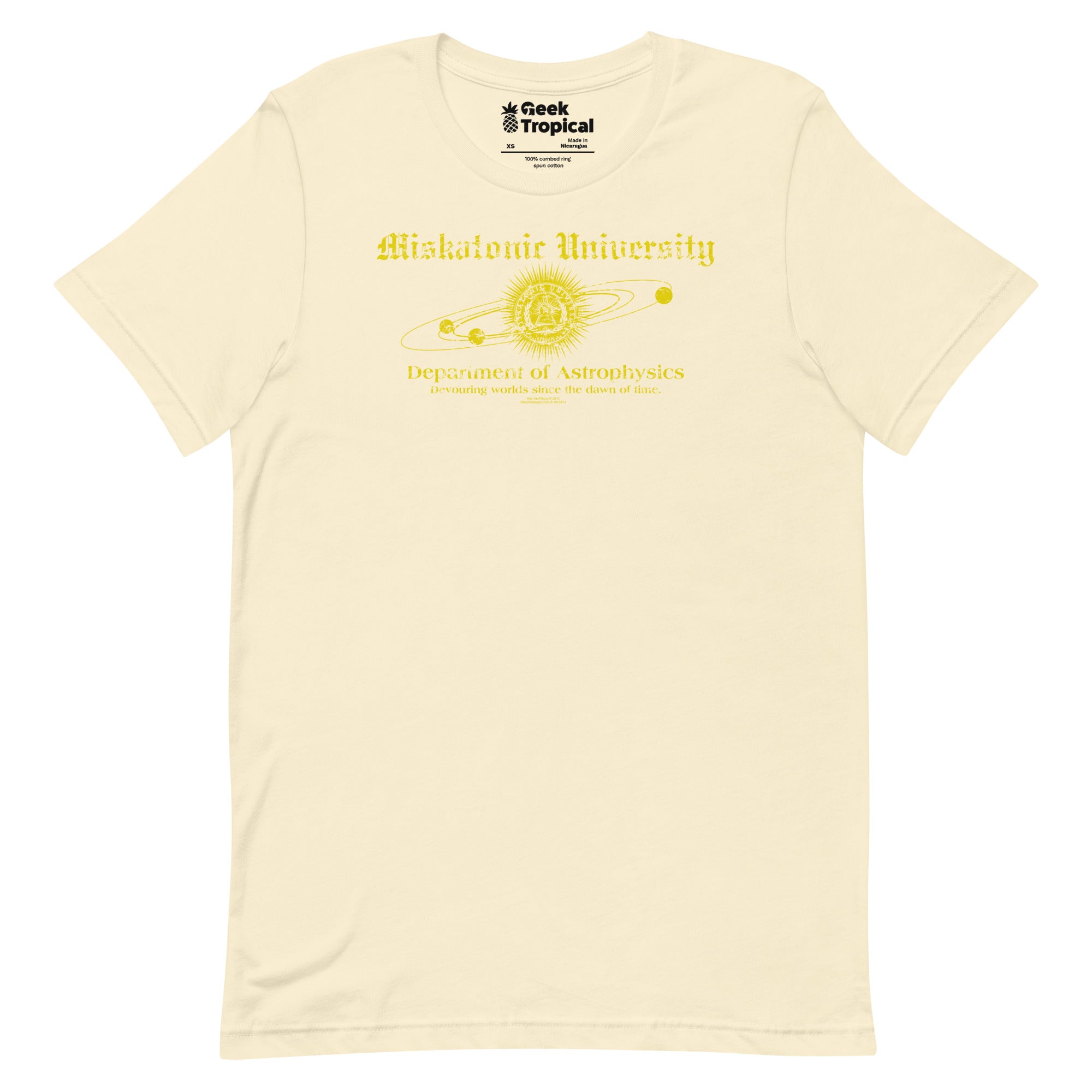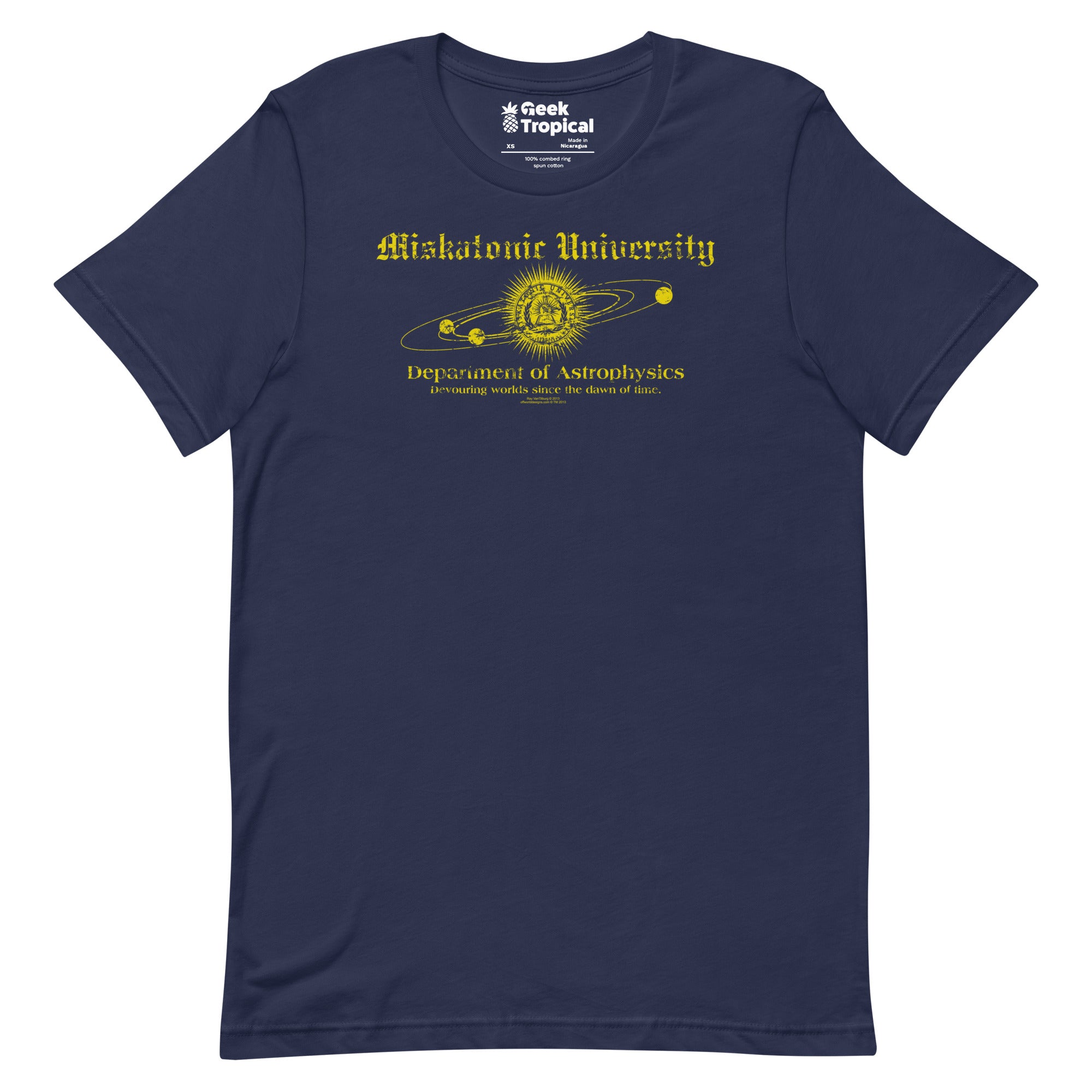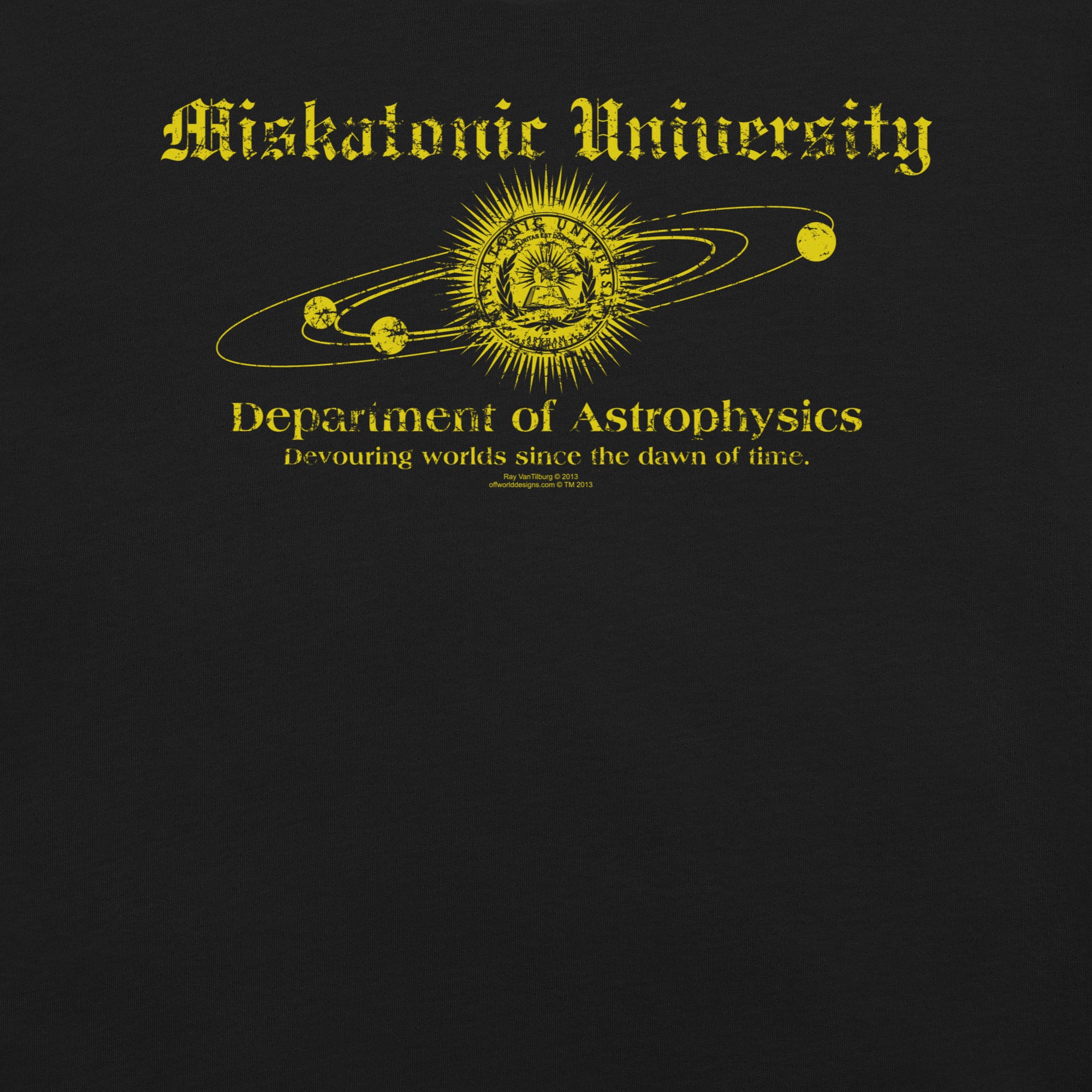 Enroll your wardrobe in forbidden sciences with the Miskatonic University Astrophysics T-Shirt. The graphic features collegiate lettering and an astrophysics emblem set against stars and orbital lines—lab-approved science with a hint of cosmic mystery. Clean linework pops with deep-space contrast, perfect for stargazers and lore nerds. Artist-backed by Off World Designs, with eco-conscious color that keeps the universe looking vivid wear after wear.