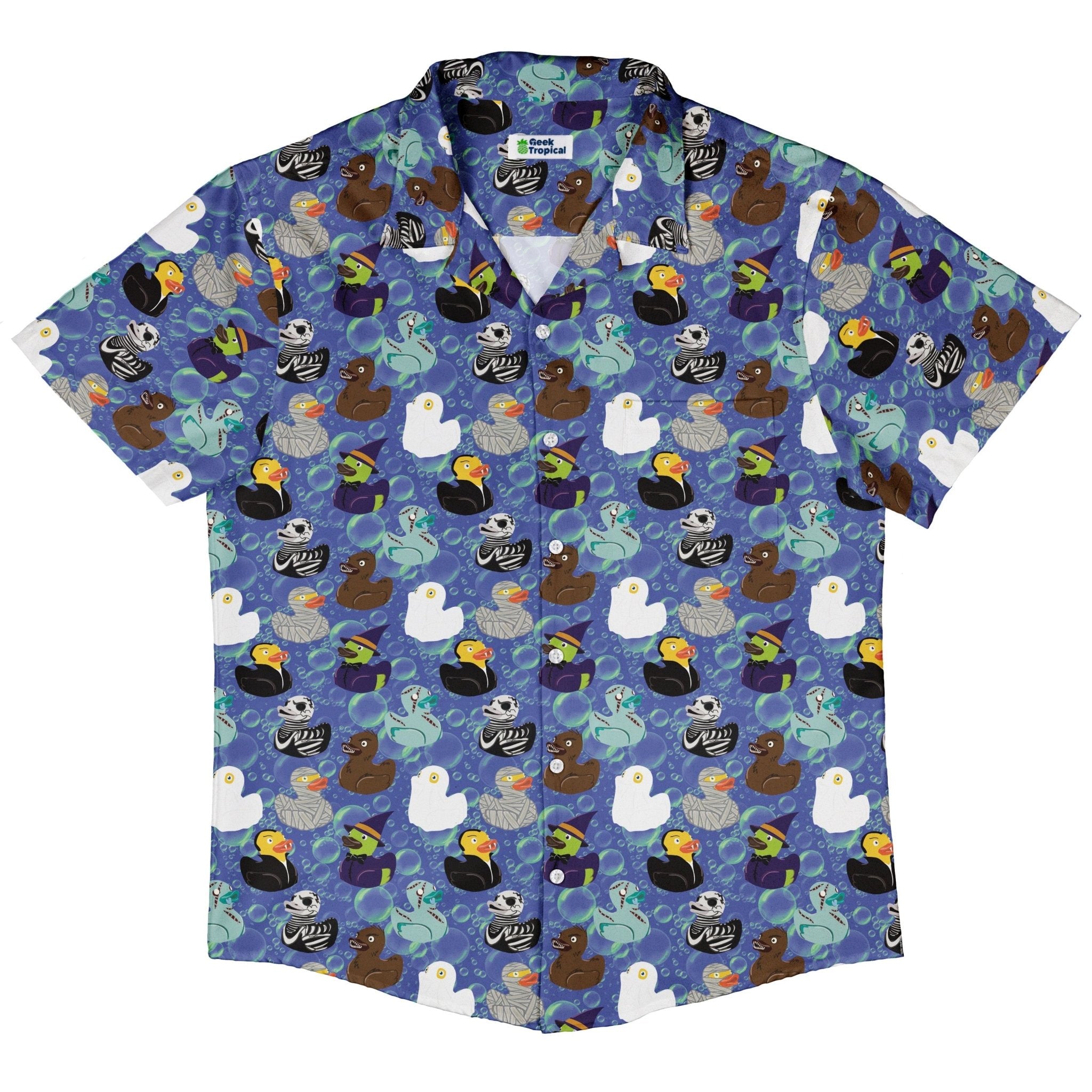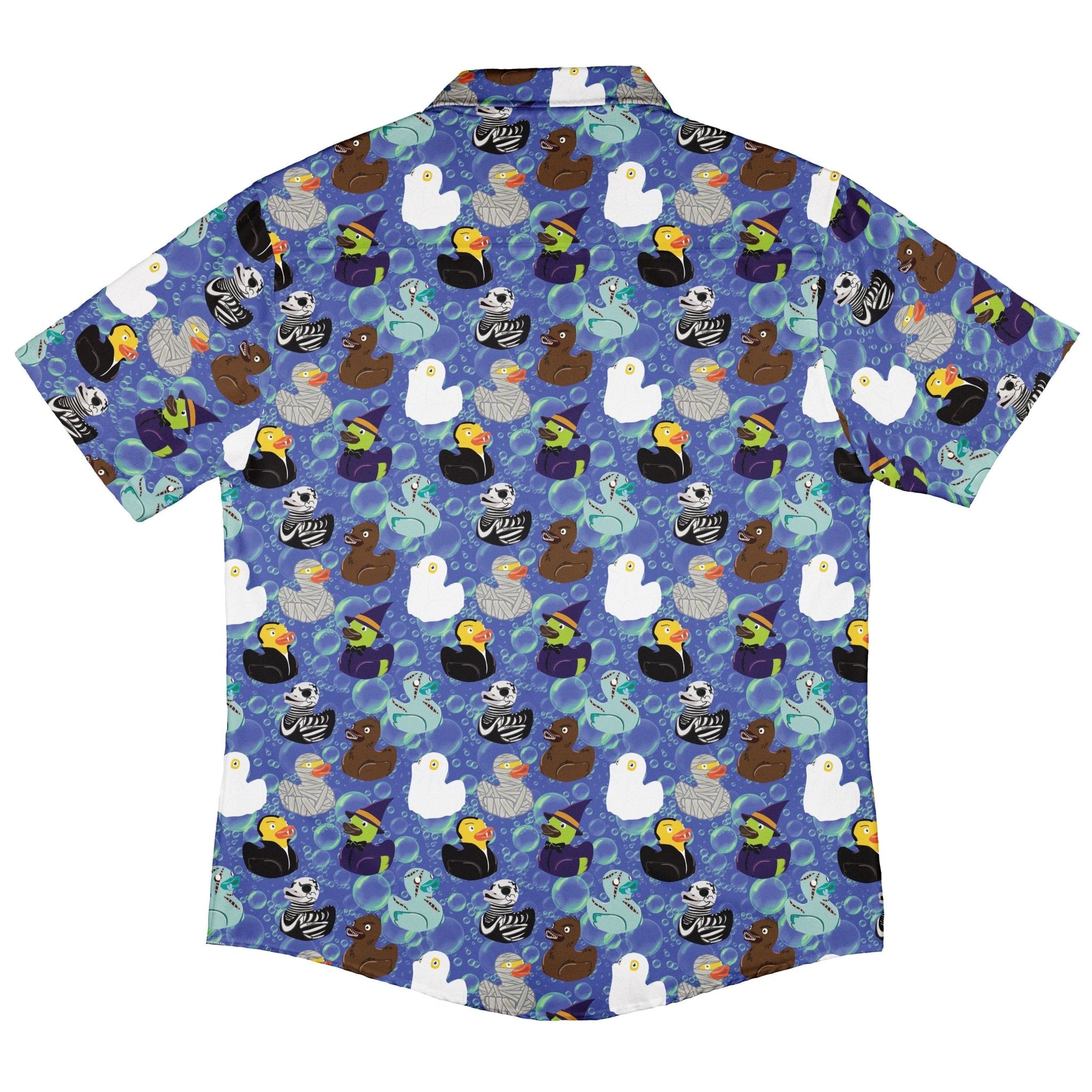 Make spooky season quack with the Monster Rubber Duckies Button Up Shirt. An all-over parade of rubber duckies in monster cosplay brings playful mischief and Halloween energy to your rotation. Designed by Nathan, this artist-backed favorite flexes geek cred without taking itself too seriously. Easy vibes and a print that pops at parties, the office, or your next con—just button up and let the ducks do the haunting.