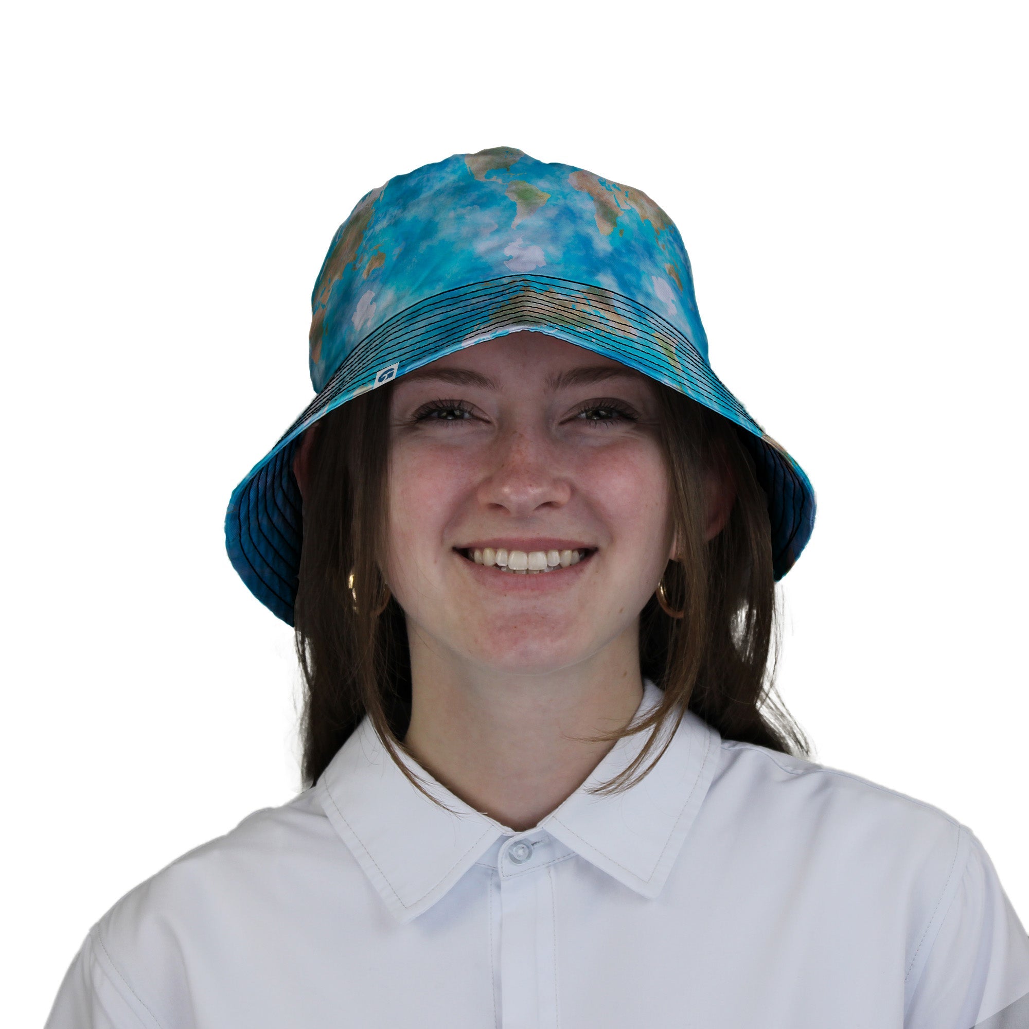 Mother Earth Bucket Hat is your cosmic go-to, featuring our home planet in vivid detail, an astronaut in orbit, and a starry expanse across the crown and brim. Designed by Nathan, it’s reversible with matching art on both sides, so the space vibes stay strong however you wear it. Artist-backed gear for geeks who care about Earth and love to look up.