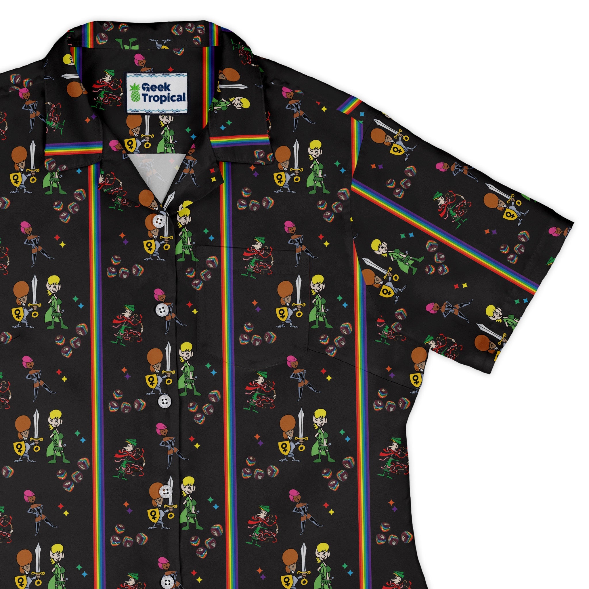 Meet the Munchkin Pride Curvy Button Up Shirt—our artist-backed ode to joyful self-expression, tailored for curves. An allover rainbow palette and playful micro art keep the vibes bright; the print lines up across the front and pocket for a seamless look. Soft, lightweight, and breathable with adjustable sleeves, it drapes cleanly worn untucked or layered. Premium buttons and eco-minded inks finish the piece with pride-worthy polish.