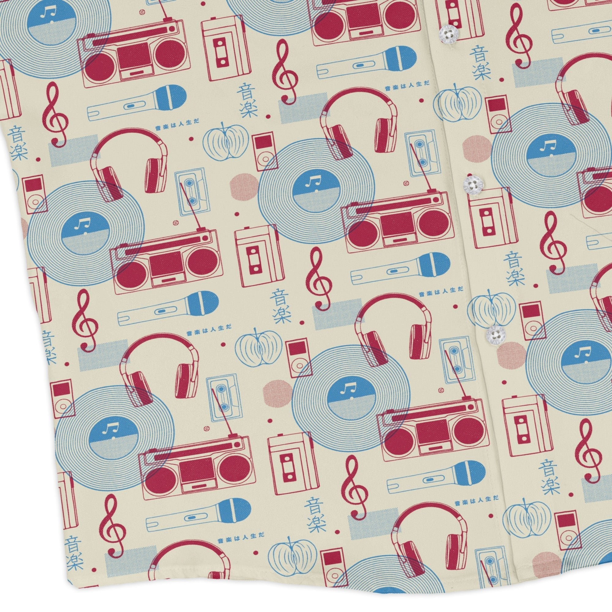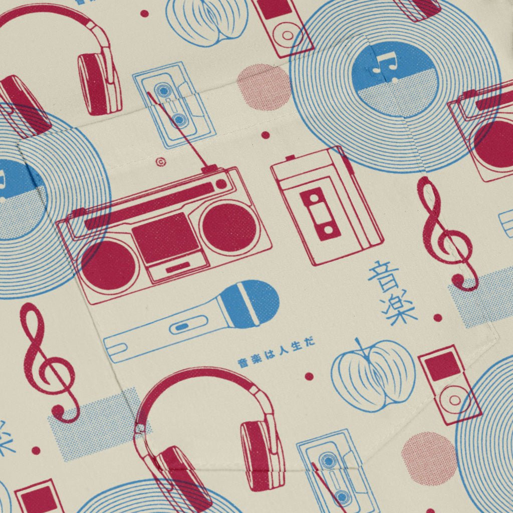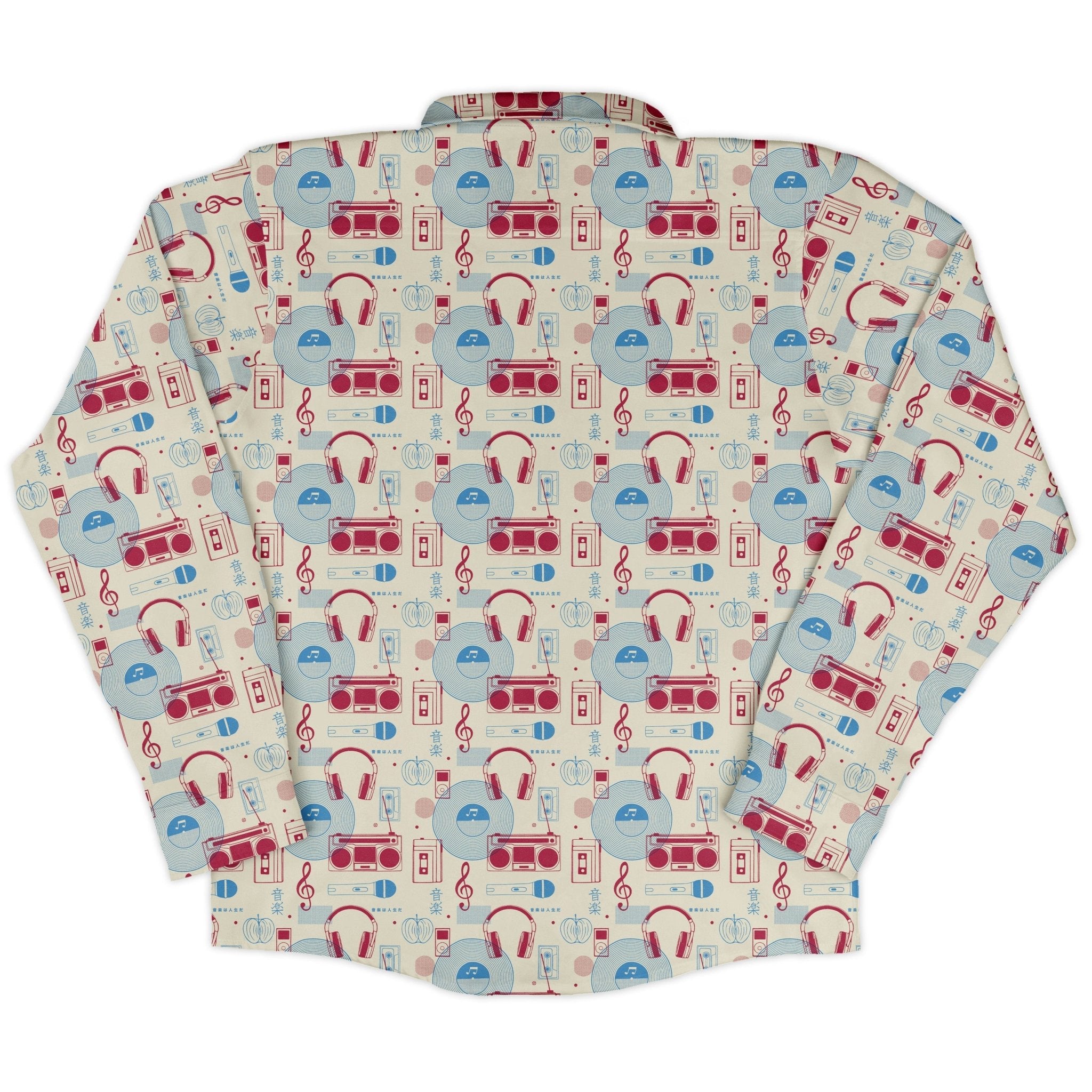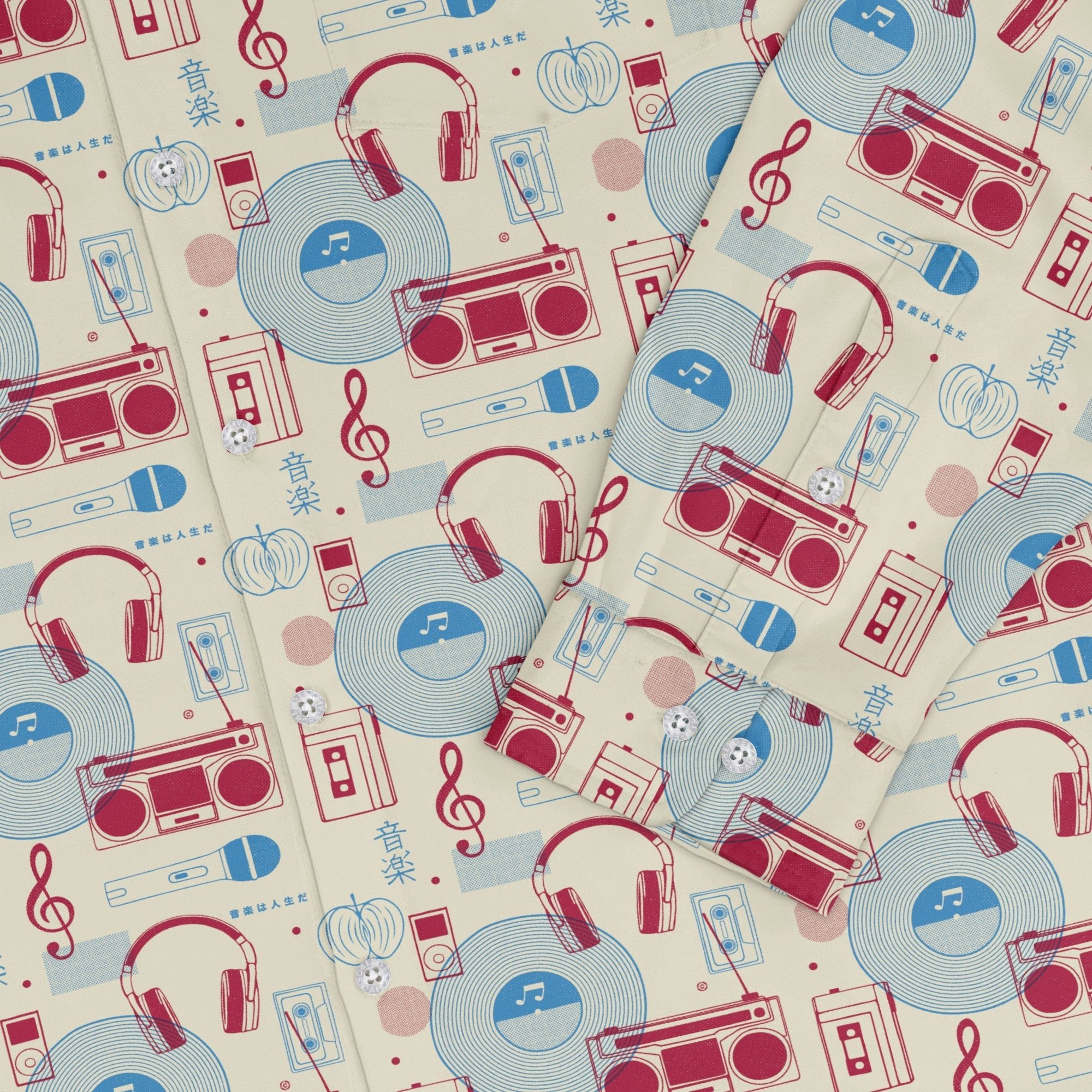 Dial in your style with the Music Paraphernalia Long Sleeve Button Up Shirt, built for audiophiles and gearheads alike. An all-over array of crisp music-themed line art creates a seamless pattern that lines up cleanly across the chest pocket and placket. Long sleeves, a crisp collar, and a laid-back unisex fit make it gig-ready or office-approved. Designed by Tobe Fonseca and printed with eco-conscious inks to support the artist and the planet.