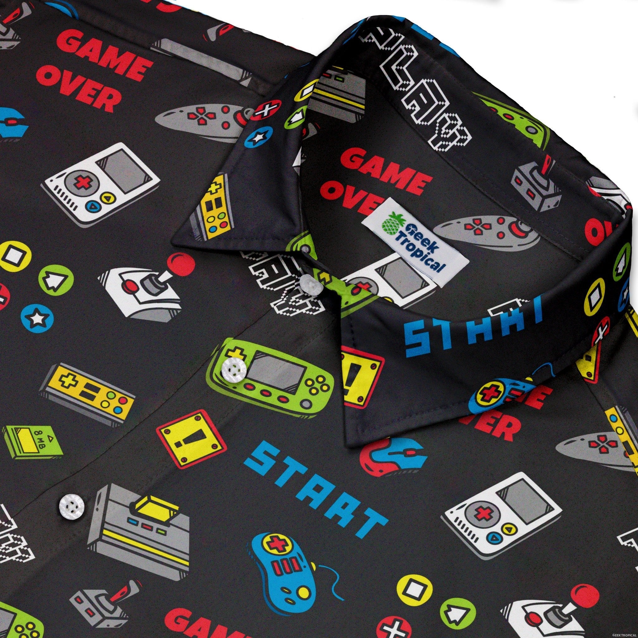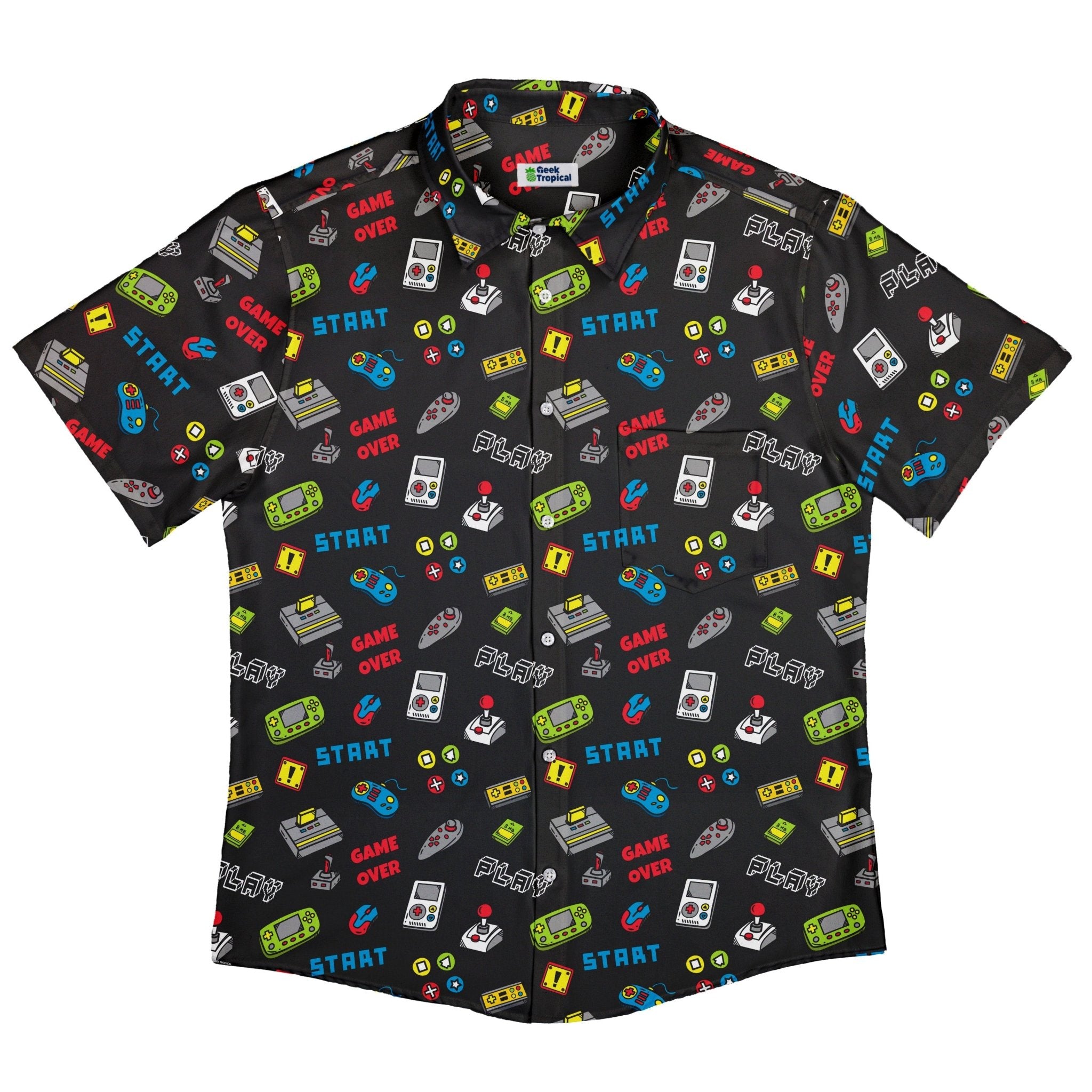 Level up your fit with the Video Gamer Black Video Game Button Up Shirt, a sleek black canvas covered in vibrant, retro arcade motifs. The all-over pattern lines up cleanly across the front for a satisfying, seamless look that reads polished from lobby to late-night grind. Soft, breathable, and made for long sessions, it channels playful geek energy in a modern silhouette—artist-backed style that lets your fandom do the talking.