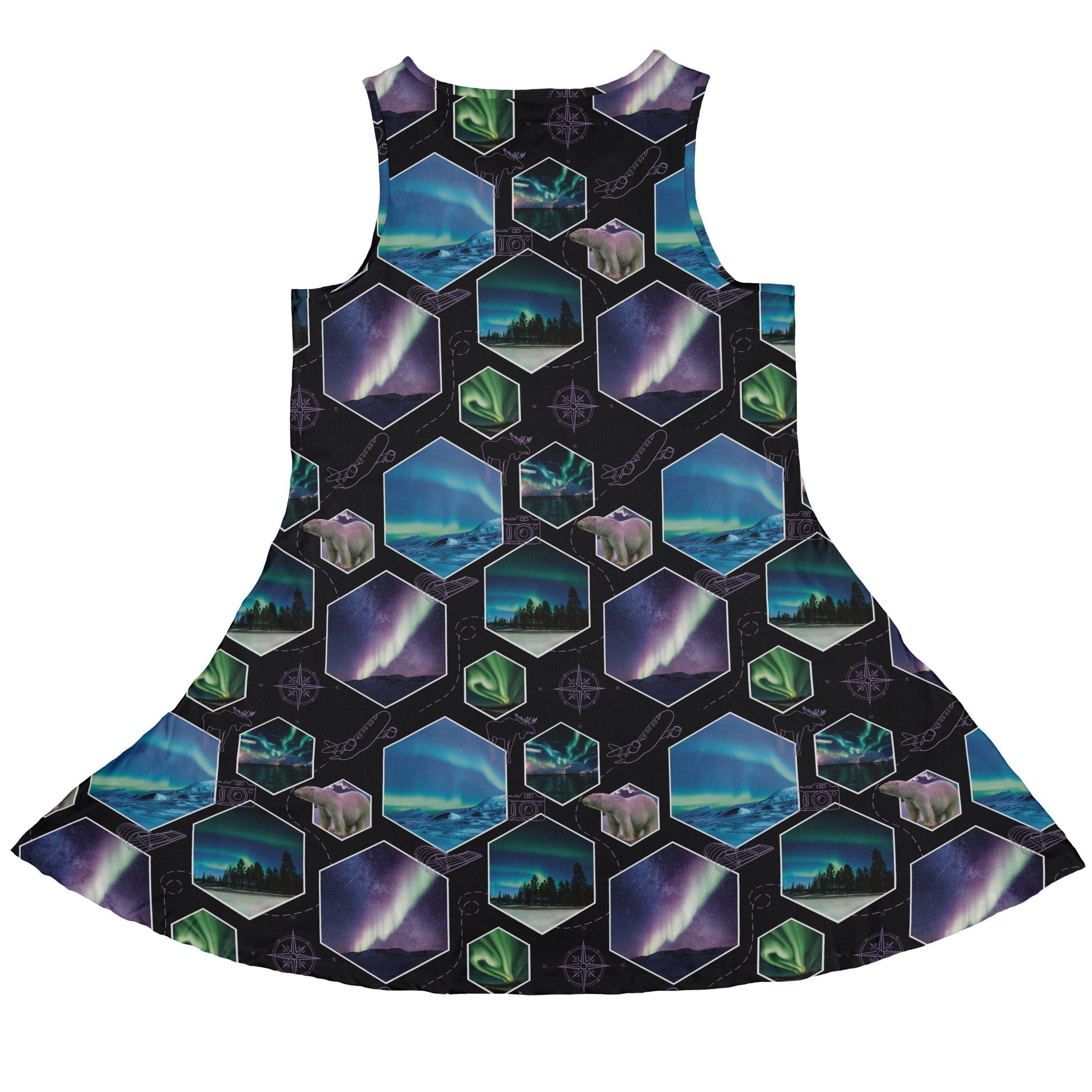 Meet the Northern Lights Wonder Dress, where night-sky drama meets everyday ease. Iridescent bands of teal, purple, and electric blue arc across a midnight field, like an aurora caught in motion—art by Nathan. The fit flows without clinging, the fabric stays opaque, and the side pockets hold actual essentials (yes, even a controller). Polished for the office, relaxed for quests and coffee, and every purchase backs a real artist.