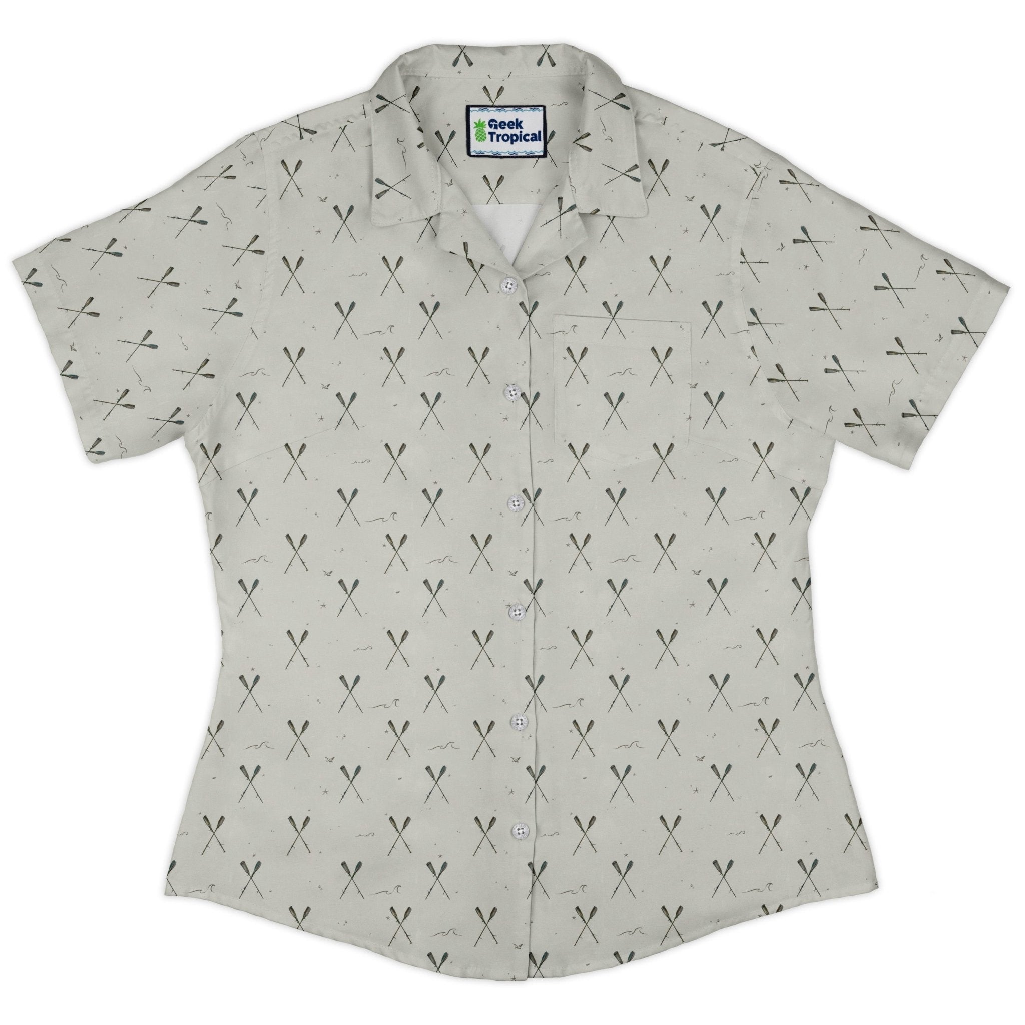 Oar Cross Curvy Button Up Shirt brings tidy nautical energy to your everyday geekery. Designed by Vlad Mel, its repeat of crossed oars forms a crisp, symmetrical grid, with the print aligning across the pocket for a satisfying, continuous flow. A curve-loving silhouette flatters, a rounded hem keeps it easy untucked, and adjustable sleeves shift from sleek to relaxed. Printed with eco-conscious inks, and your purchase supports the artist.