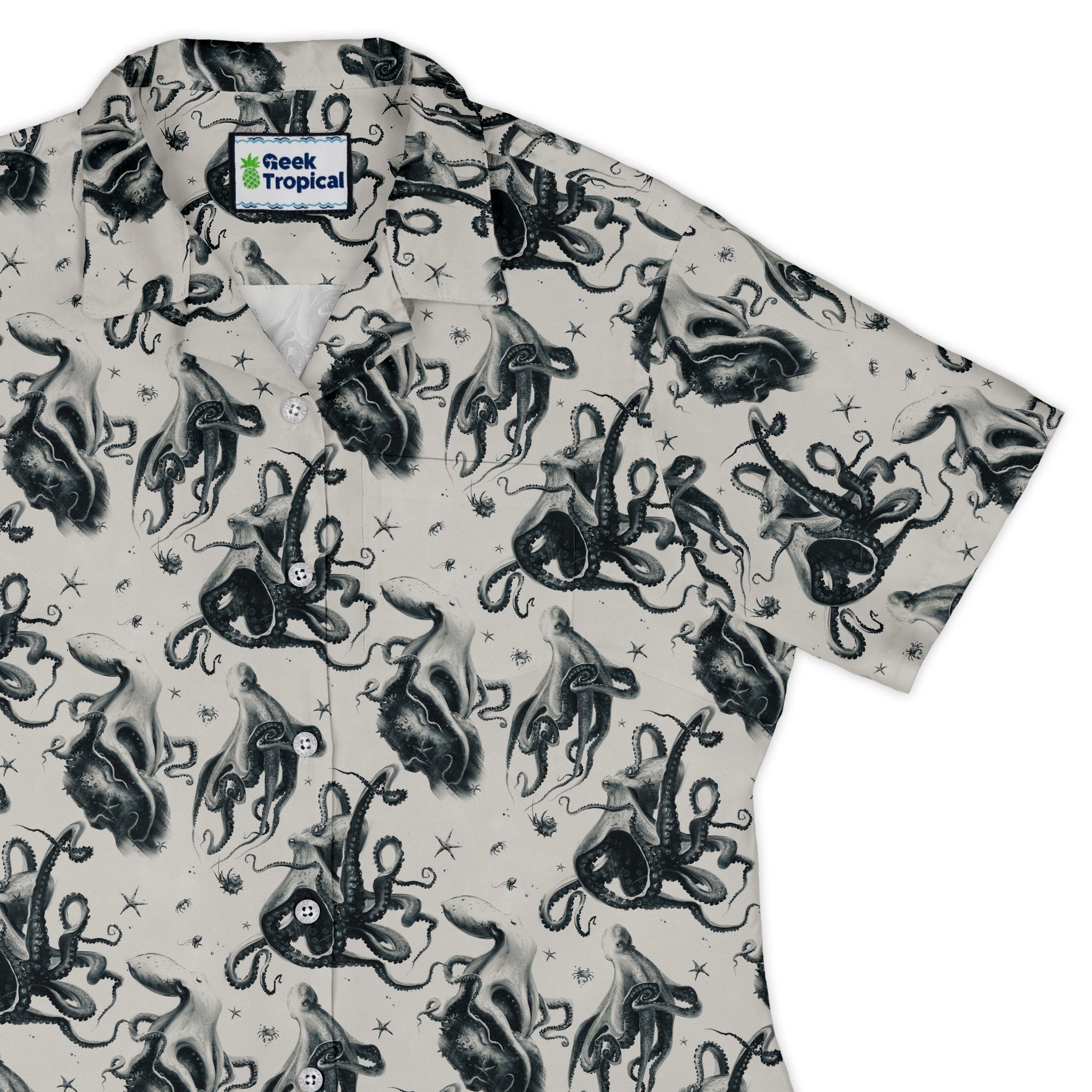 Octopus Crunch Curvy Button Up Shirt channels your marine-nerd heart into wearable art. Designed by Vlad Mel, swirling octopus forms and sucker-dotted tentacles flow across the chest and pocket for a seamless look. A curvy, polished cut stays flattering untucked, and roll-ready sleeves flex from lab days to late nights. Artist-backed, ocean-smart, and printed with eco-conscious inks for style that plays nice with the sea.