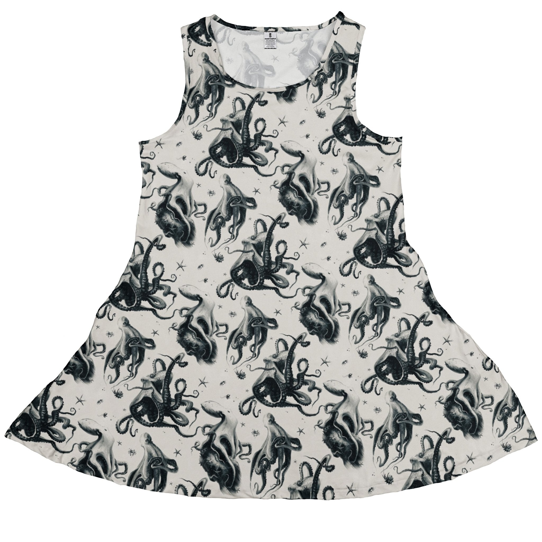 Meet the Octopus Crunch Dress, a cephalopod-powered statement for land‑dwelling ocean nerds. The front showcases a bold octopus illustration with intricate, curling tentacles, bringing marine-biology swagger to your everyday. Smooth, breathable stretch fabric drapes with confident, opaque coverage for an easy, polished look. Real side pockets actually fit a full gamepad. Designed by Vlad Mel—wearable art that supports the artist.