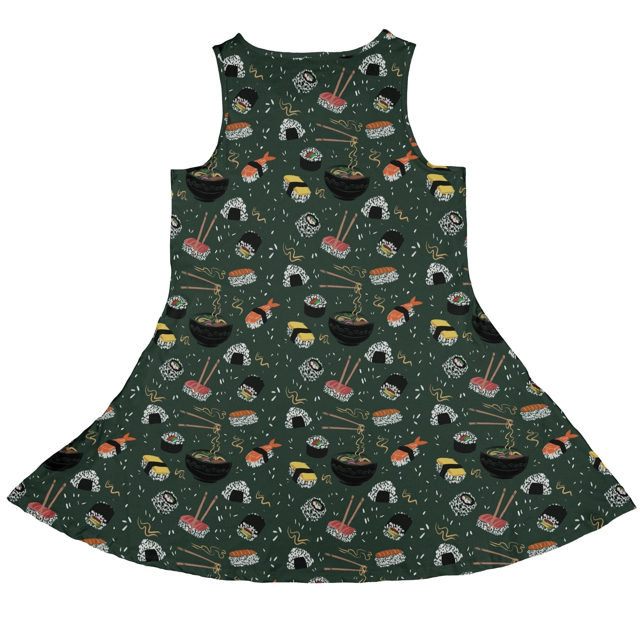 Oishi Sushi Green Dress plates up playful style with a crisp green canvas sprinkled in sushi motifs, artfully arranged for a bold yet easy vibe. Designed by Claire Murphy, it pairs geek charm with everyday polish, moving effortlessly from con to coffee run. The print pops without shouting, and the silhouette keeps things breezy and confident—artist-backed, feel-good fashion that’s ready to roll.