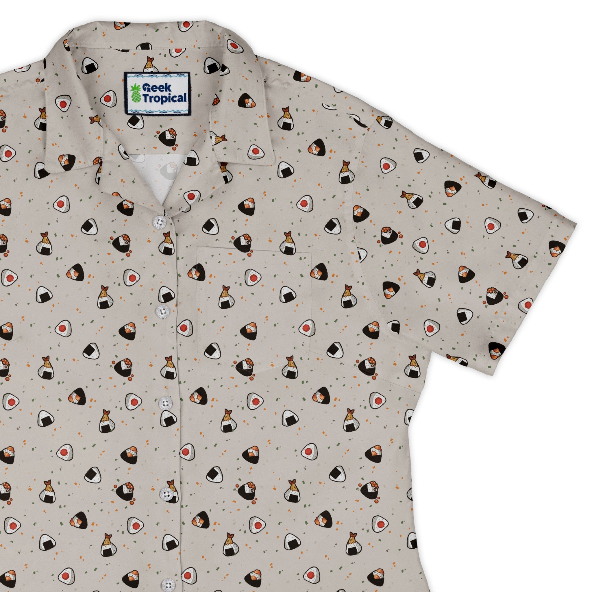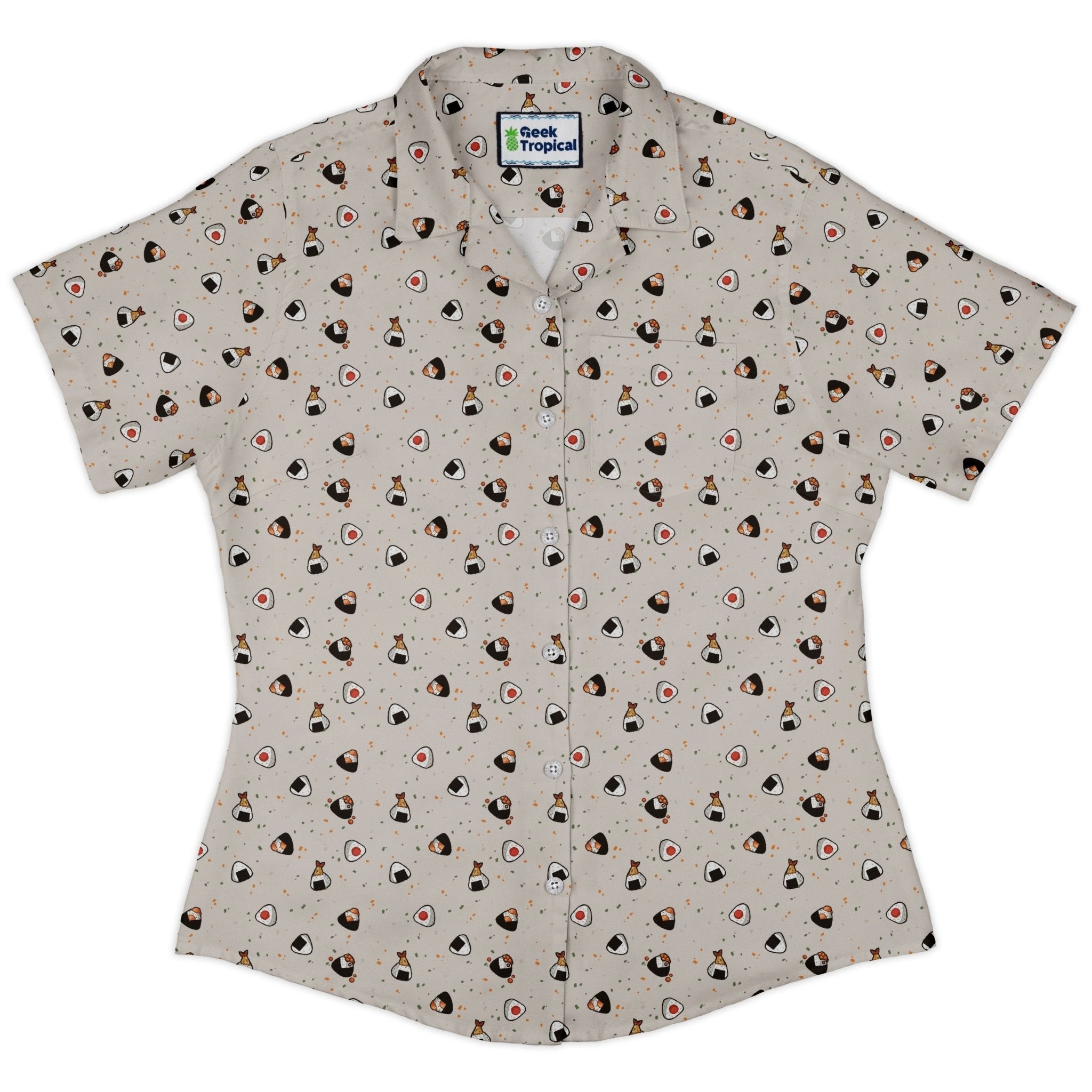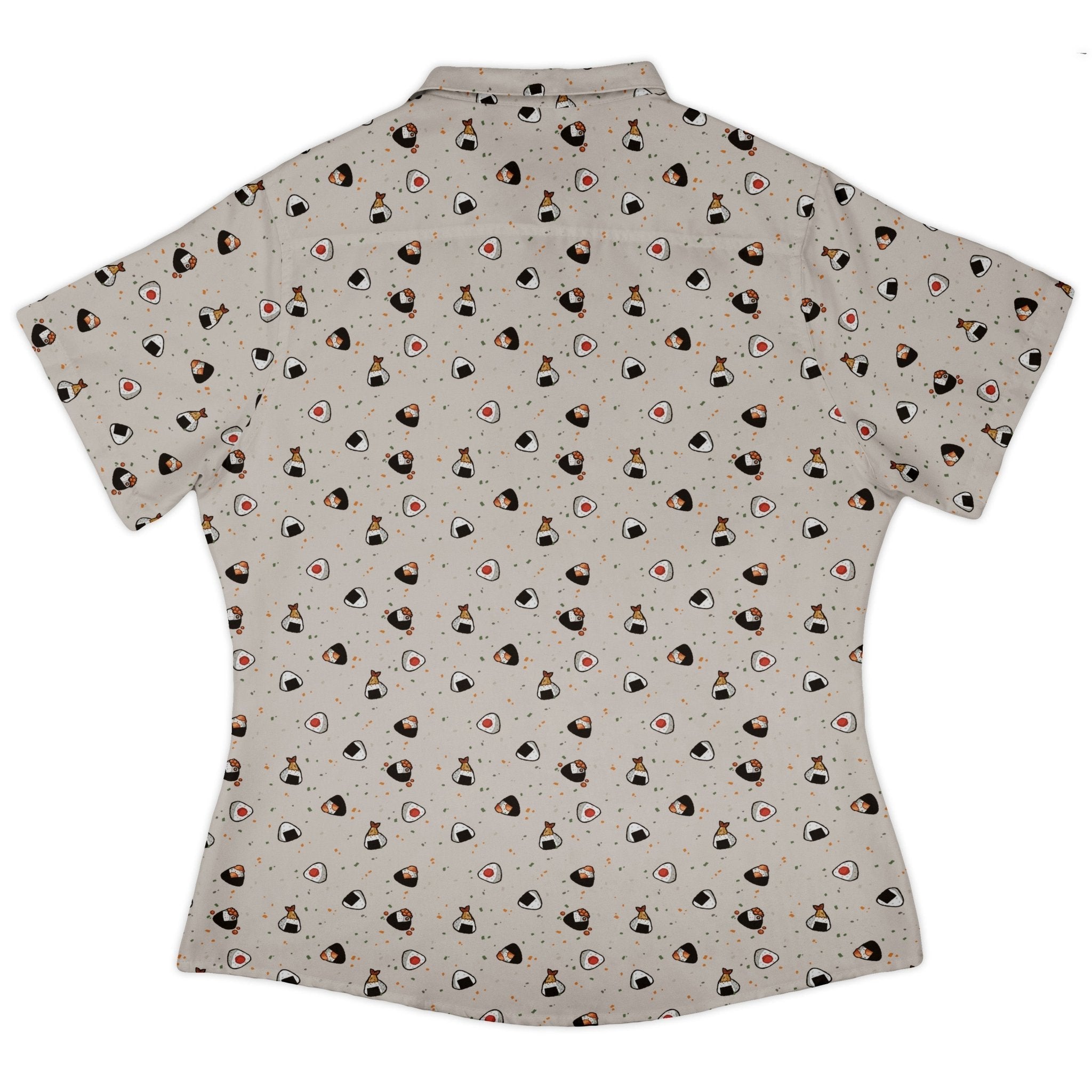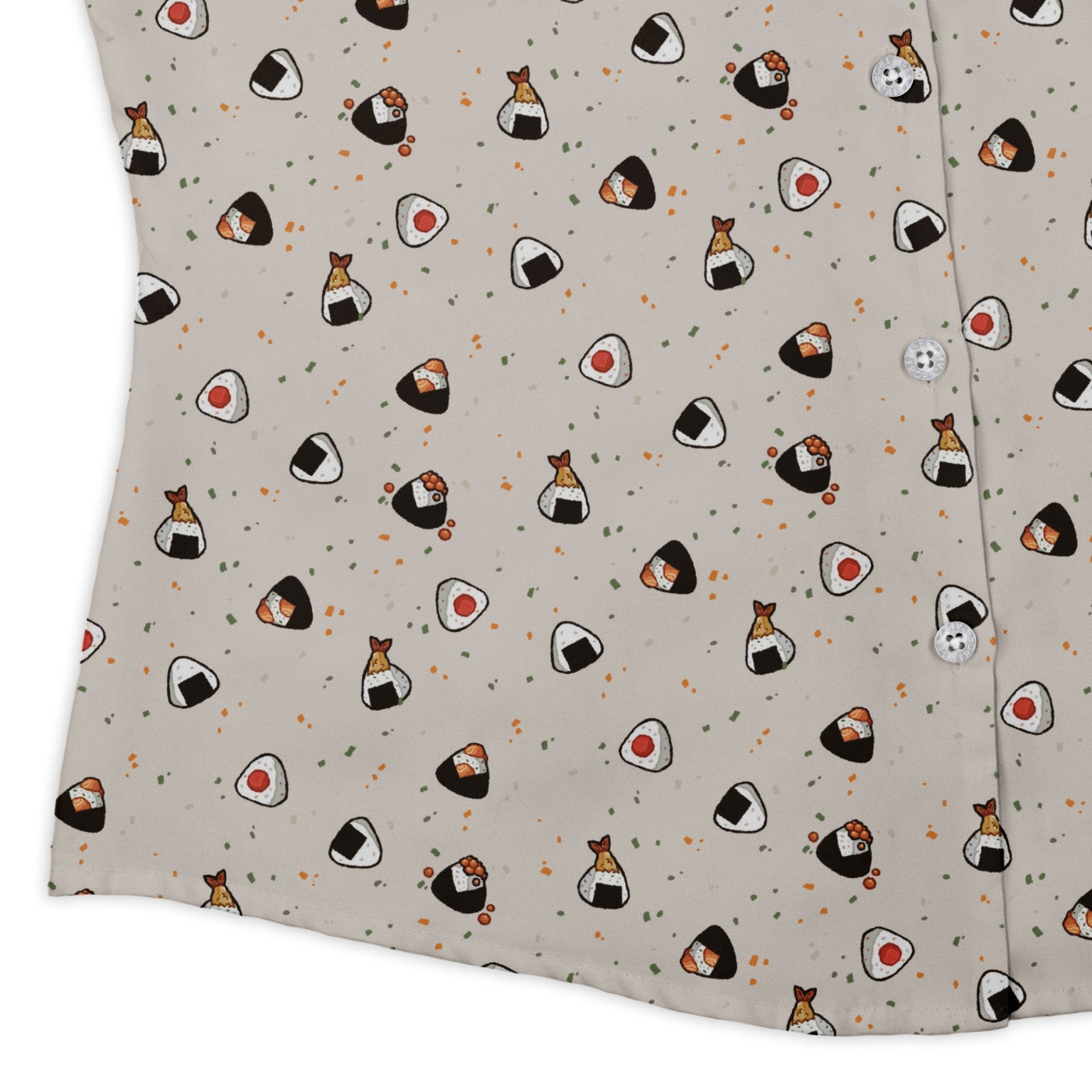 Meet the Onigiri Biege Curvy Button Up Shirt, a snack-forward statement for your everyday rotation. A warm beige canvas is dotted with onigiri rice balls wrapped in nori, and the print flows cleanly across the chest pocket for a seamless, geeky finish. Shaped to flatter with an easy untucked drape and adjustable sleeves that go from crisp to relaxed. Designed by Ardi Tong, printed with eco-conscious inks, and proudly supporting licensed artists.