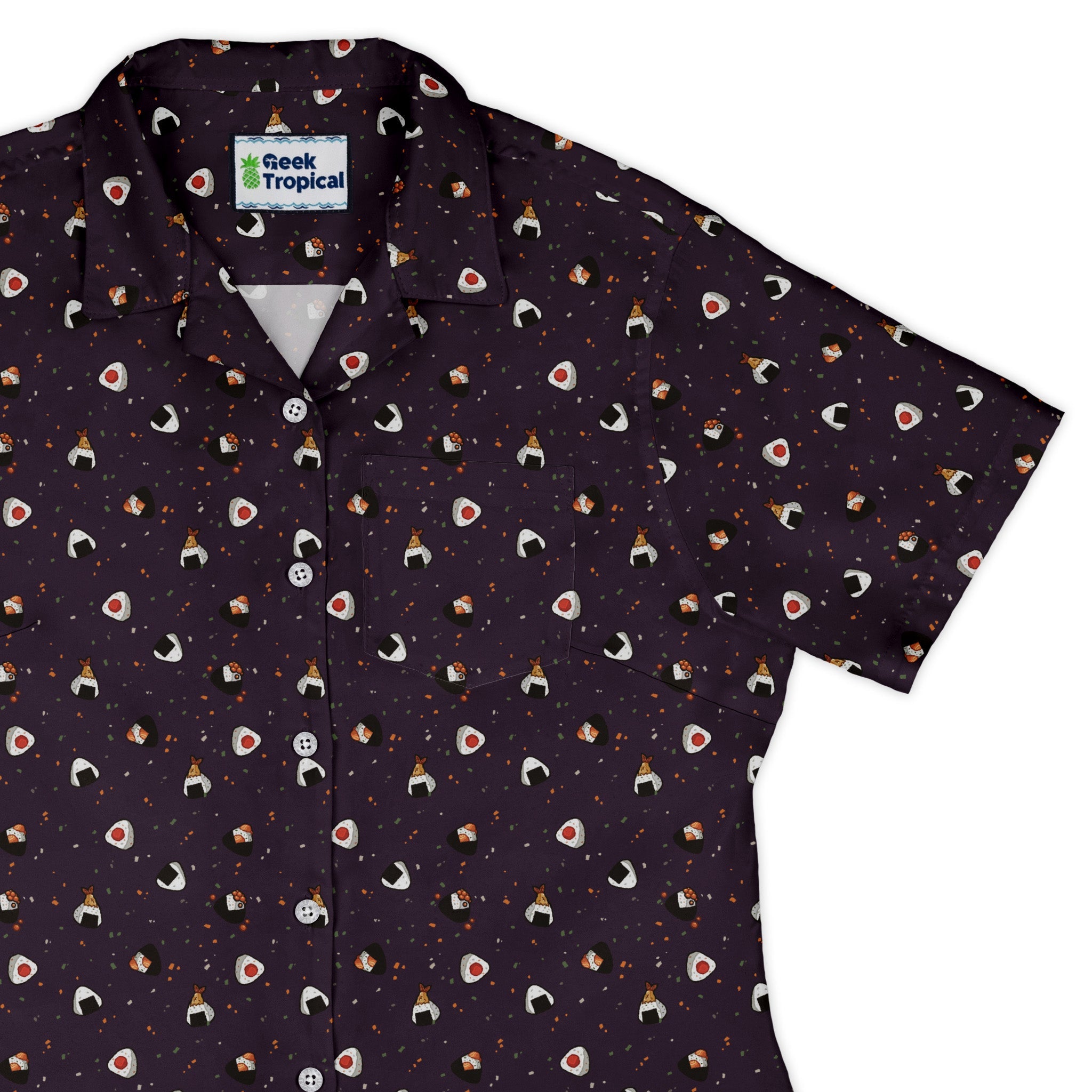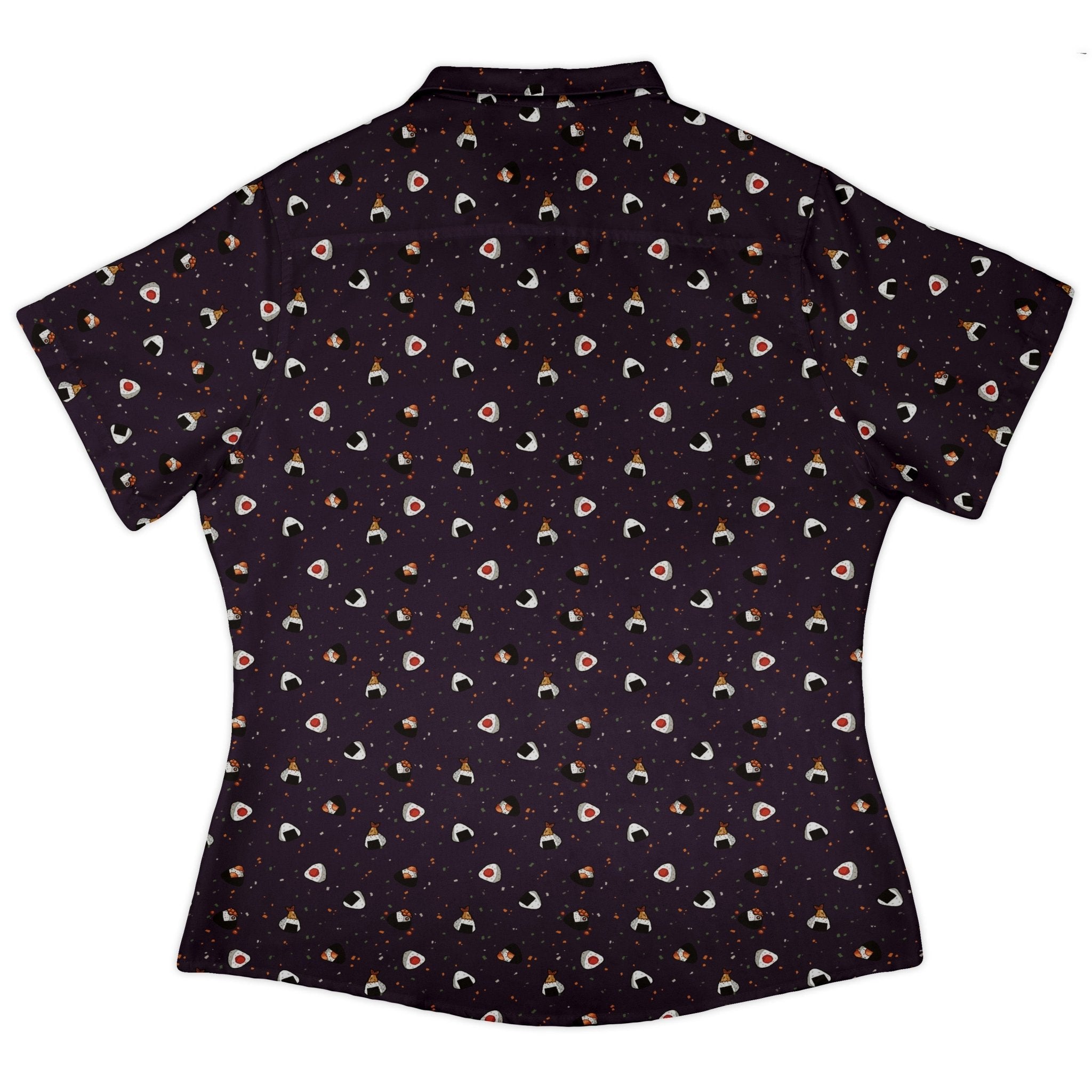 Onigiri Dark Curvy Button Up Shirt pairs snack-core fandom with a flattering, curvy silhouette. A dark base sets off a playful scatter of onigiri rice balls with nori wraps, with the print flowing cleanly across the chest pocket for that seamless, polished vibe. Soft and breathable for day-to-night wear, with roll-friendly sleeves and crisp branded buttons. Designed by Ardi Tong and printed with eco-conscious inks to support licensed artists.