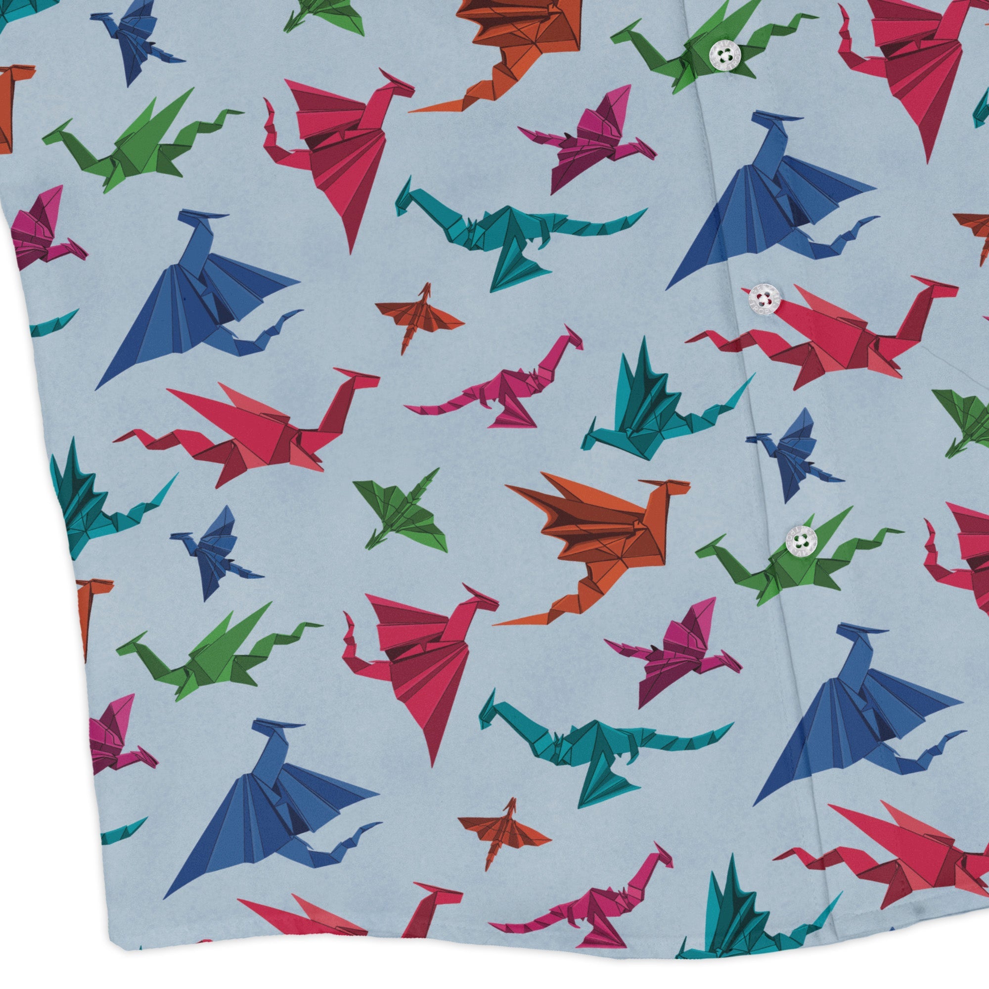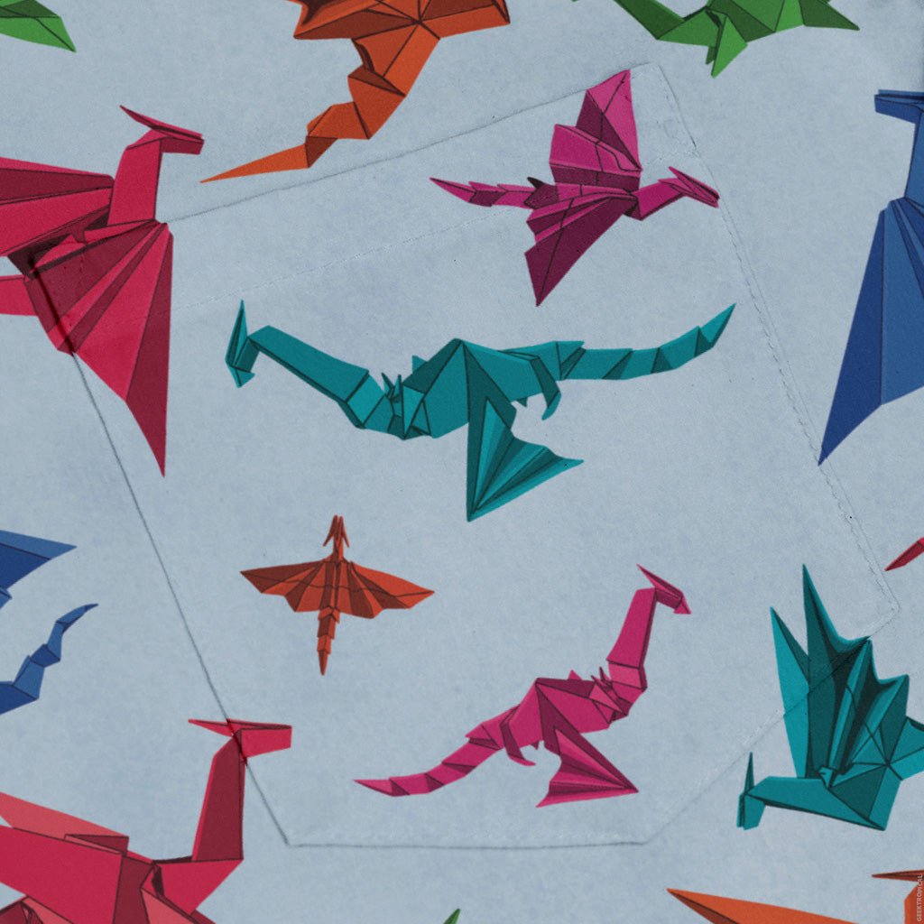 Meet the Origami Dragons Light Long Sleeve Button Up Shirt, where paper‑fold fantasy takes flight on a clean canvas. Geometric dragons glide in tidy formation, their crisp linework giving the print a modern, low‑key mythic vibe. The pattern lines up across the chest pocket for a seamless look. Designed by Nathan and printed with eco‑conscious inks, it elevates workdays and weekends.